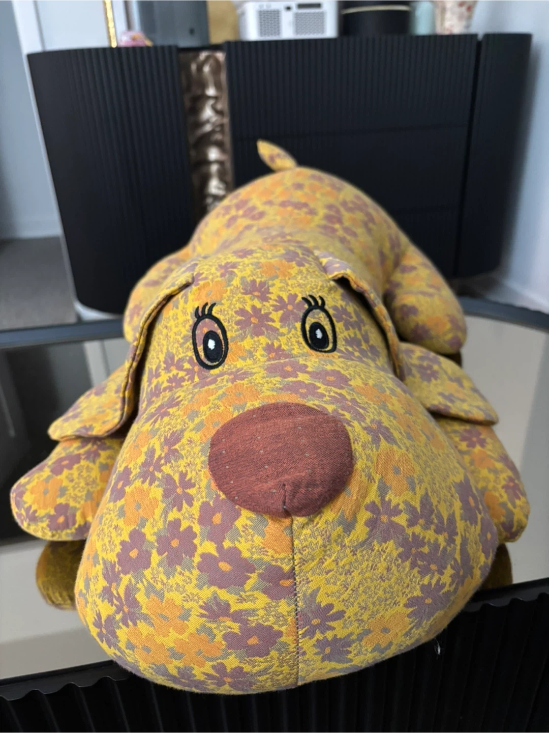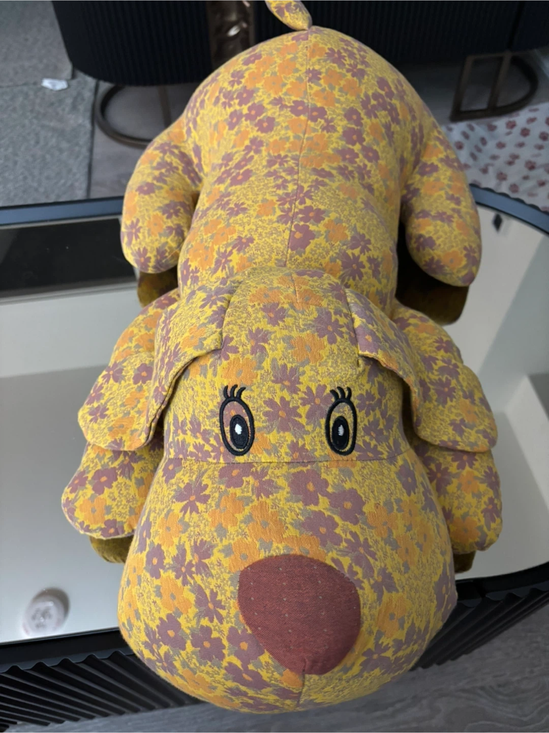 This is a plush dog toy with a cheerful yellow and floral pattern. It has big, friendly eyes and a brown nose. It's soft and huggable. A nice companion for playtime!