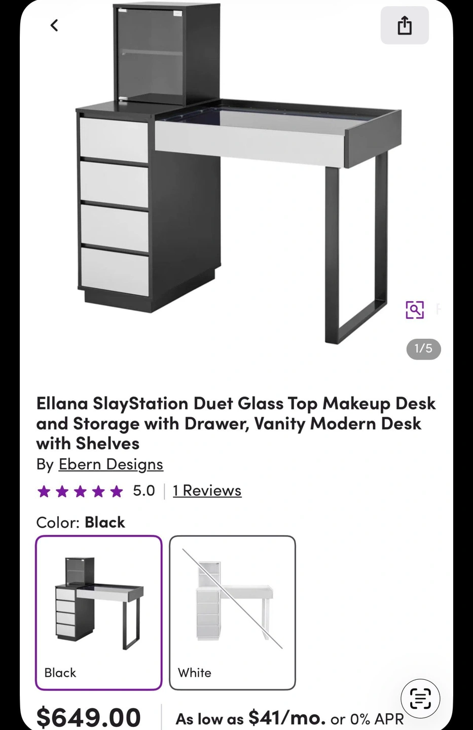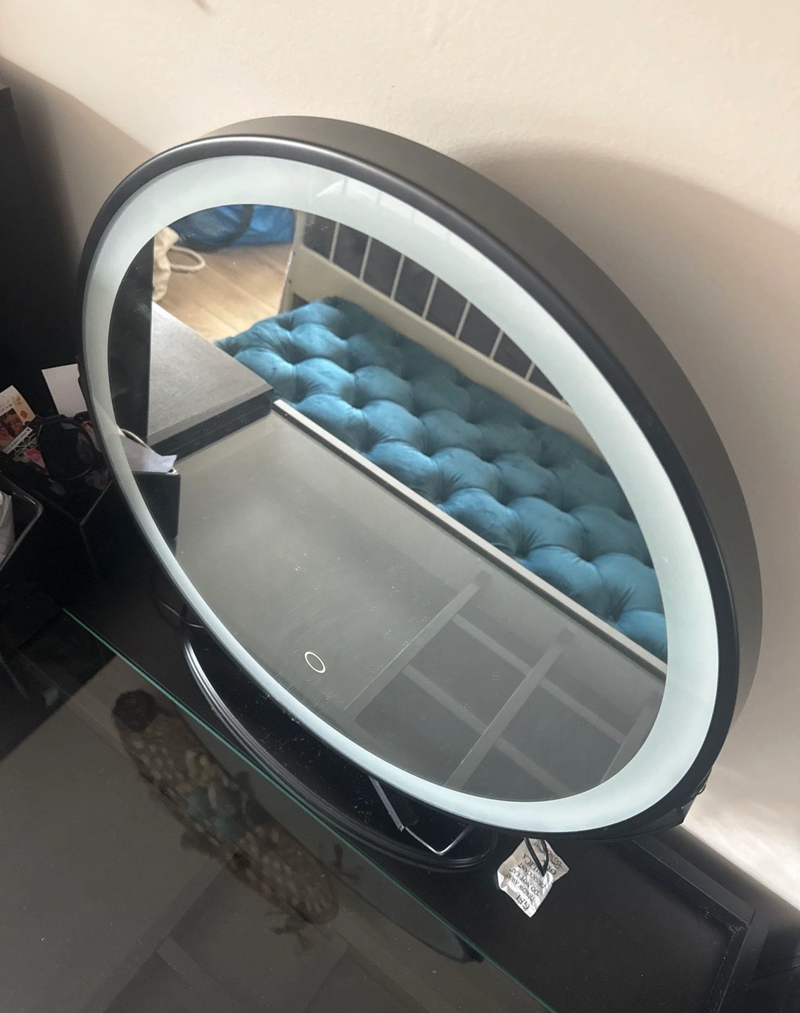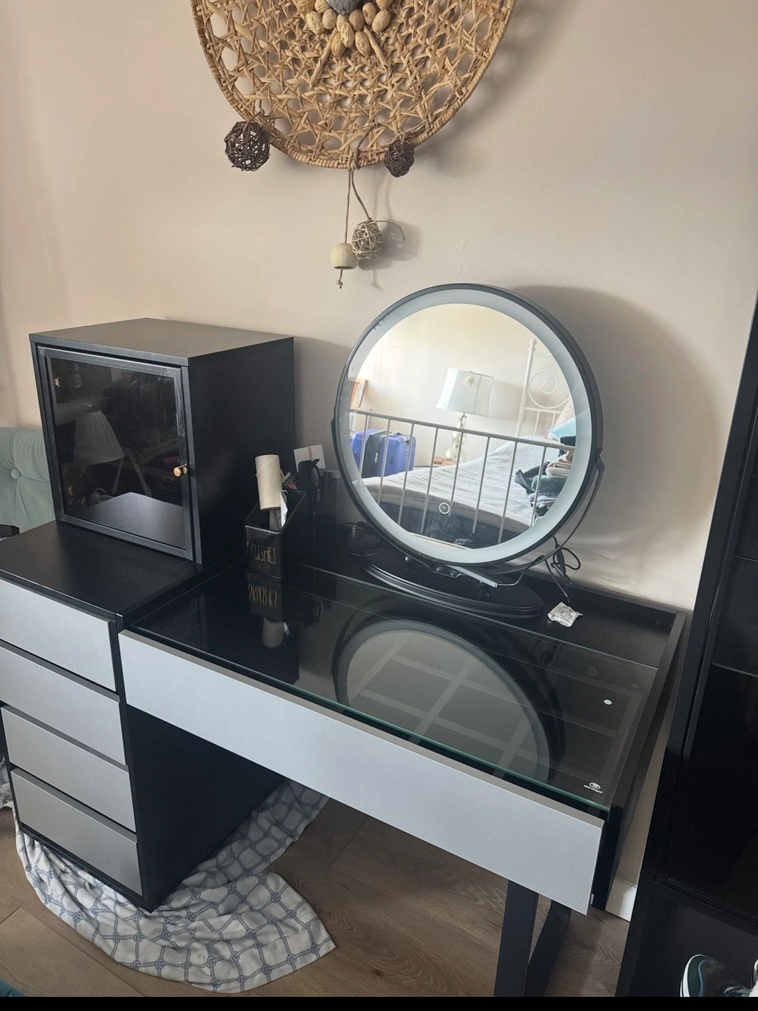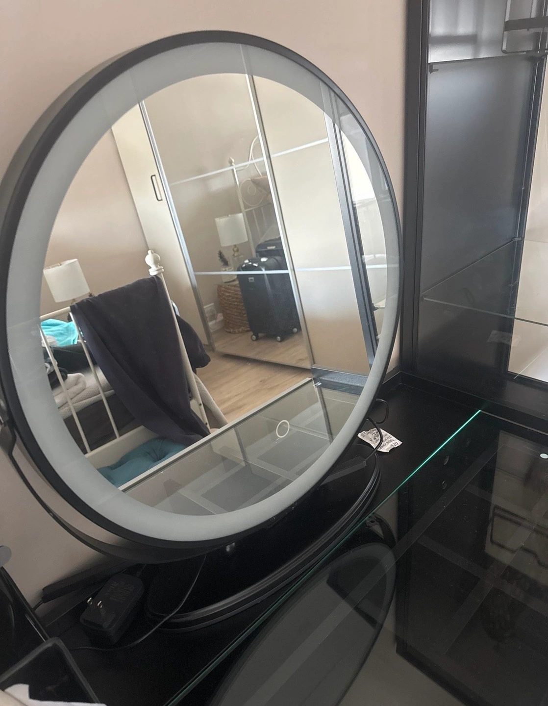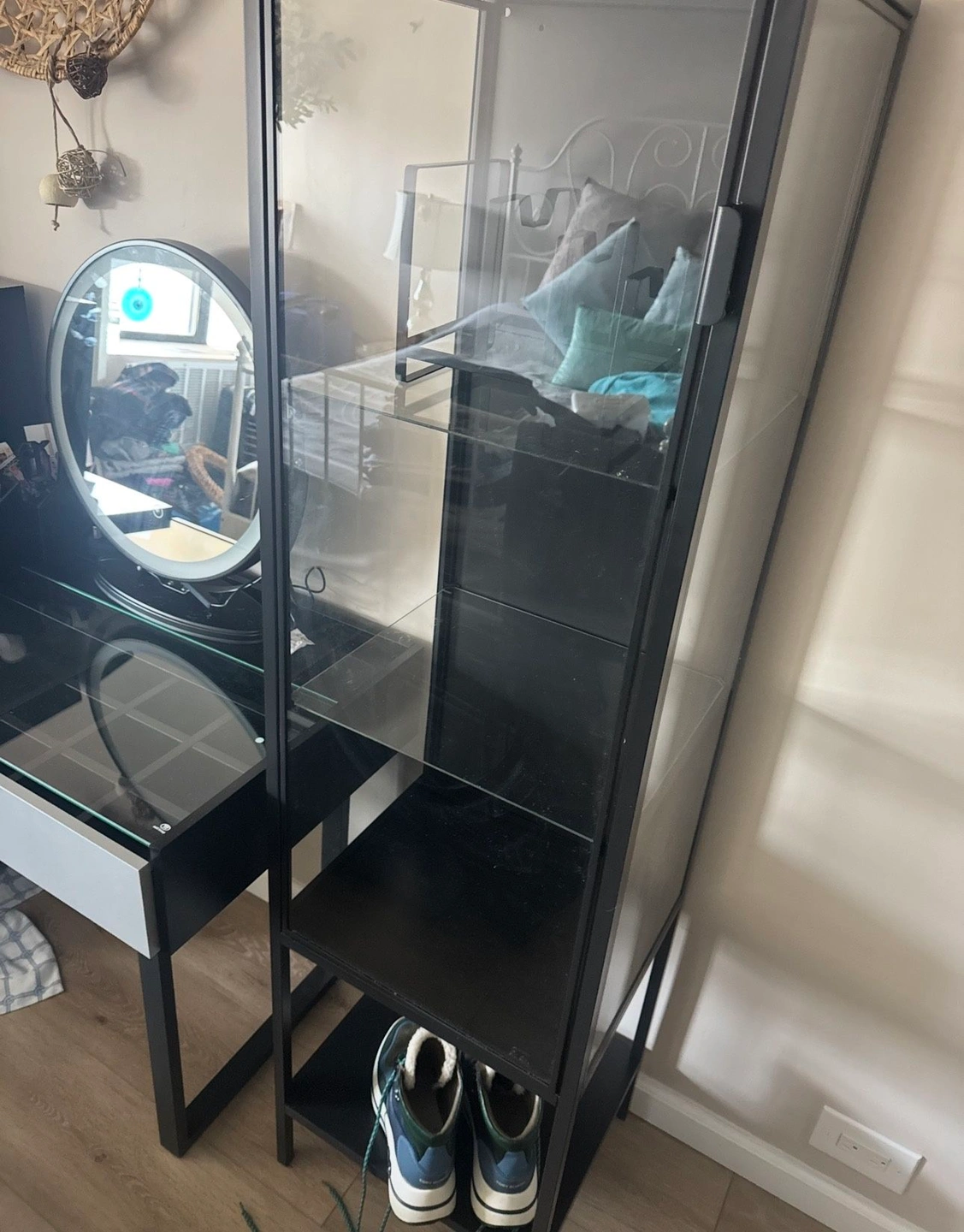 Like new, only a minor scratch. Black glass cabinet can be used for display of bags, shoes, fragrances, or accessories. LED mirror has 3 lighting modes. Pick up from Fort Lee, elevator building. You will need an SUV or pickup truck.