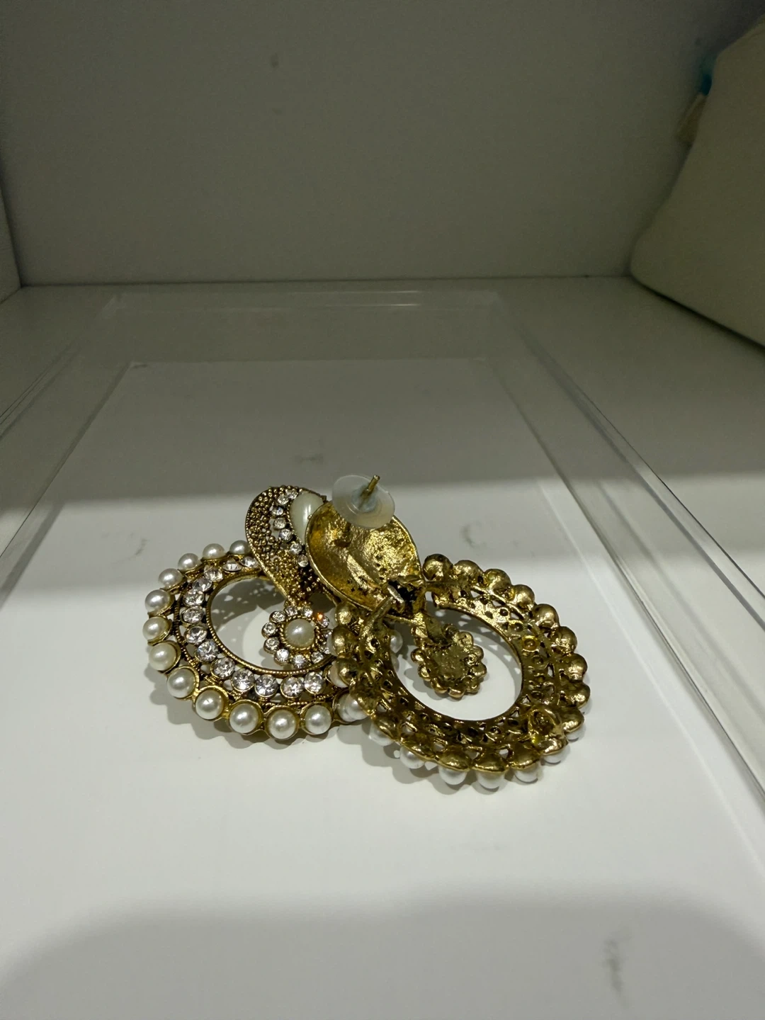 Elegant gold tone drop earrings adorned with faux pearls and sparkling rhinestones. These statement earrings feature an intricate design, perfect for adding a touch of glamour to any outfit. They have a post-back closure for secure wear.