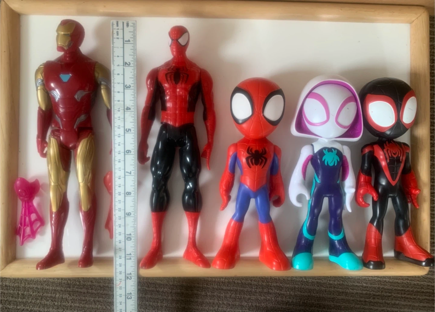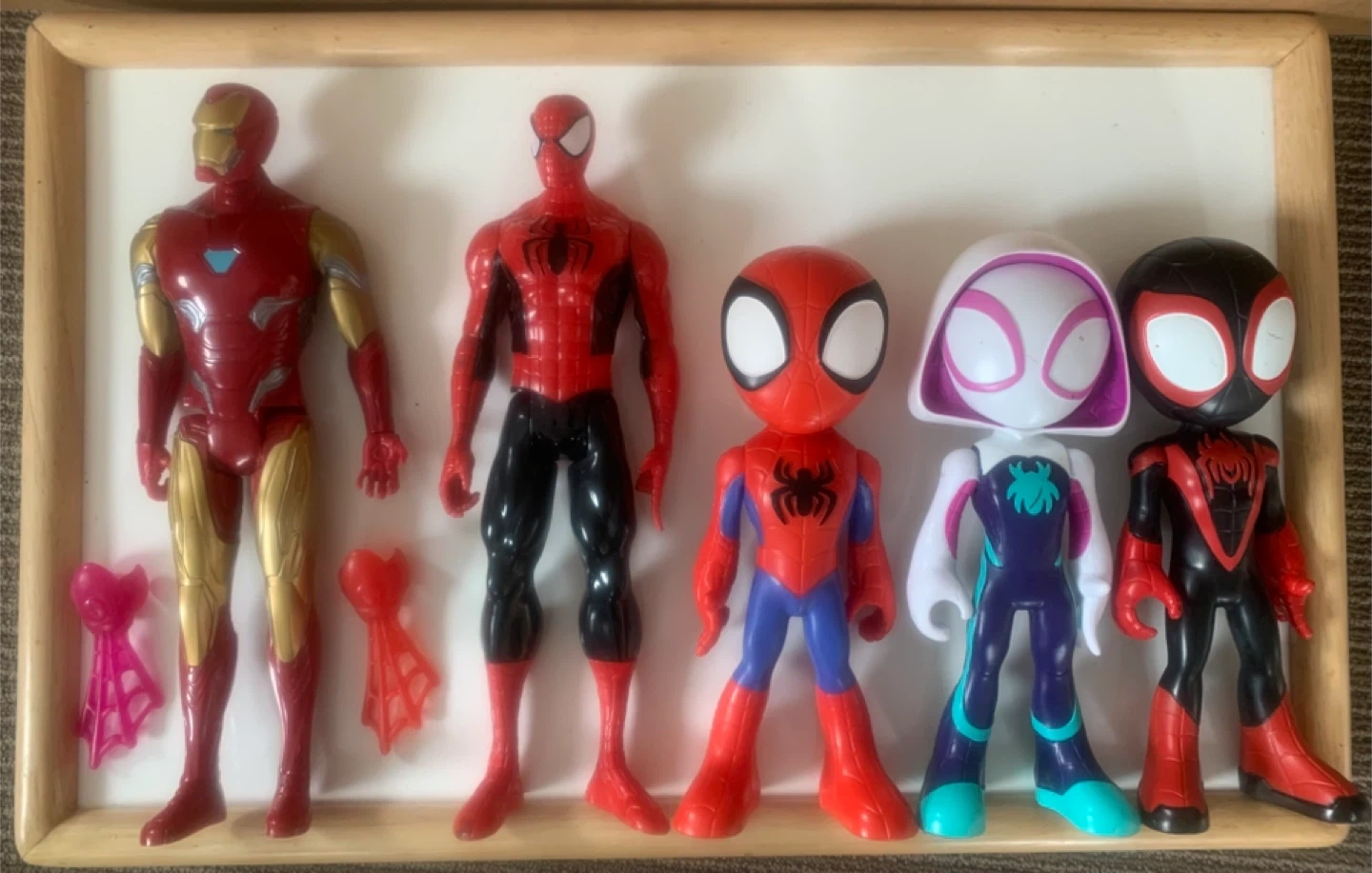 This set includes five action figures: Iron Man, Spider-Man, and three stylized characters (Spider-Man, Ghost-Spider, and Miles Morales). Some figures come with accessory pieces. Great for any Marvel fan's collection!