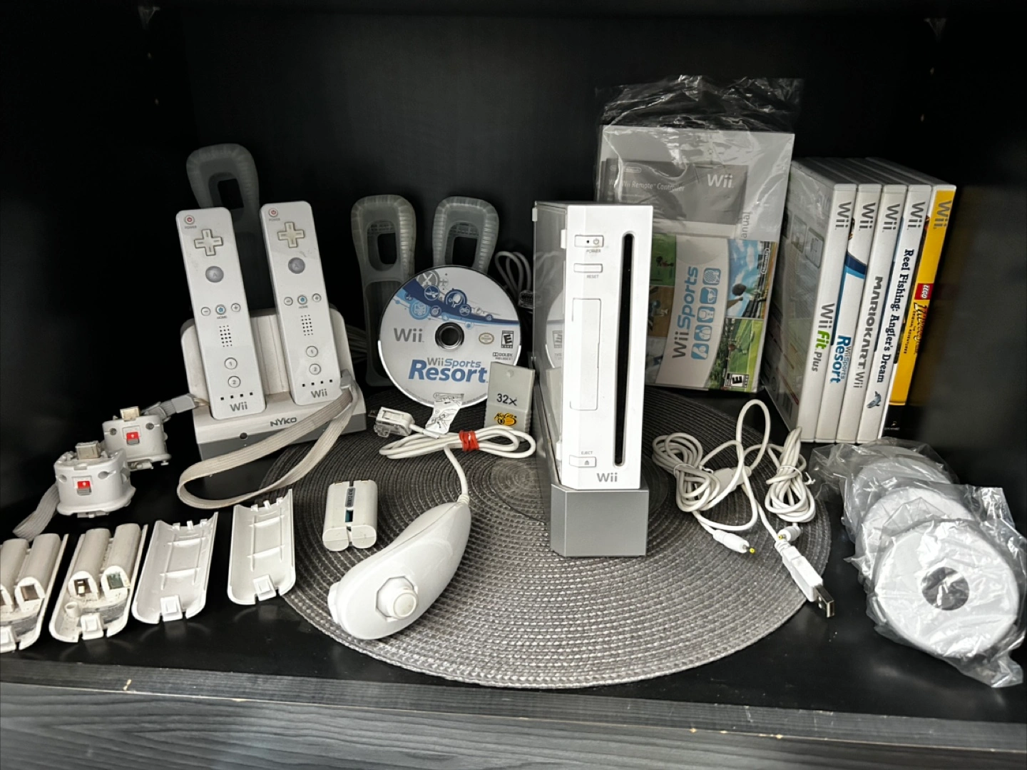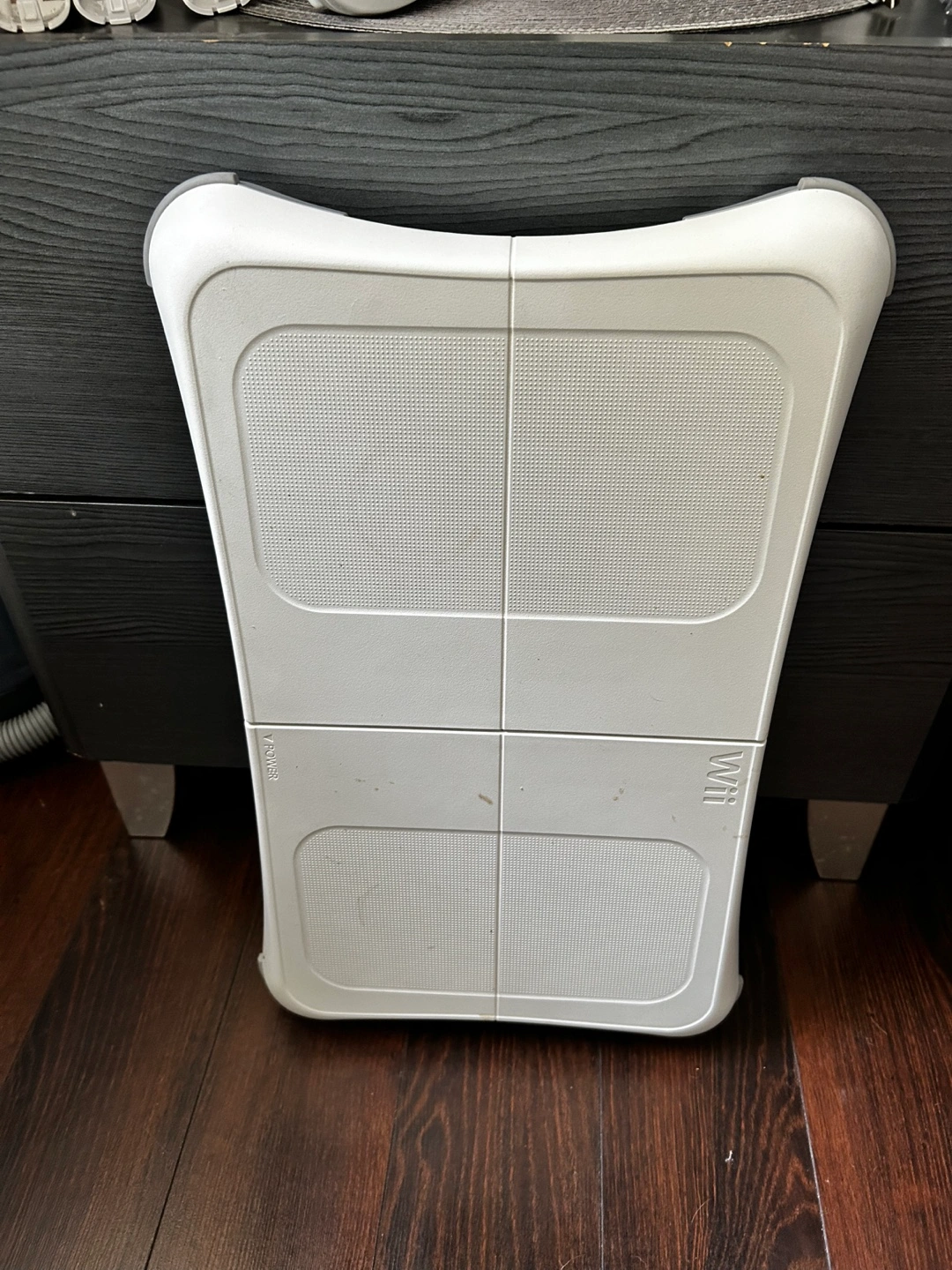 Wii balance board, console, remotes, nunchucks, games, and accessories. Pre-owned, some wear. Great for fitness and gaming.