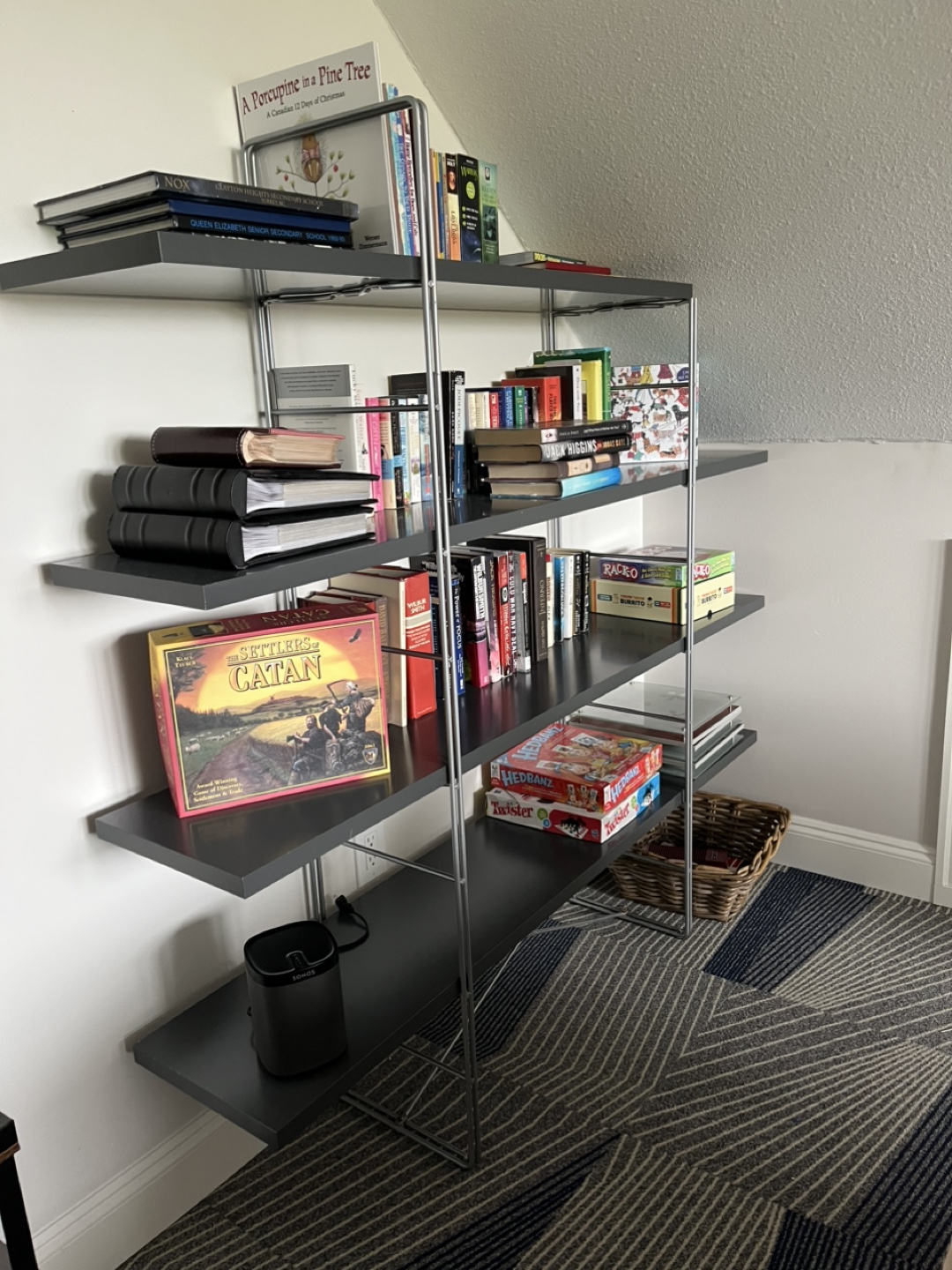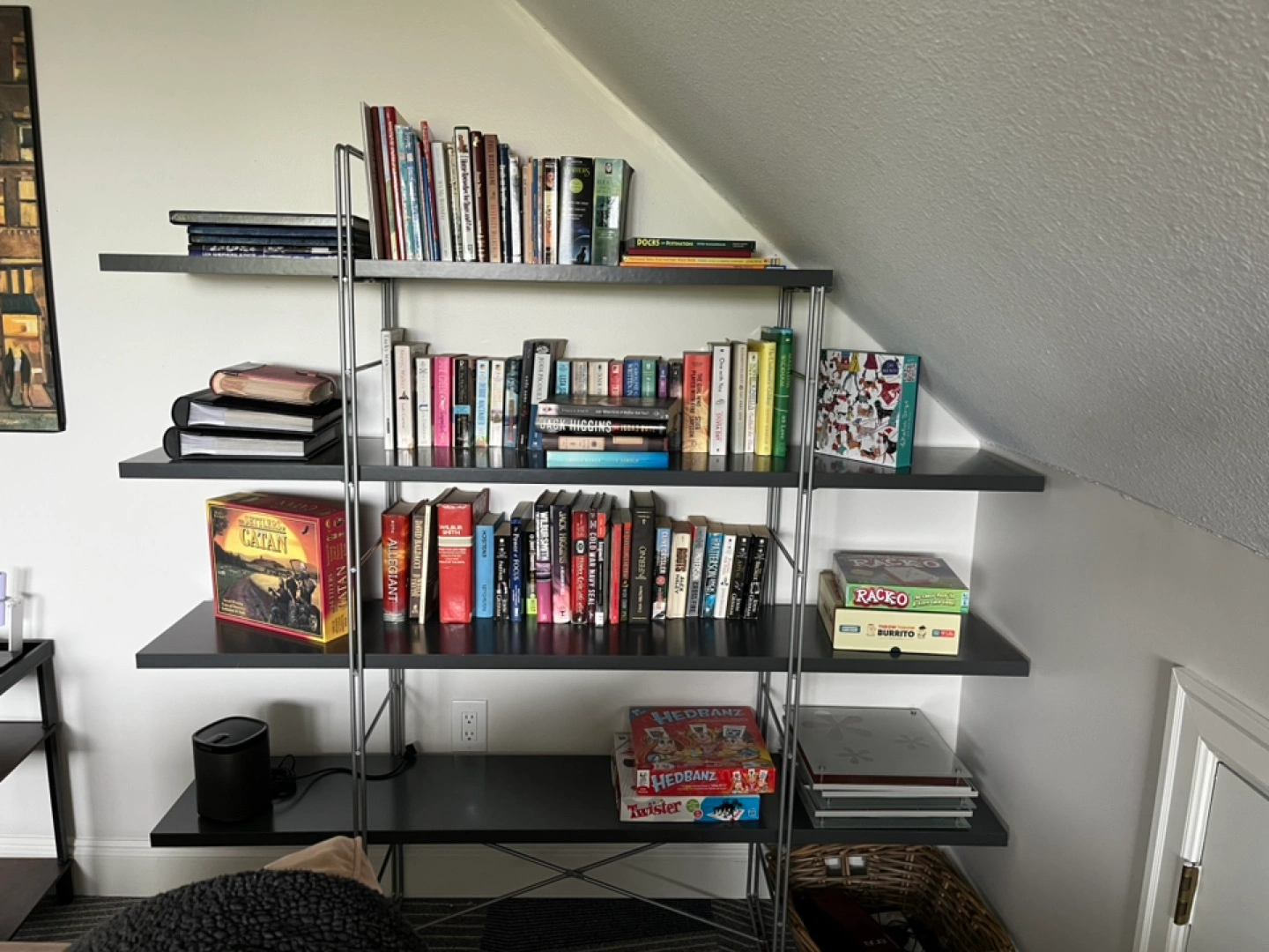 Sleek and stylish angled five-shelf bookcase. Metal frame, dark grey shelves. Perfect for books, games, or decor. Good condition.