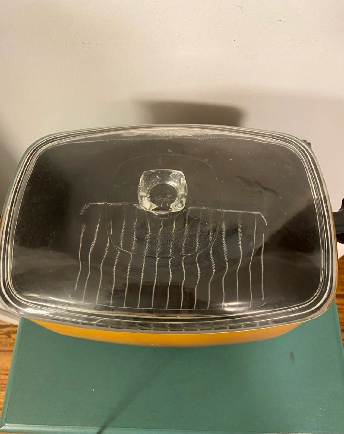 Retro orange electric skillet. Features a glass lid and black interior. Excellent for cooking various dishes.