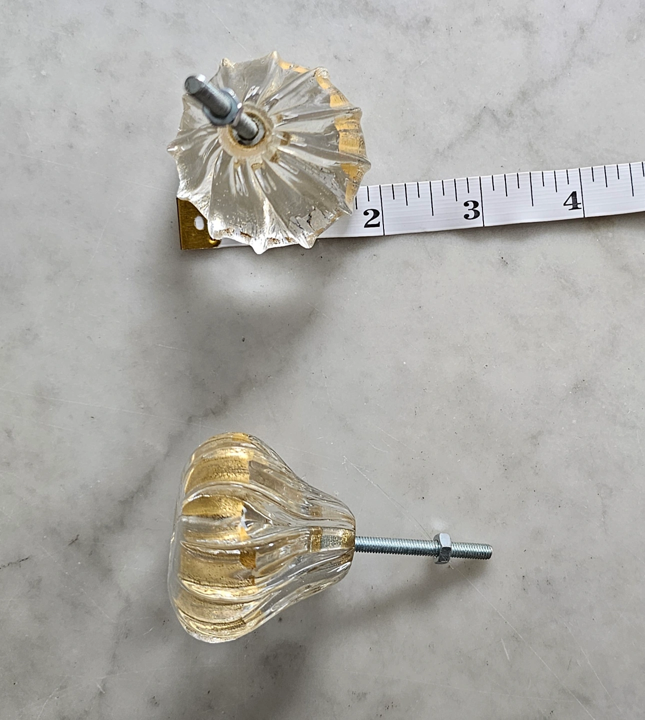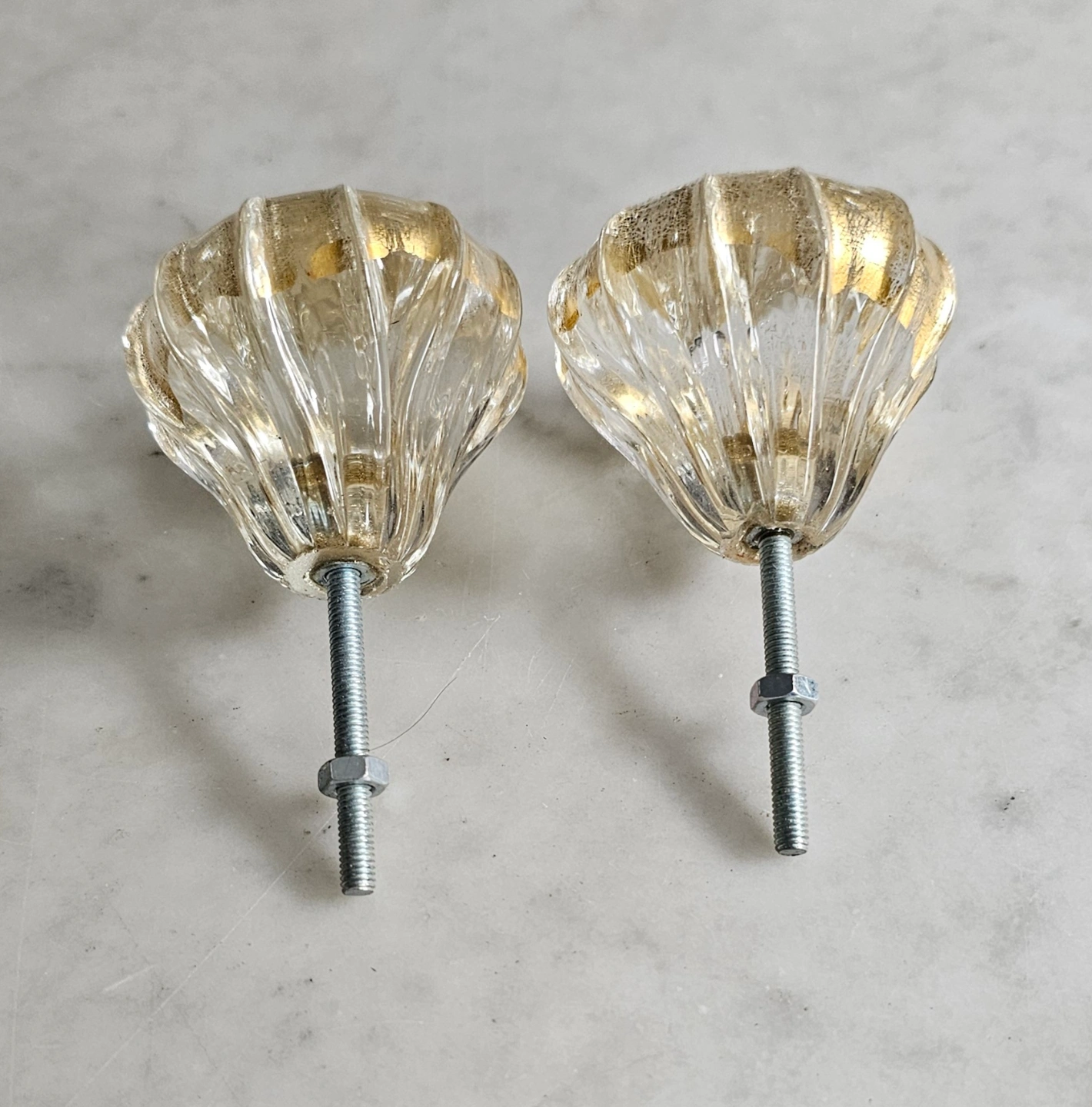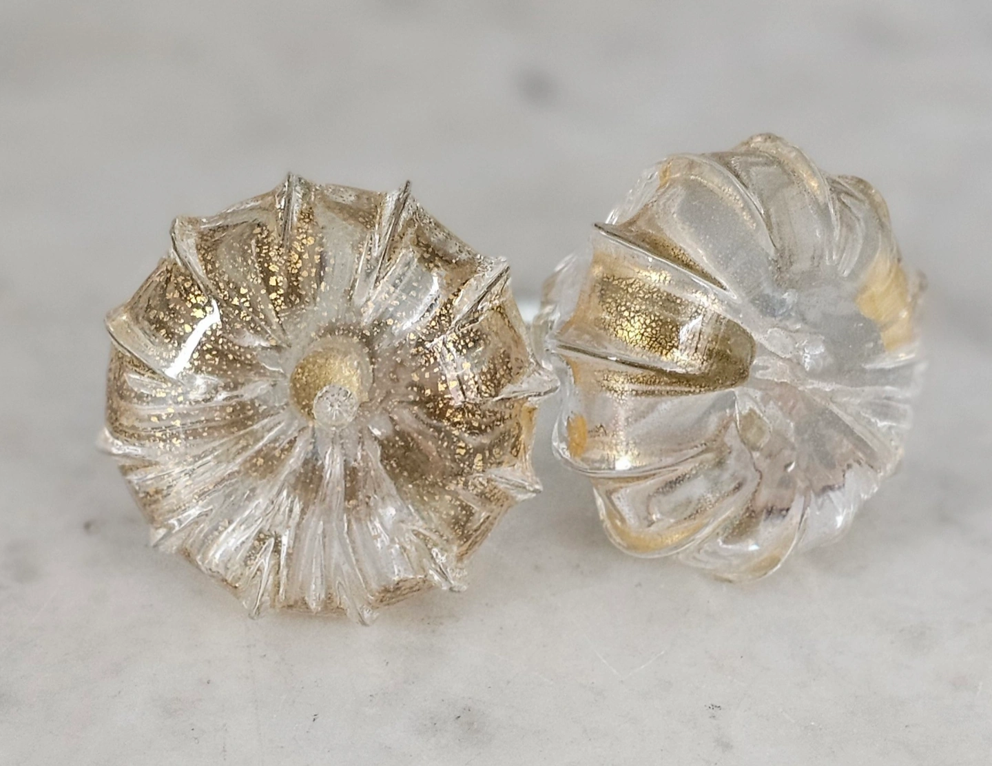 Vintage Pair of Clear Fluted Glass Knobs with Gold Leaf Speckles