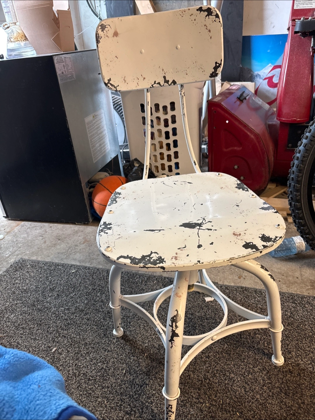 White metal swivel chair. Shows wear and tear. Great for industrial or vintage decor. Unique piece. Other than paint in great condition swivel works great solid metal chair