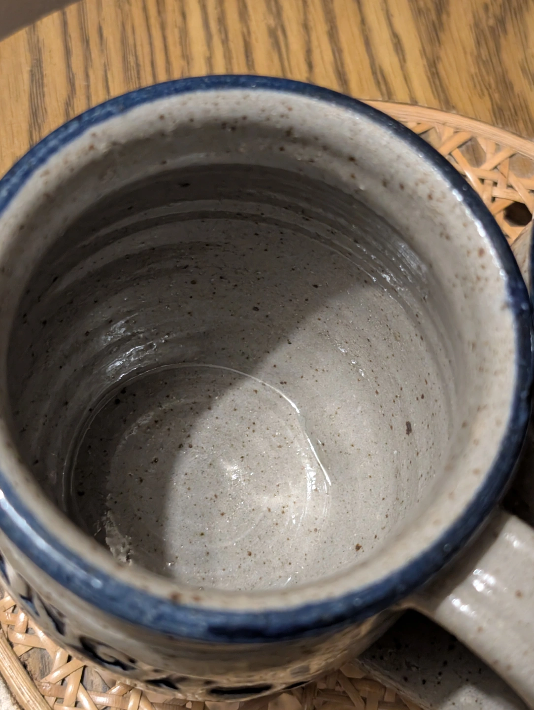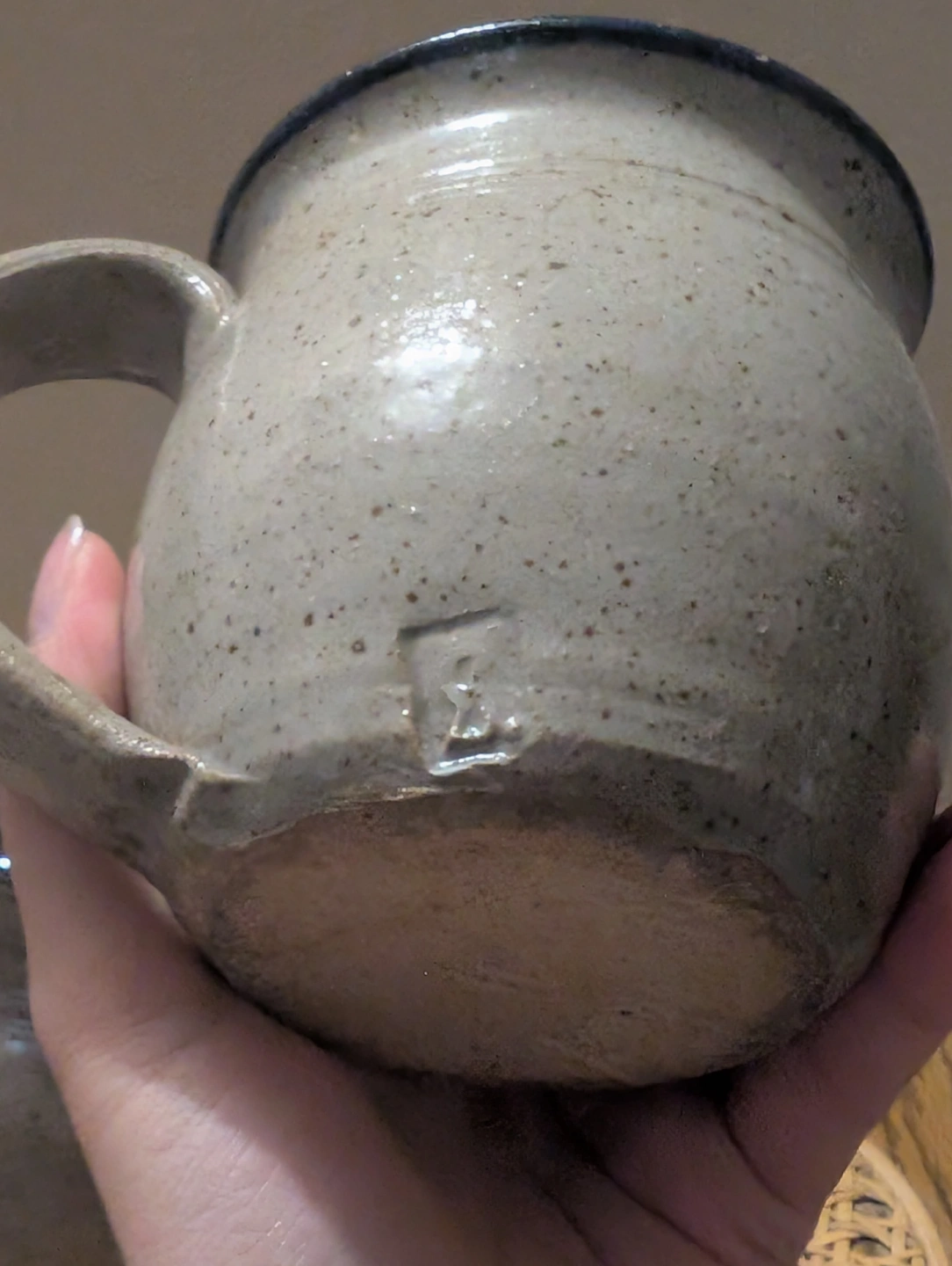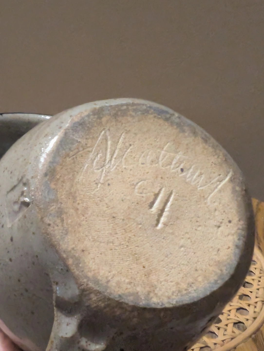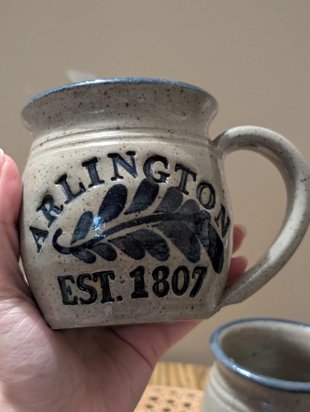 Set of two handcrafted mugs. Stoneware. Arlington, Est. 1807 design. Dark blue accents. Hand-thrown pottery. Unique markings on bottom.
