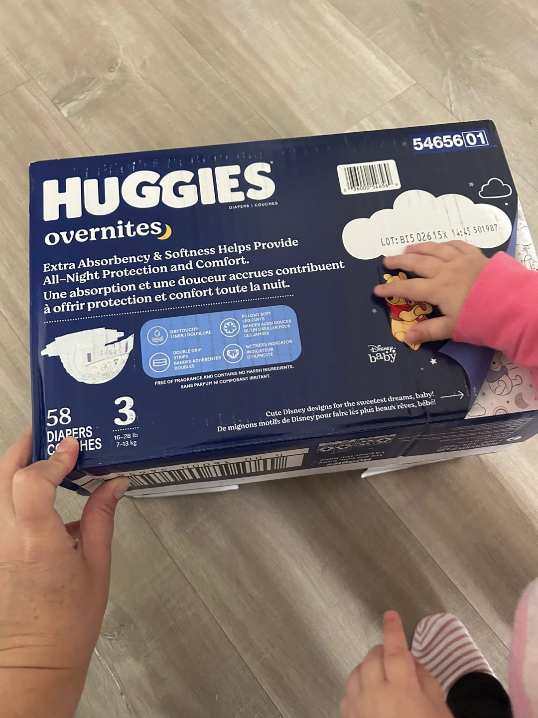 New, unopened box of Huggies Overnites diapers, size 3. 58 diapers total. Disney Baby Winnie the Pooh design. Extra absorbency and softness. All-night protection and comfort.