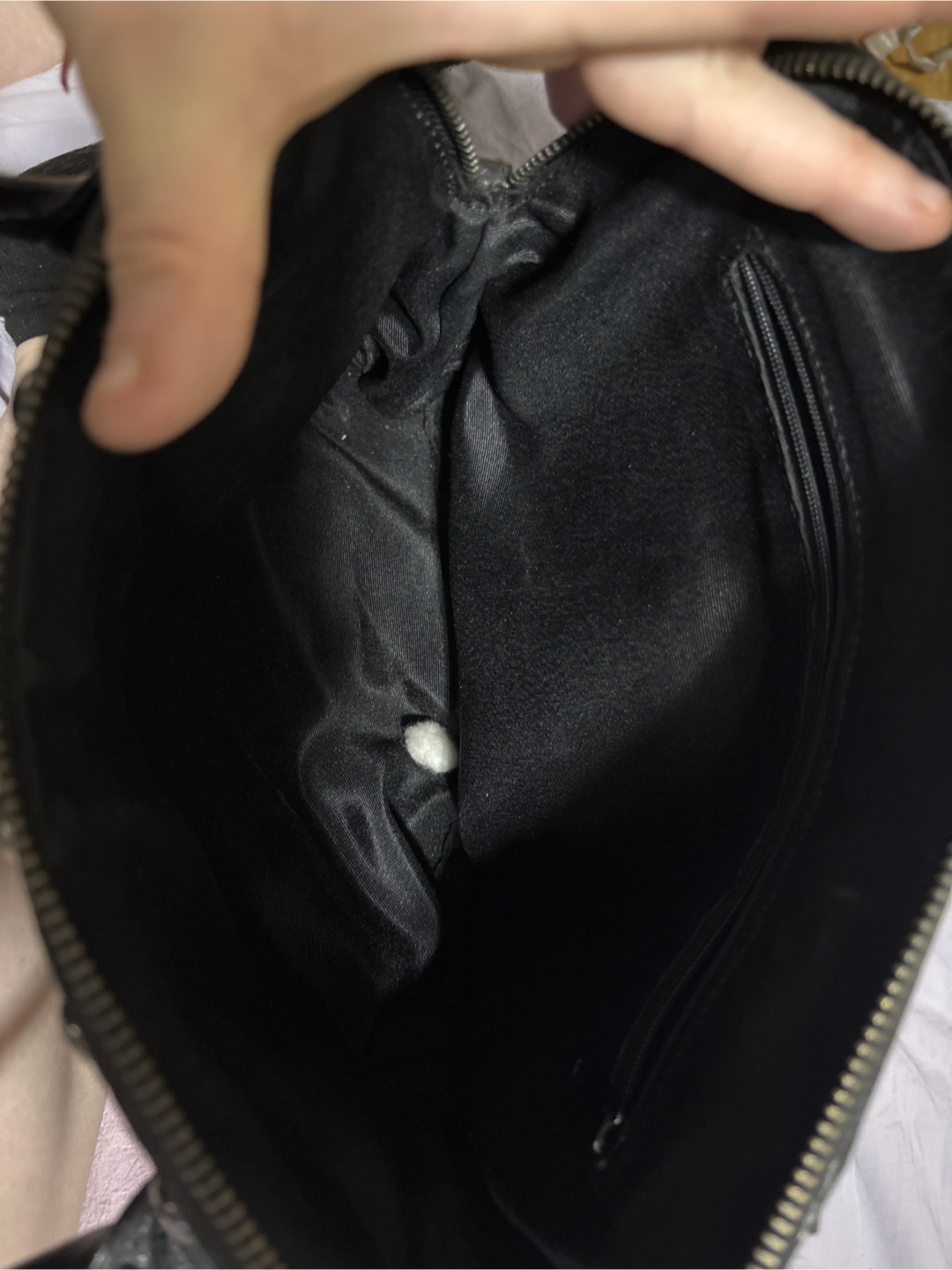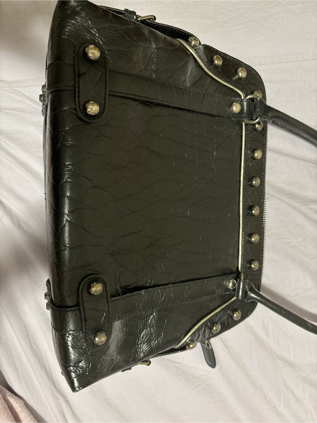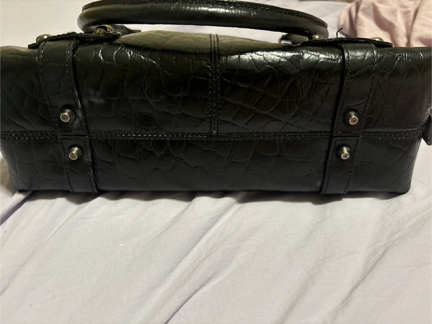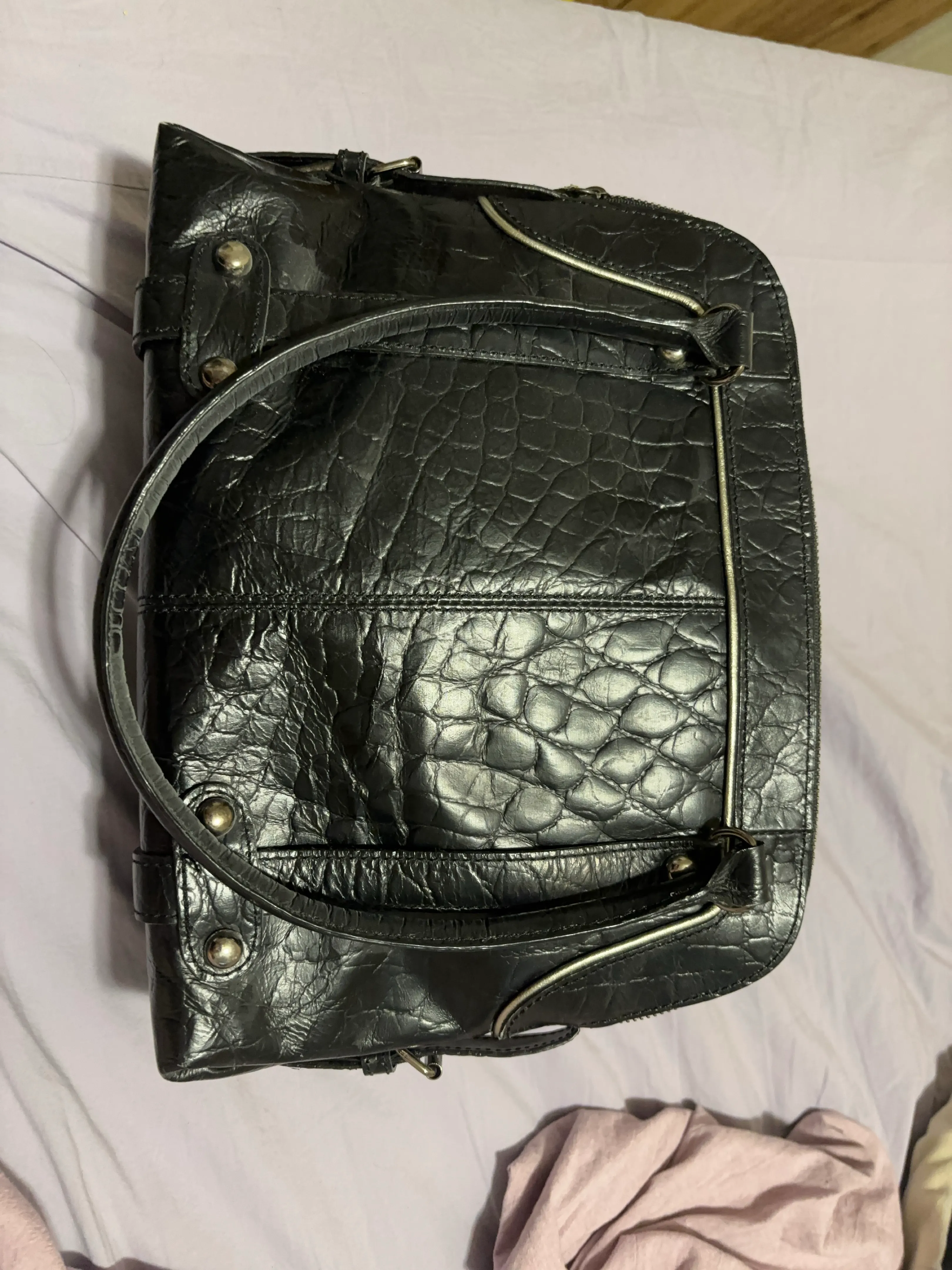 Stylish black leather handbag. Features a crocodile-embossed texture, silver-toned studs, and a structured shape. Top handle and zip closure. Interior features a small zippered pocket. Excellent for everyday use.