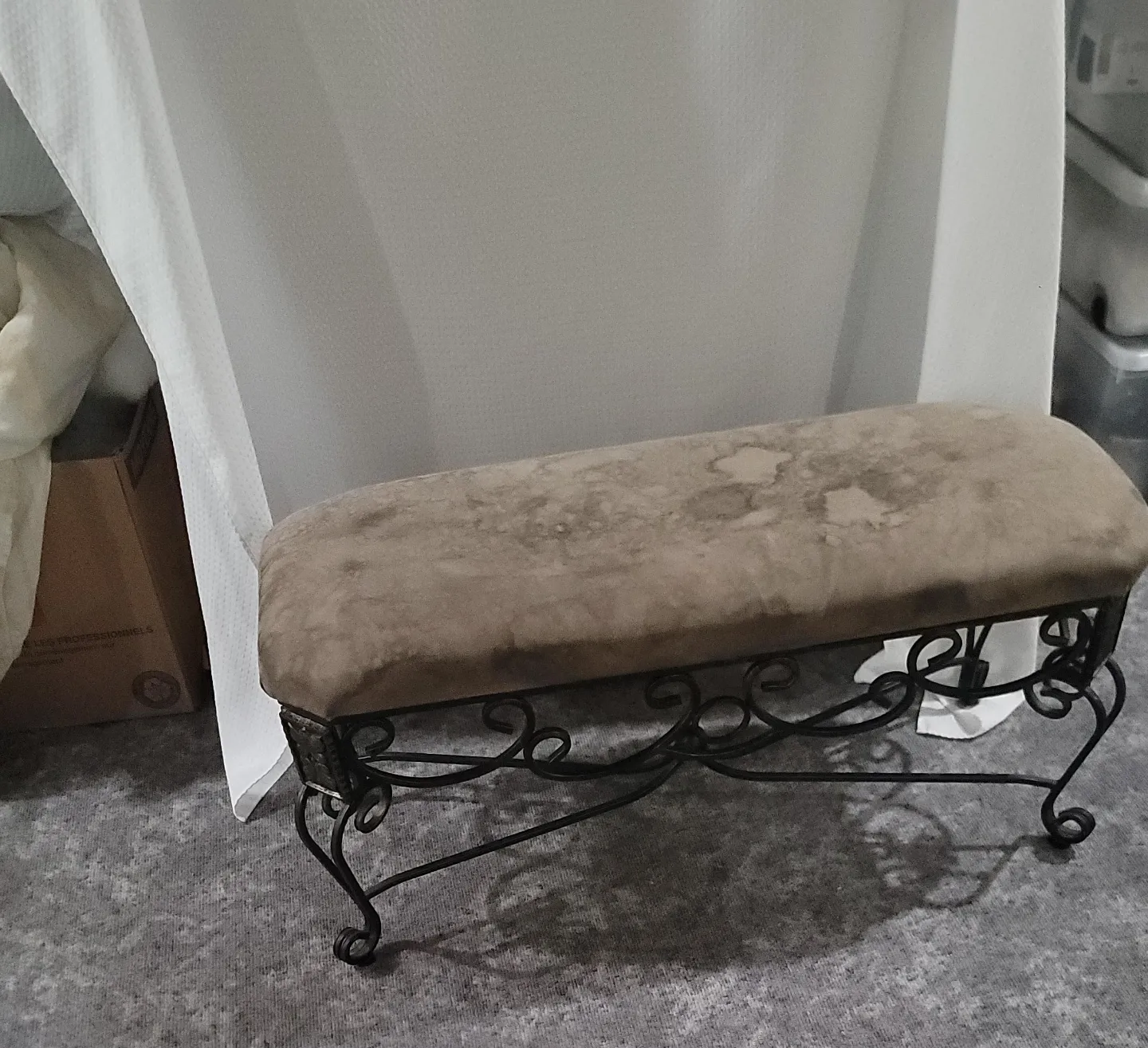 Small bench. Metal frame. Upholstered seat. Neutral colour.