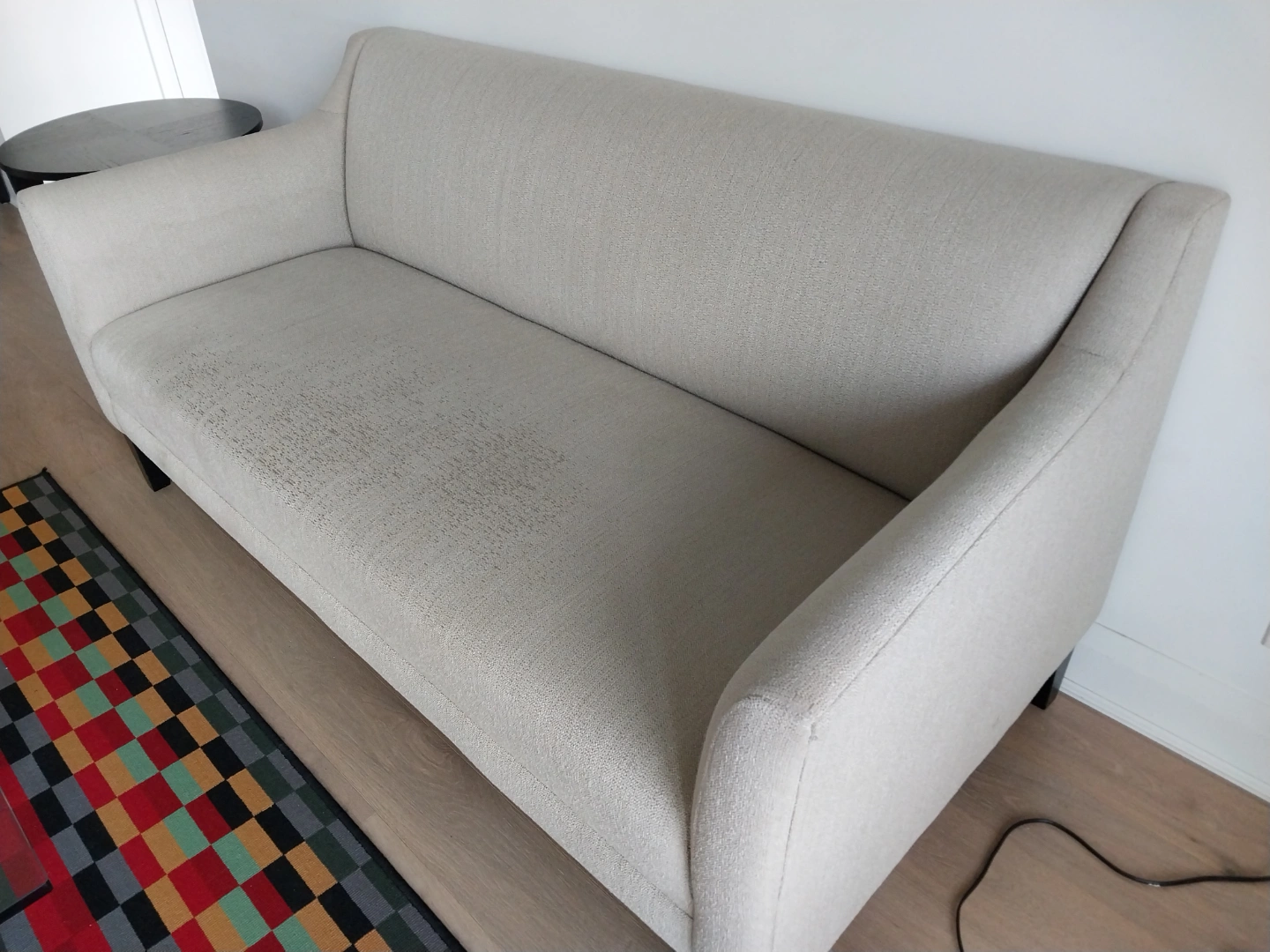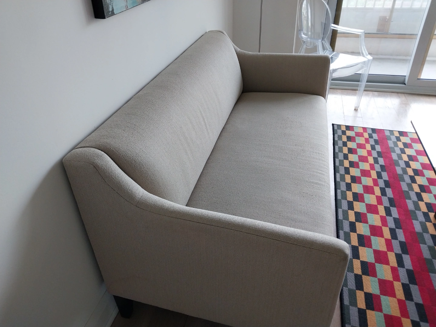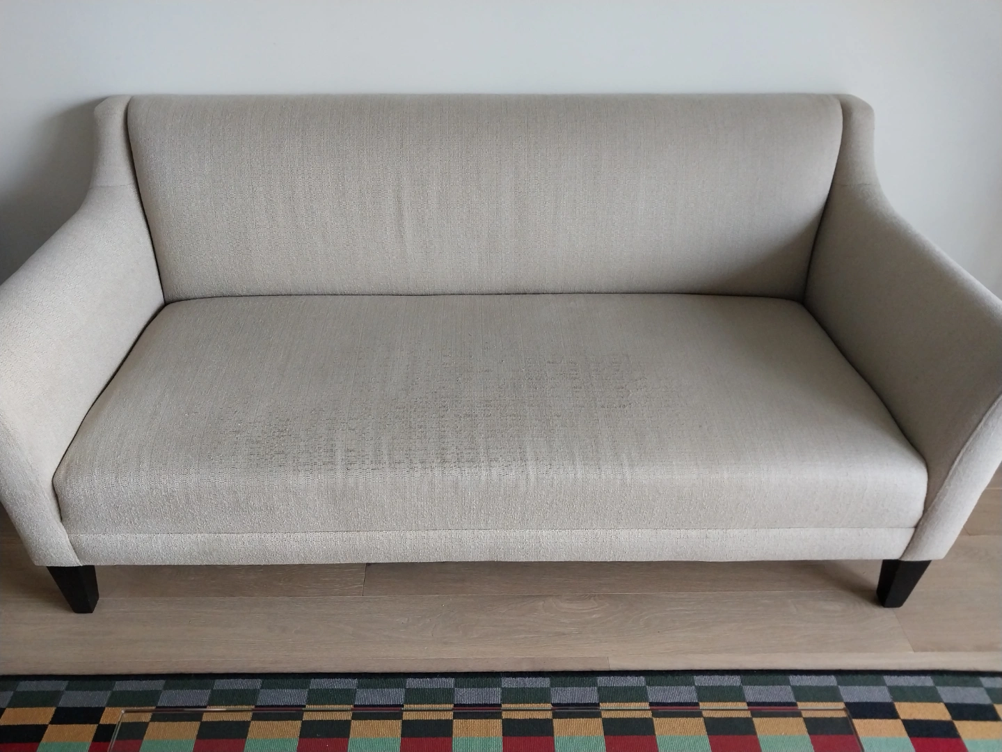 Light beige fabric sofa. Minor wear visible on seat cushions. Simple, modern design. Dark brown legs. Suitable for small spaces.