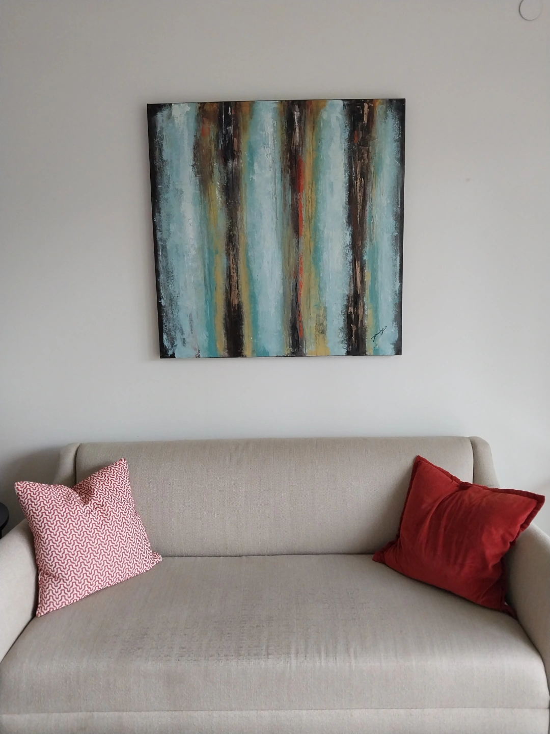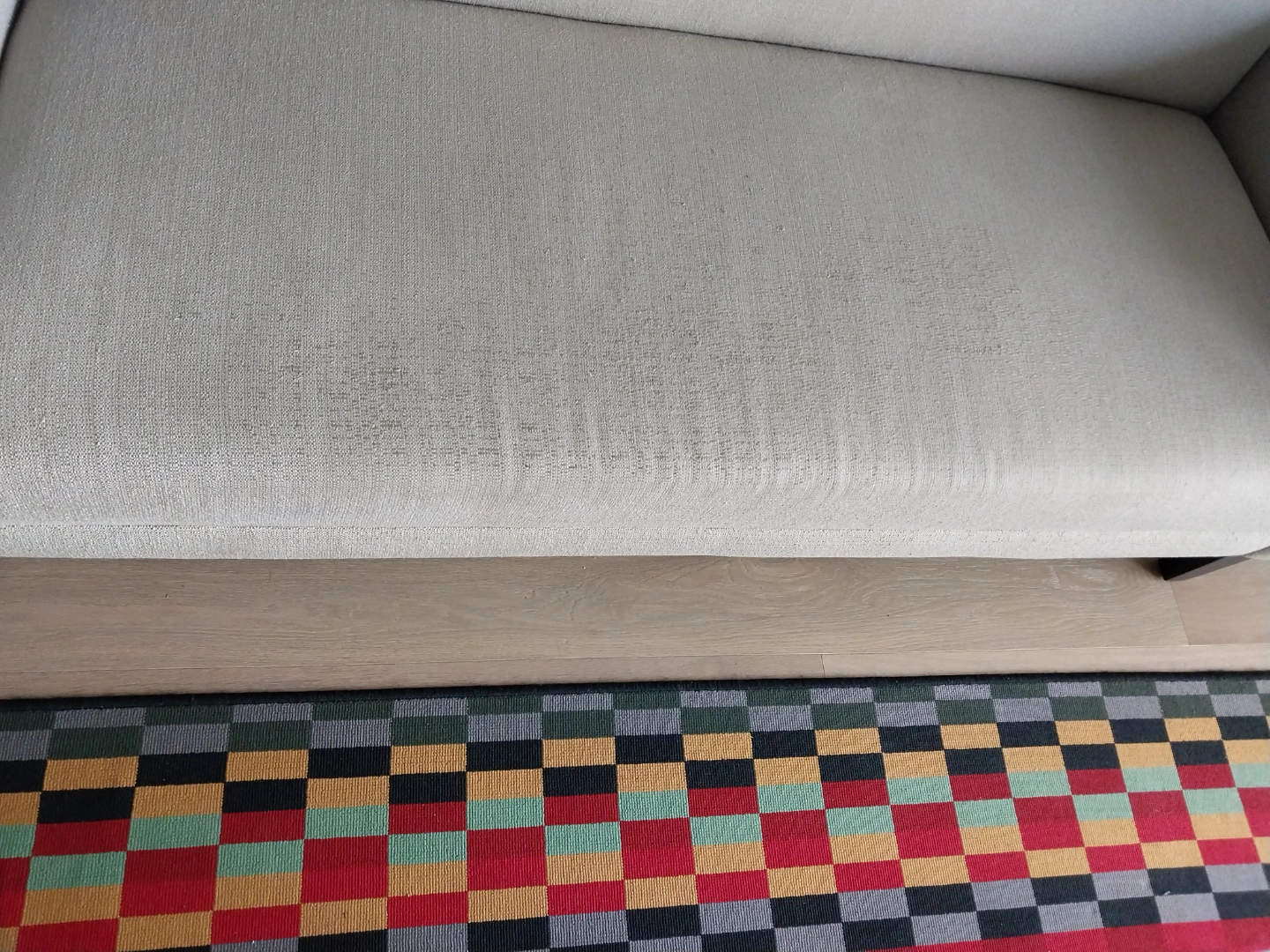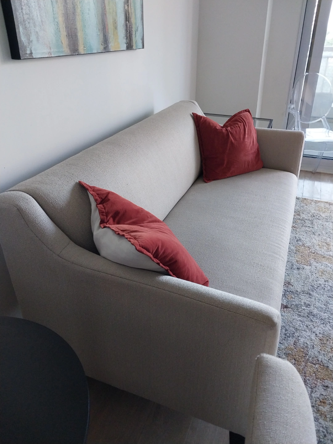 Light beige fabric sofa. Minor wear visible on seat cushions. Simple, modern design. Dark brown legs. Suitable for small spaces.
