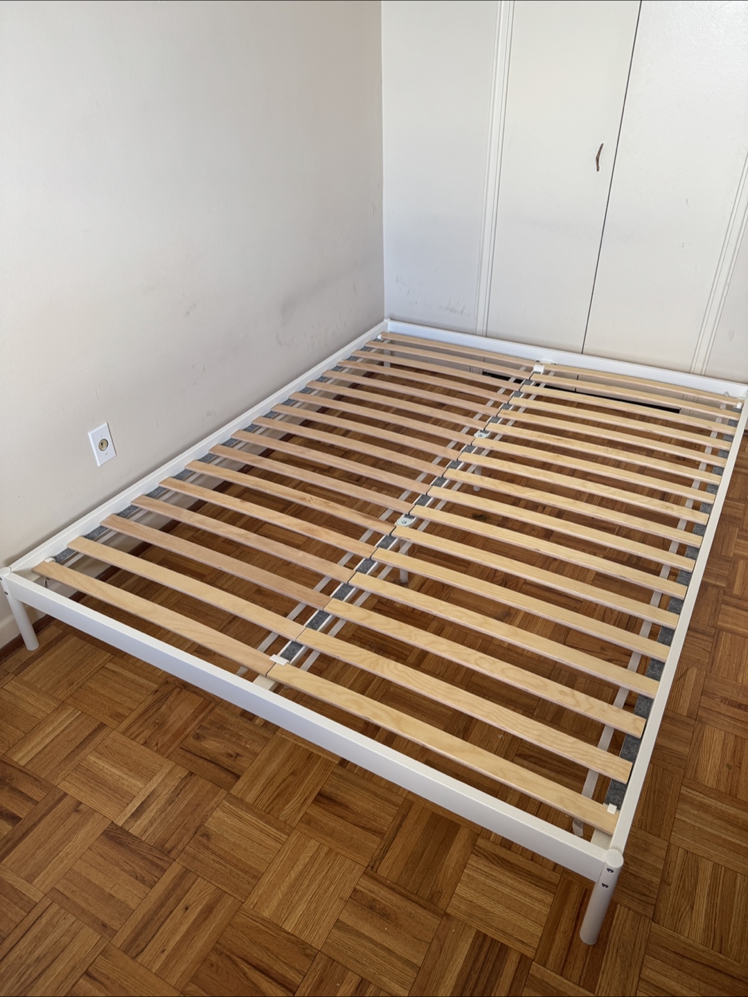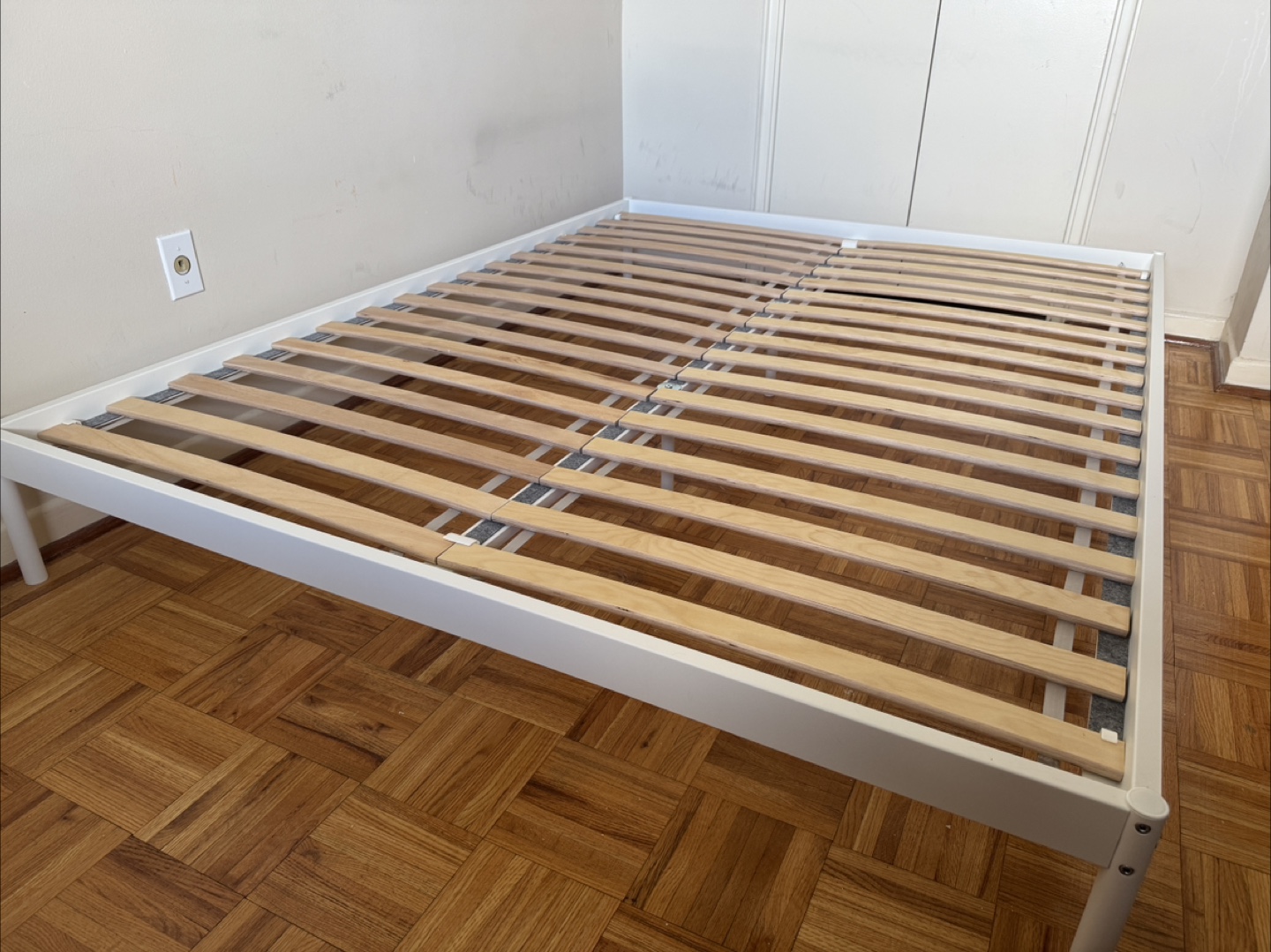White queen-size bed frame. Wooden slats included. Minimal assembly required. Like new Queen size. Ikea red: Velvelstad Bed Frame