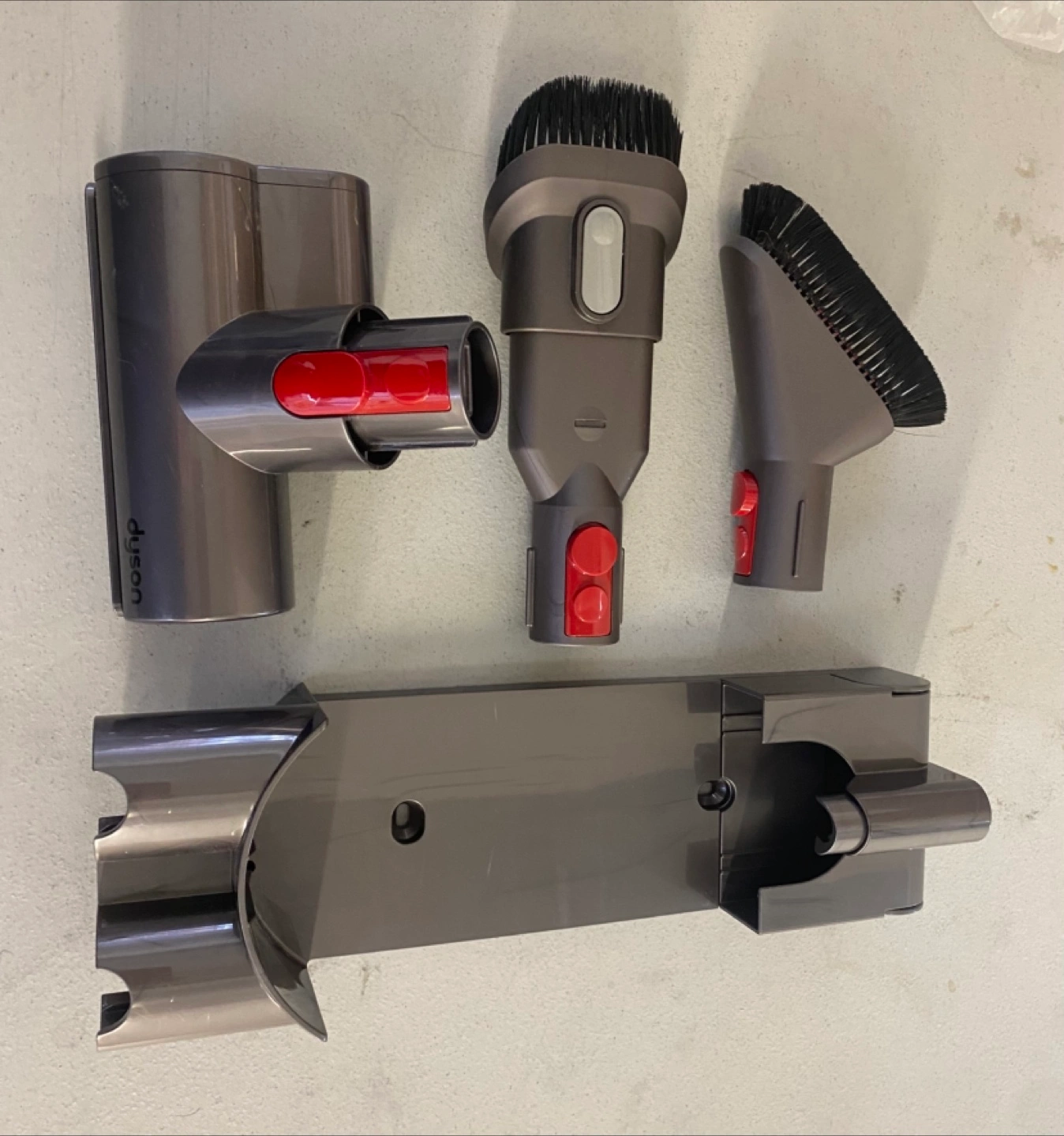 Set of Dyson vacuum cleaner attachments for the V8 Animal Cordless Stick Vacuum. It also includes the mounting bracket