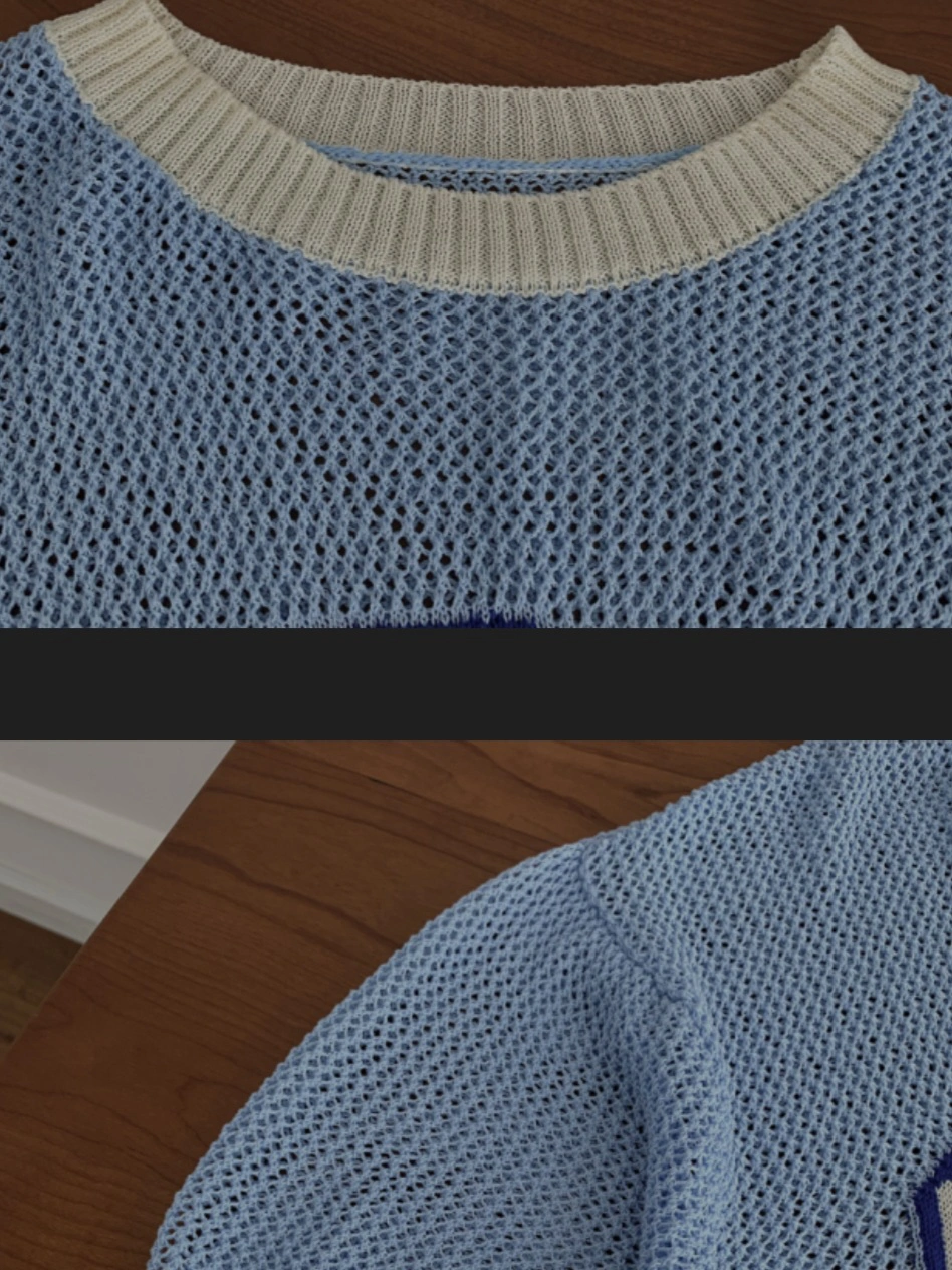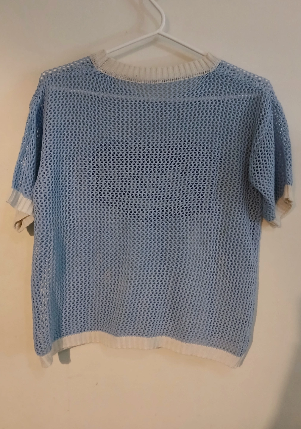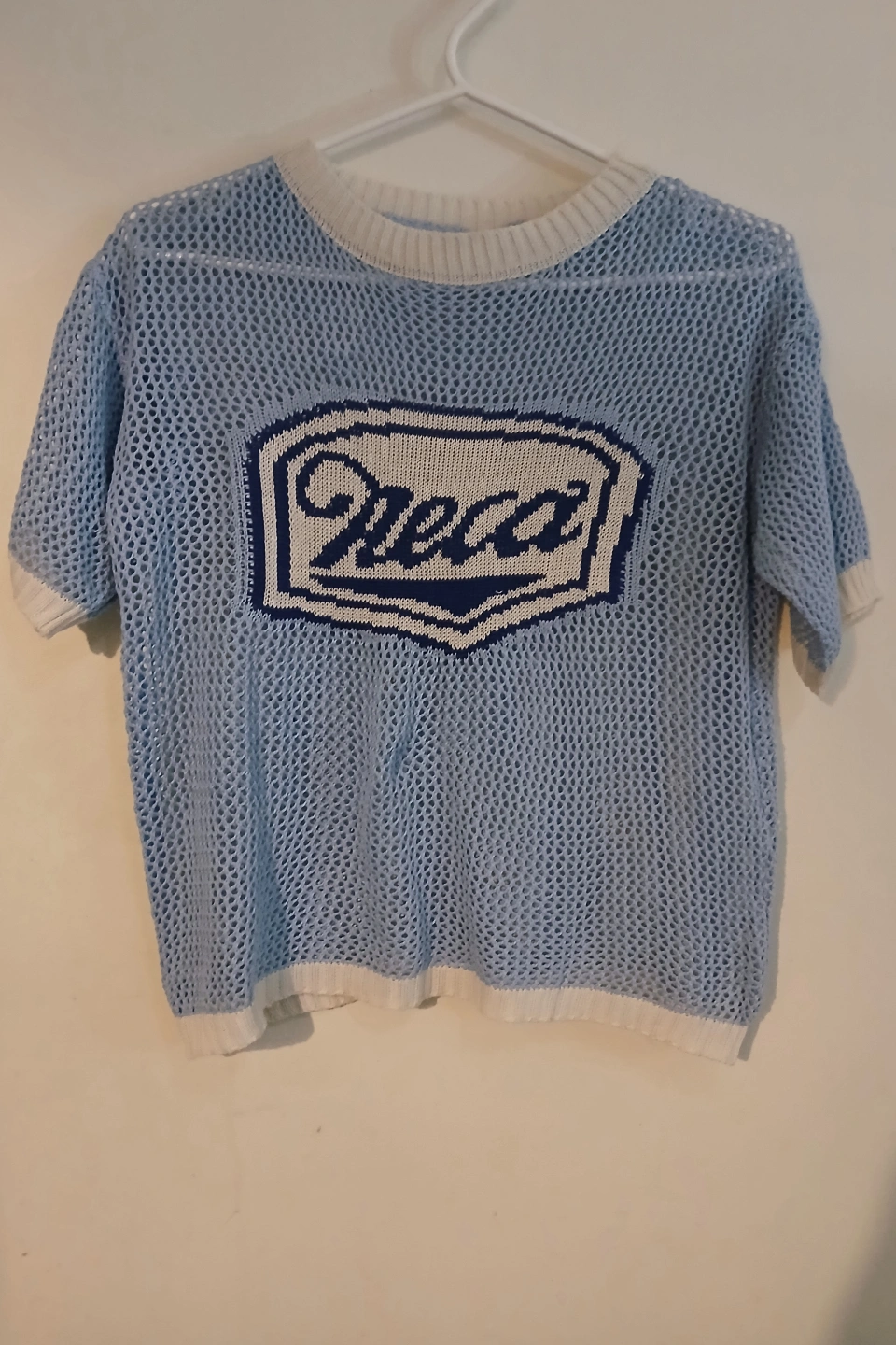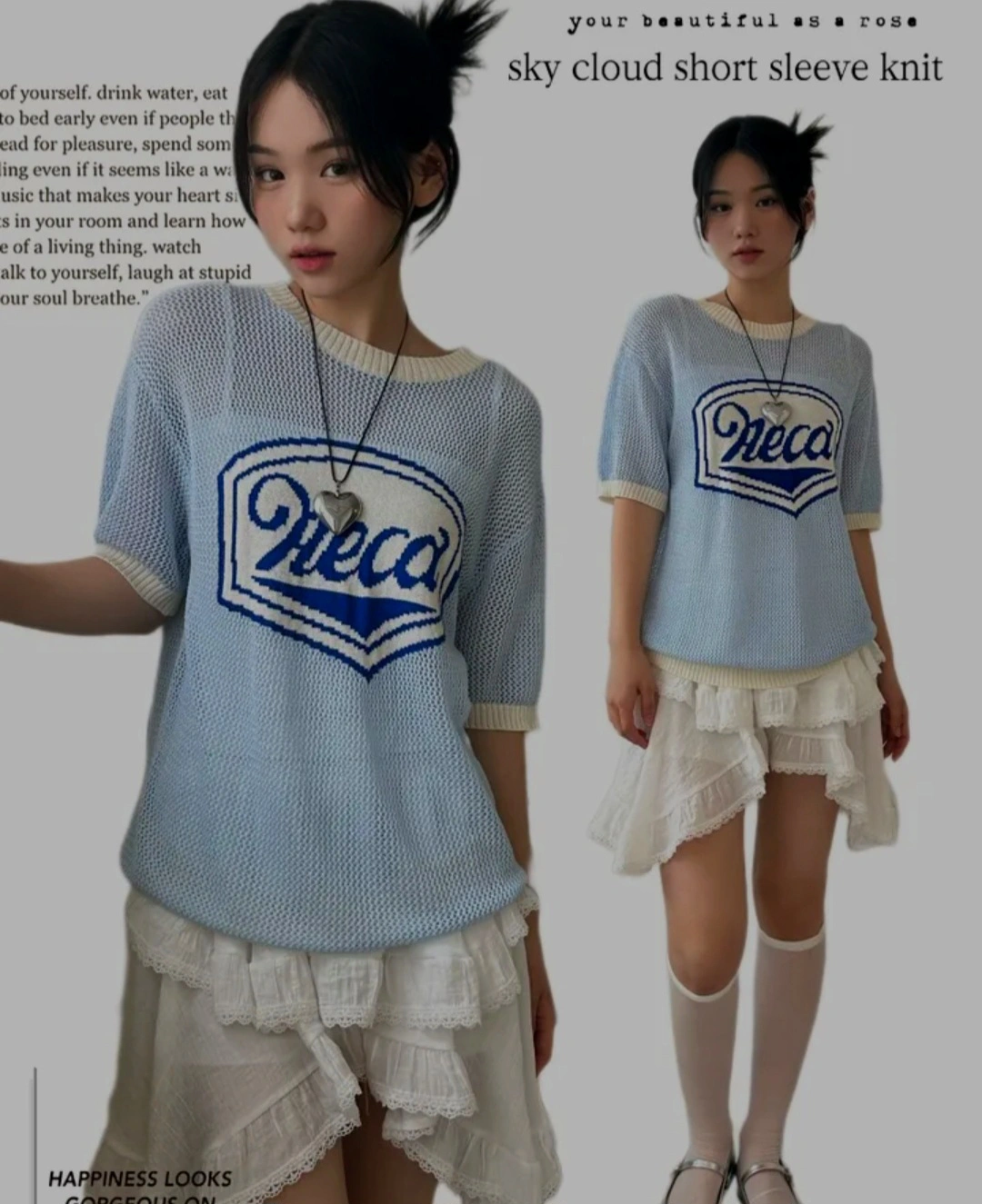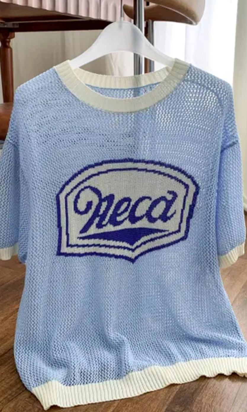 Cute light blue knitted top. Features a unique cute logo design. Short sleeves and a relaxed fit. Perfect for summer. good to match with shorts and skirts