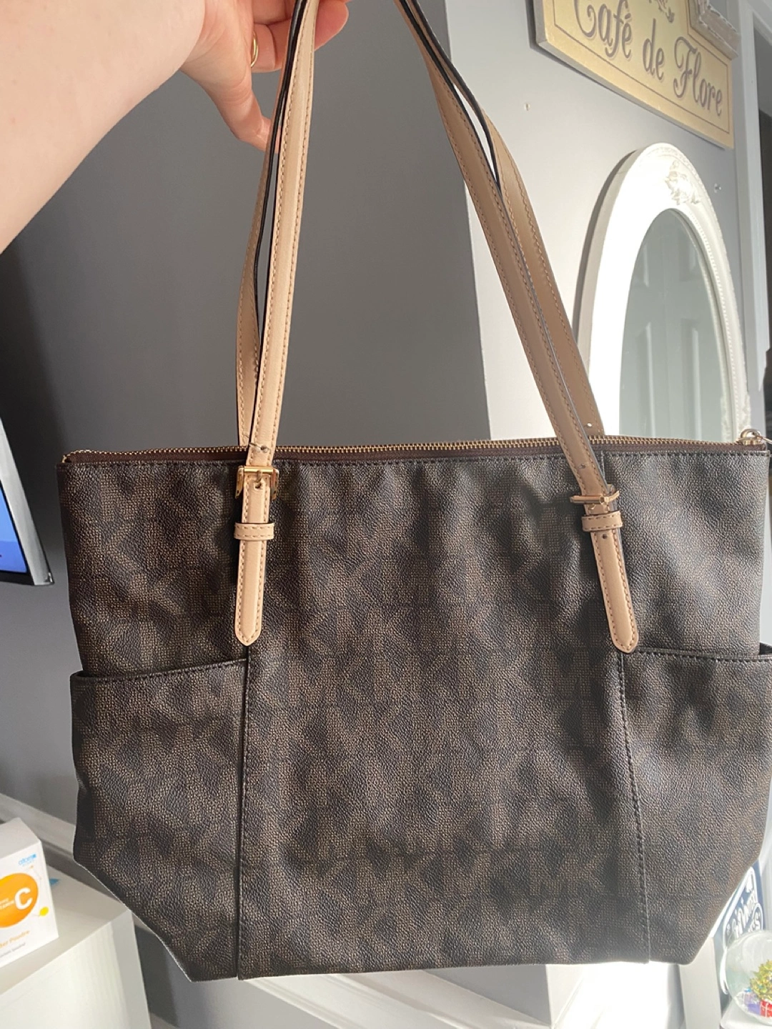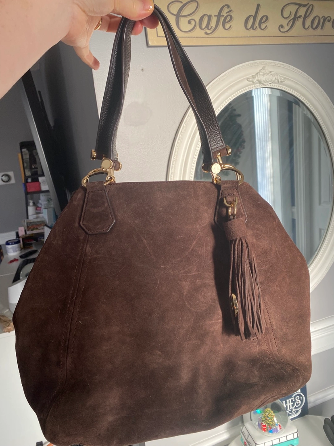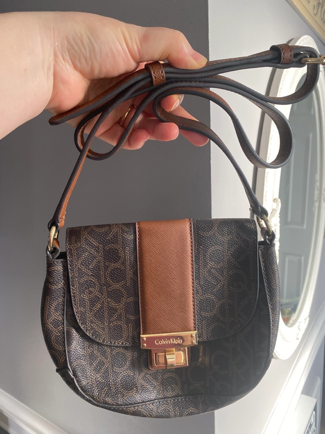 Three lovely handbags for sale. A brown and beige Michael Kors tote bag($60)features a zip closure and multiple pockets. A dark brown suede handbag($30) with a tassel detail and gold accents. A small Calvin Klein crossbody bag($20)brown and tan colourblock design.
