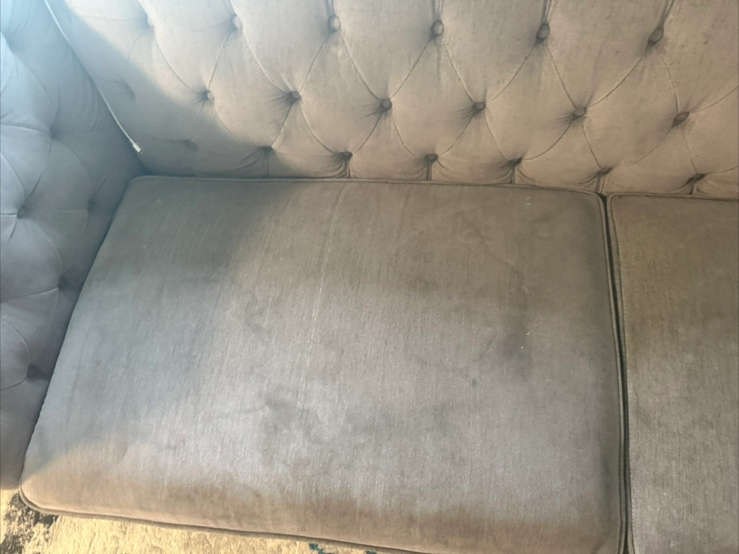 Three-piece living room set. Sofa and two armchairs. Grey fabric upholstery. Button tufting detail. Some wear and tear. Water stains on the sofa from trying to clean off juice or baby milk. Selling AS IS. MUST PICK UP NEAR 2 GREYSTONE WALK DRIVE