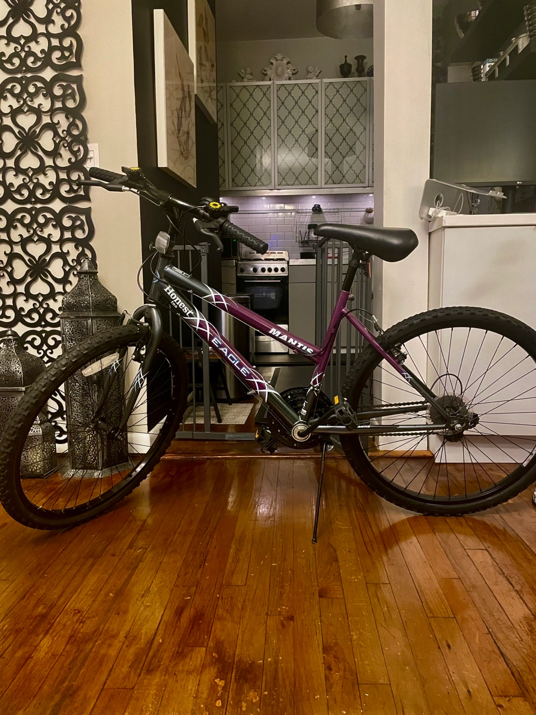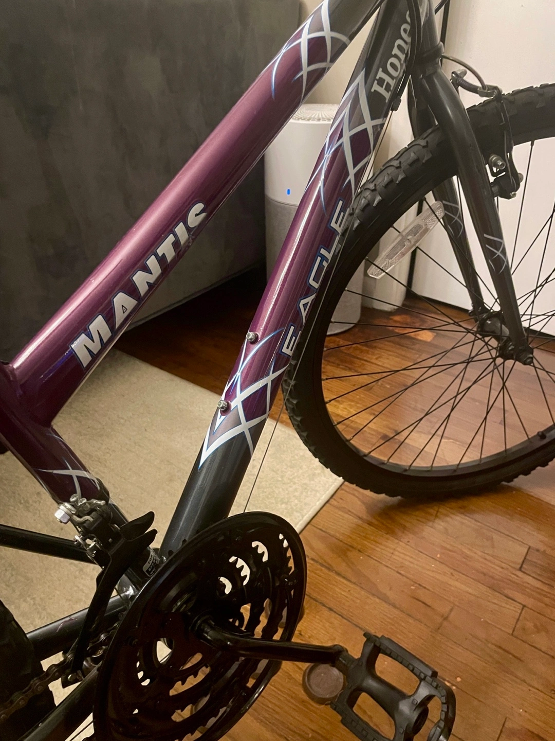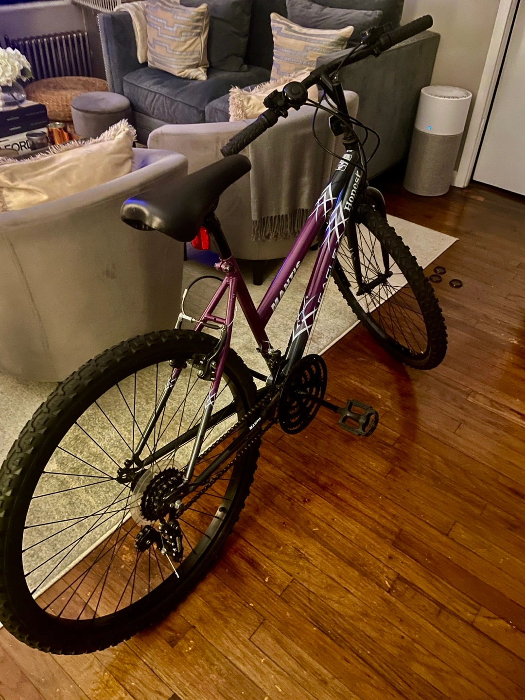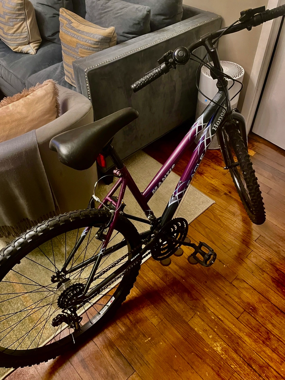 Purple and black mountain bike. Excellent condition. Ready to ride. Brakes have just been calibrated. Replaced with new black rims. Couple of minor scratches. Never left outdoors. Tire pump included.