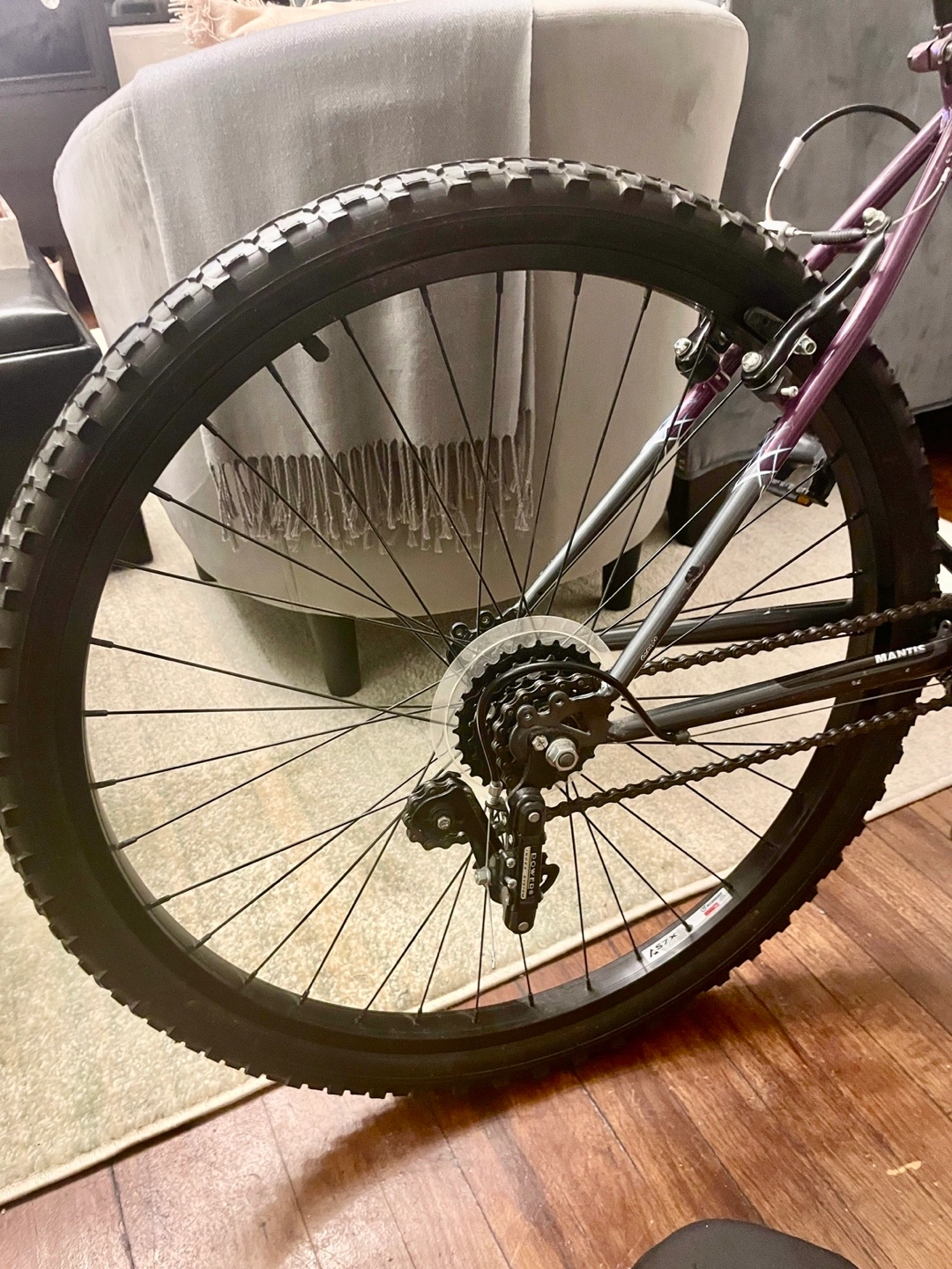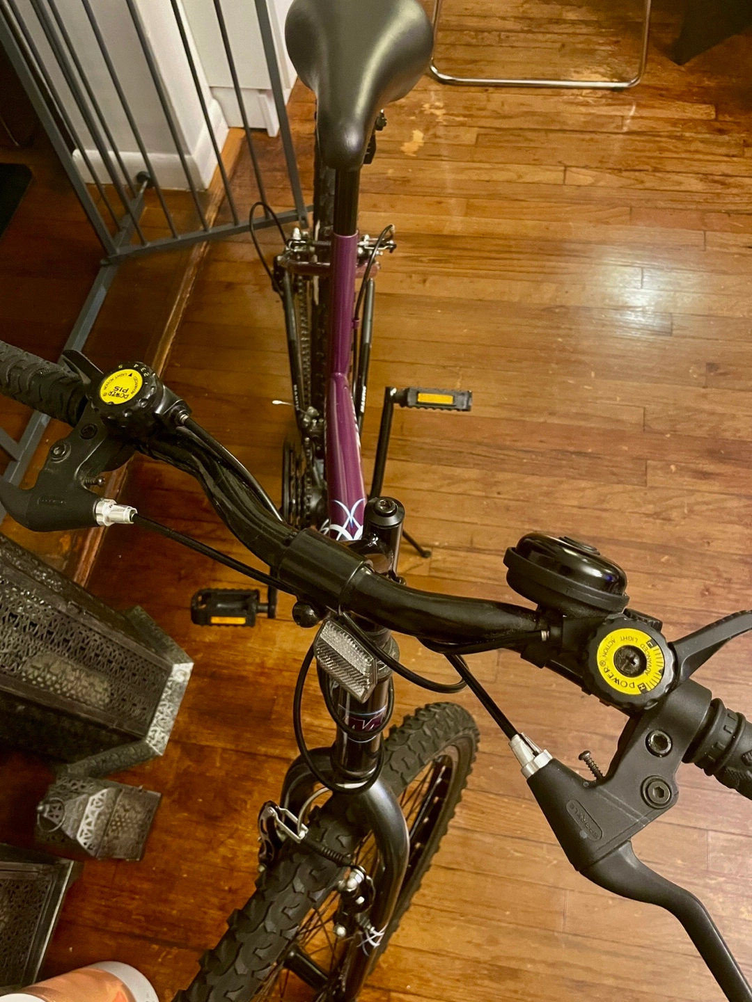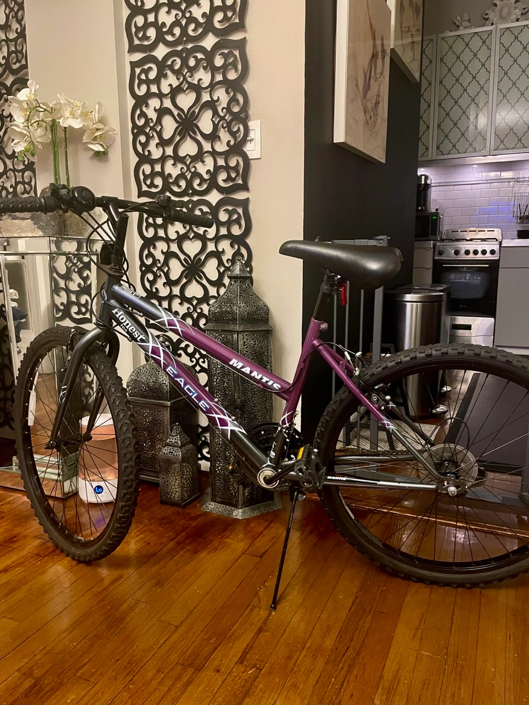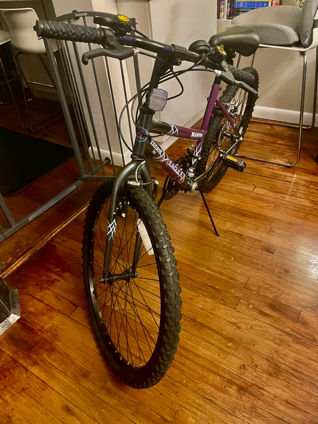 Purple and black mountain bike. Excellent condition. Ready to ride. Brakes have just been calibrated. Replaced with new black rims. Couple of minor scratches. Never left outdoors. Tire pump included.