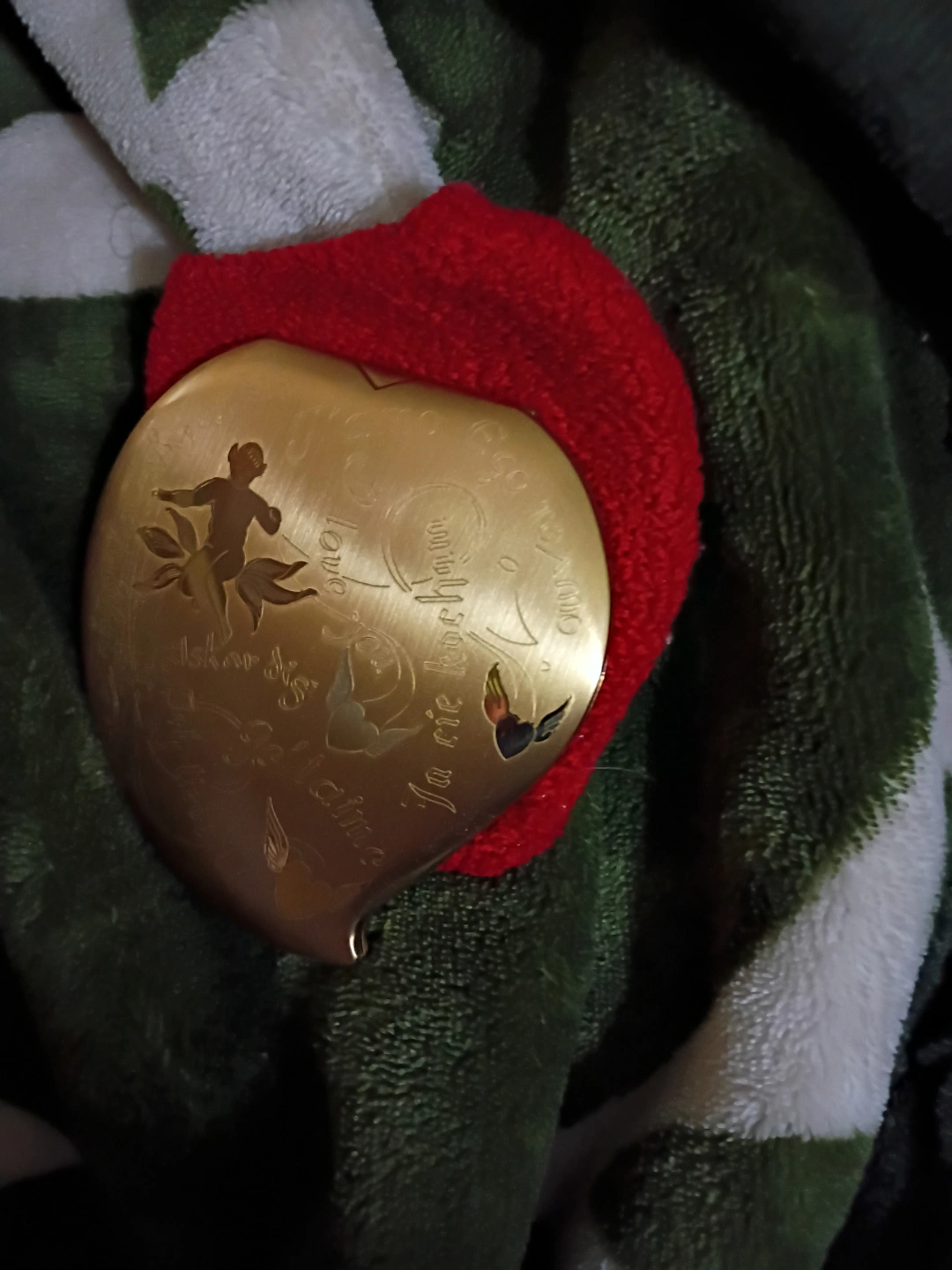 Unique vintage compact mirror. Gold-tone metal. Features an engraved design. Red velvet pouch included. Great for collectors.