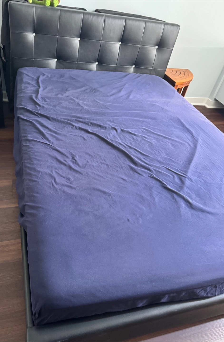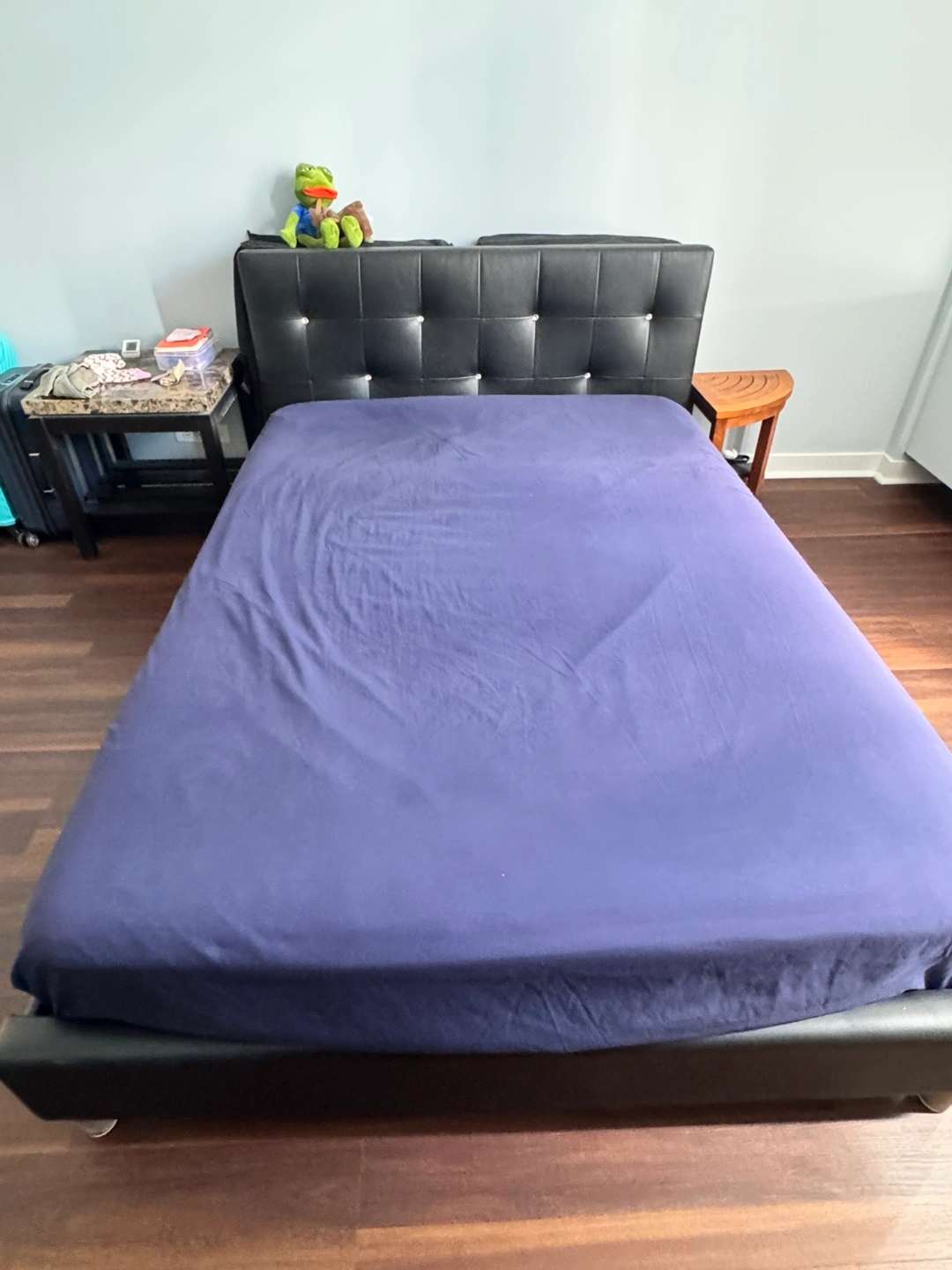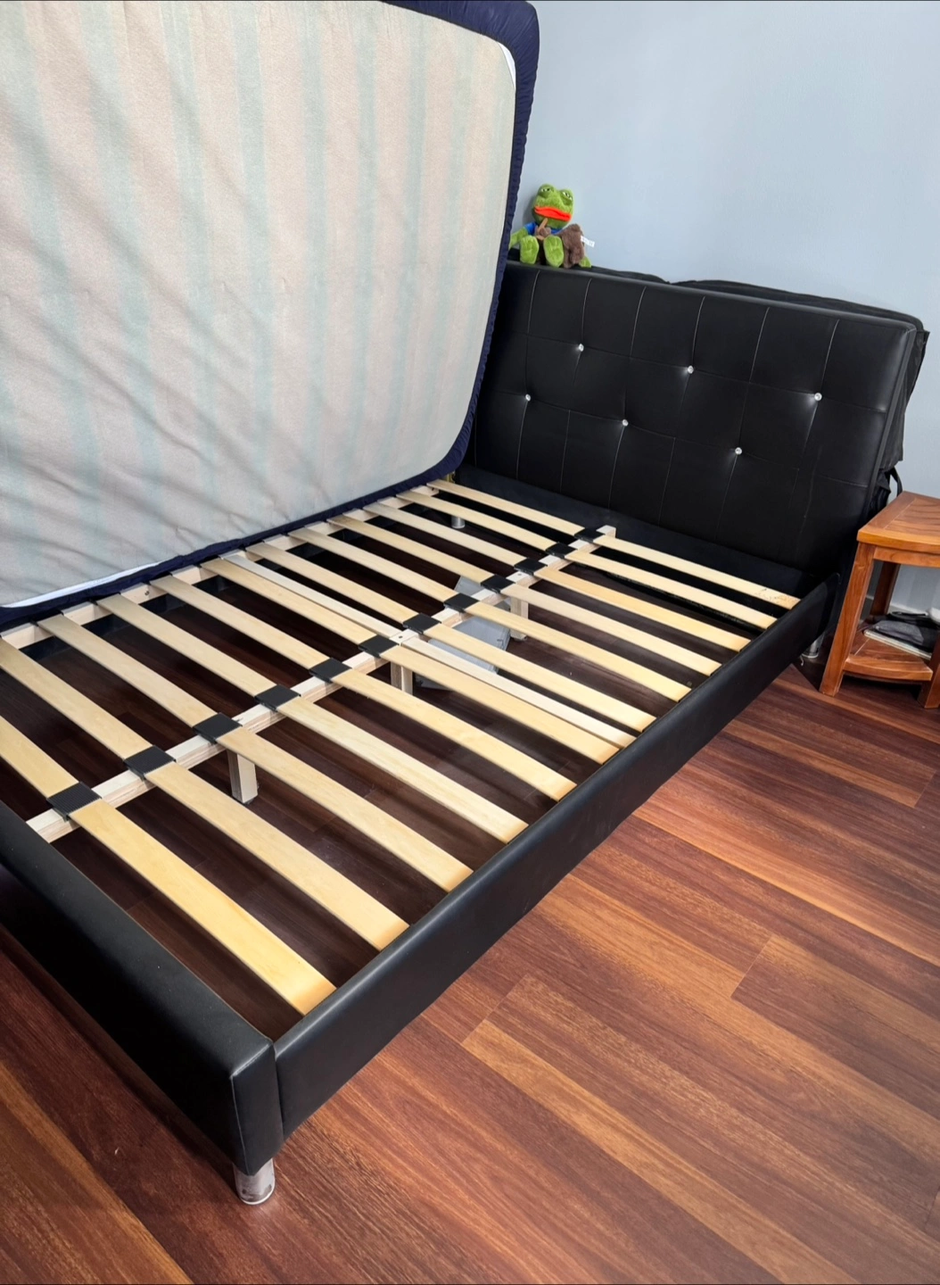 Full size bed frame. Black faux leather headboard and footboard. Wooden slats included. Minimal assembly required. Good condition. very strong, lot of life left. from a smoke-free and pet-free home.