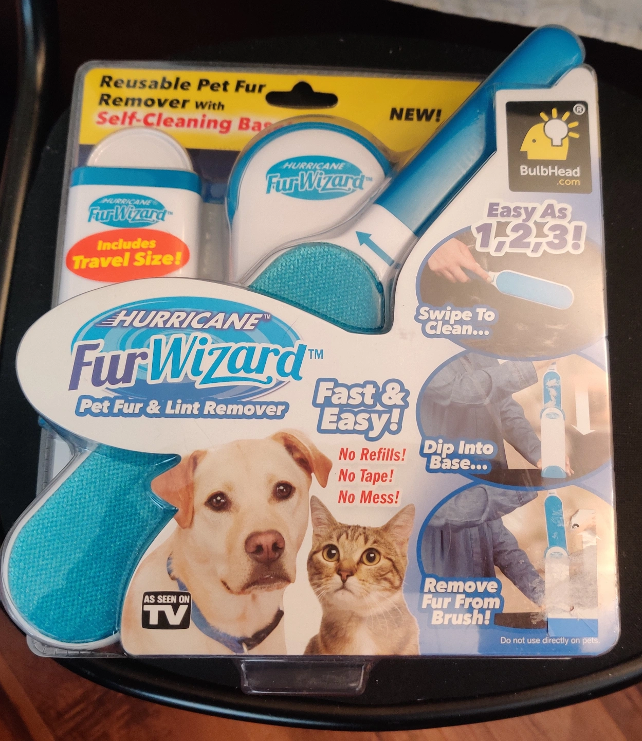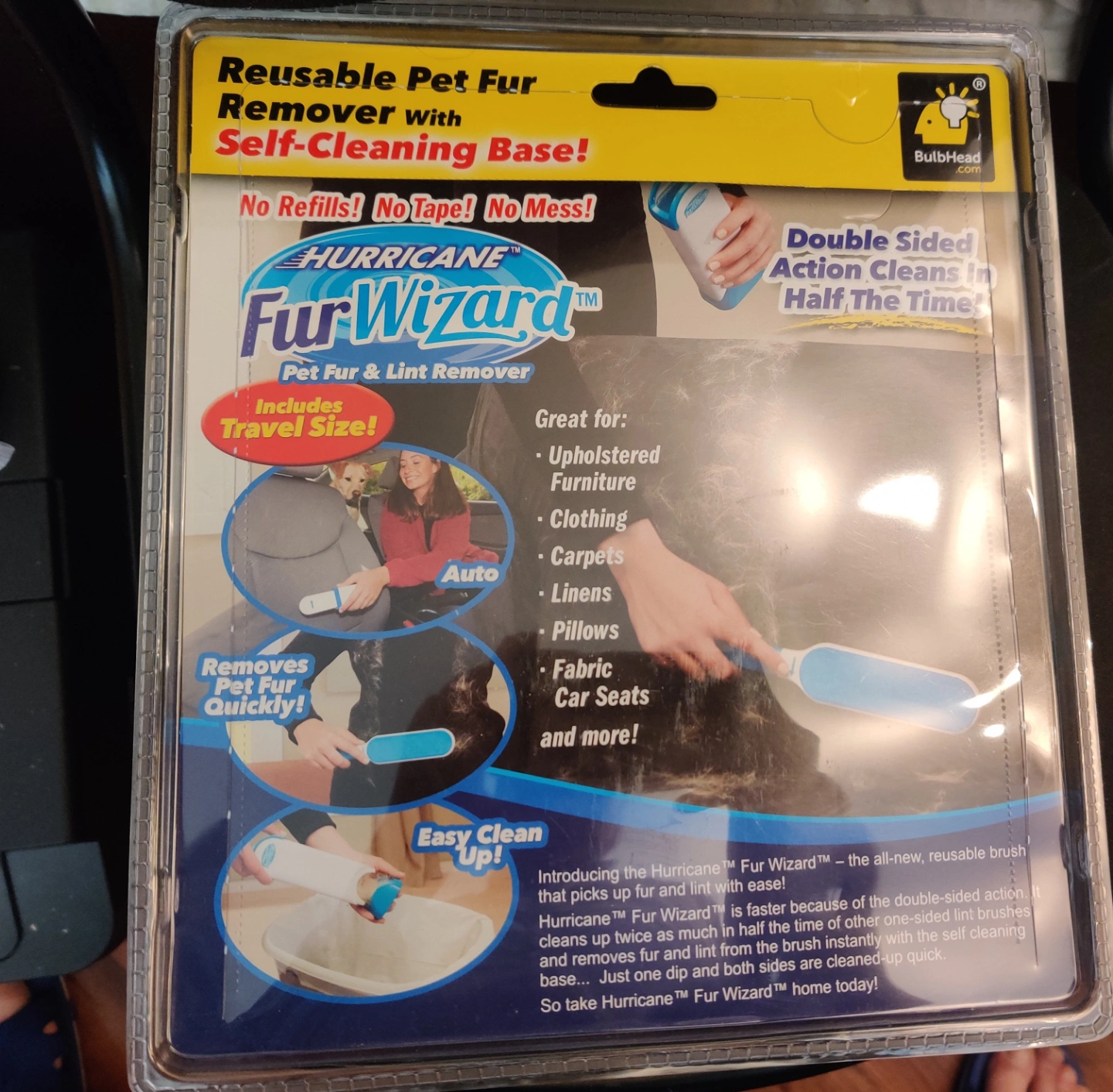 New in box! Reusable pet fur and lint remover. Self-cleaning base. Includes travel size. Fast and easy! No refills, no tape, no mess! Great for upholstered furniture, clothing, carpets, linens, pillows, fabric, car seats and more. Double-sided action cleans twice as fast.