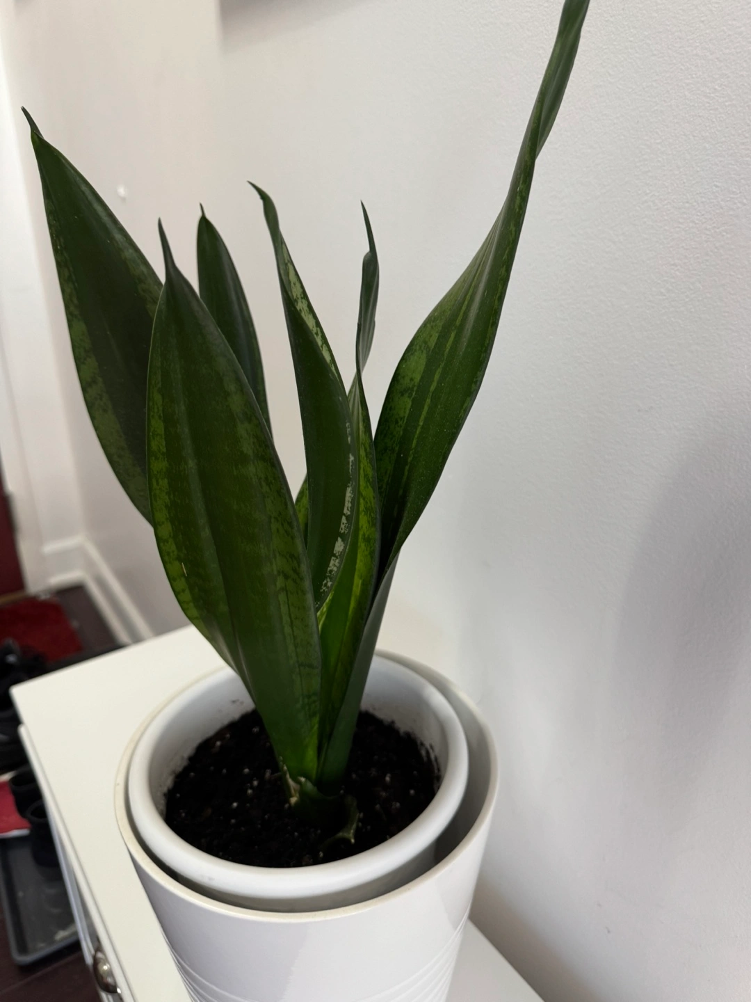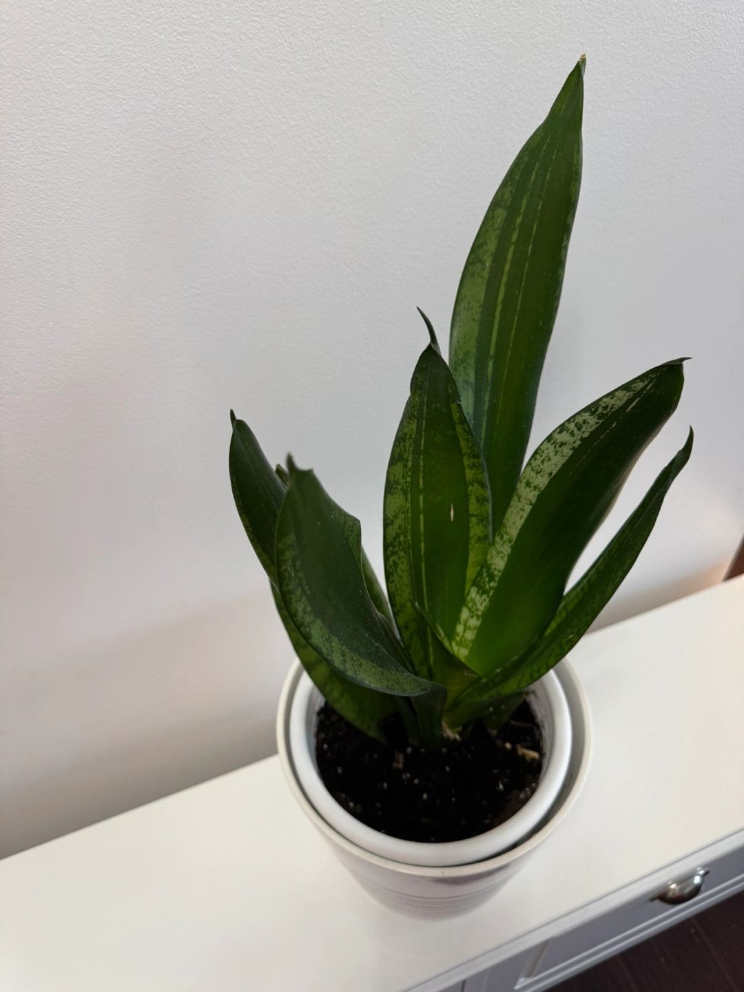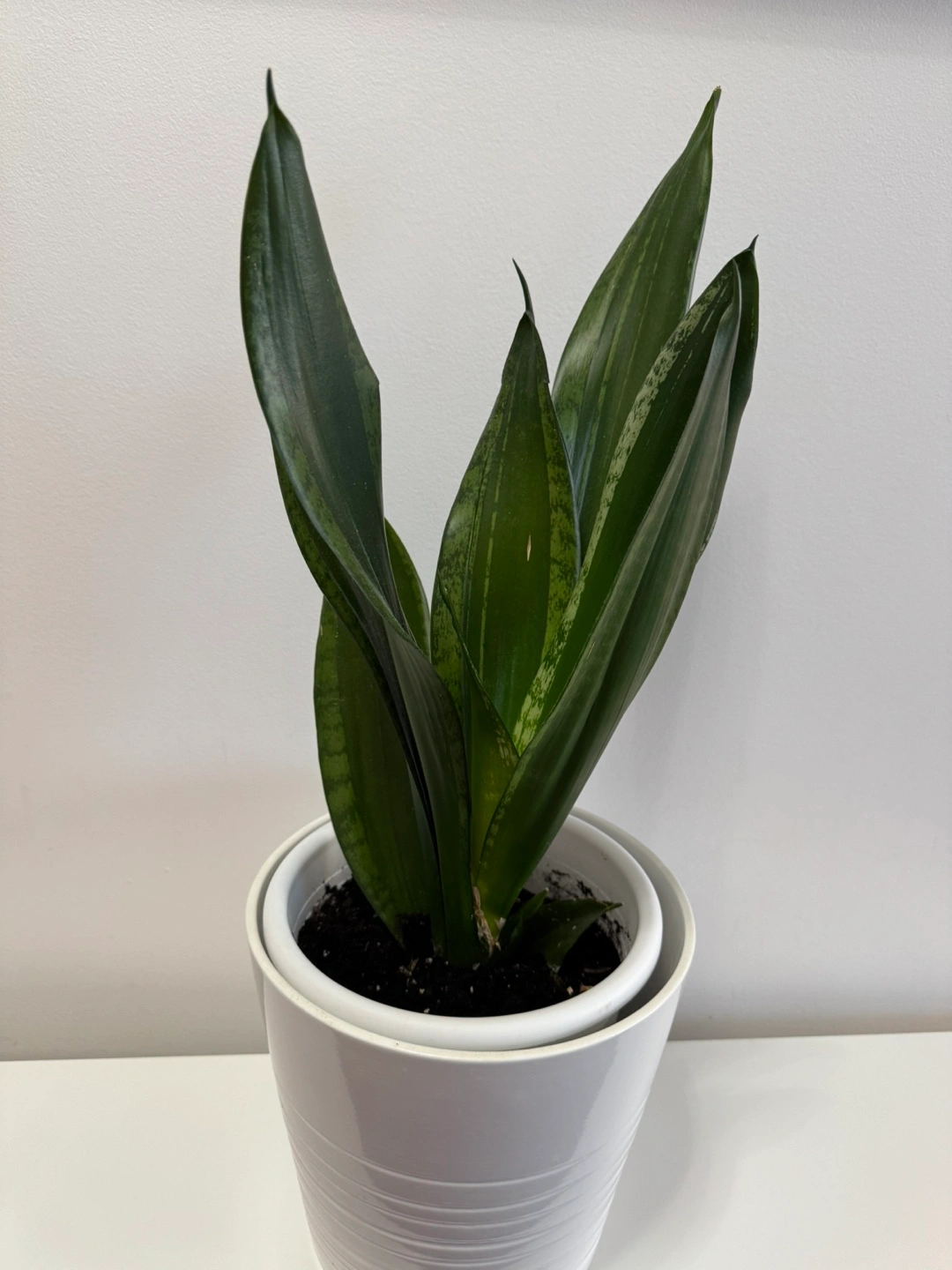 Healthy snake plant in a white ceramic pot. Dark green leaves with light green variegation. A great addition to your home décor.