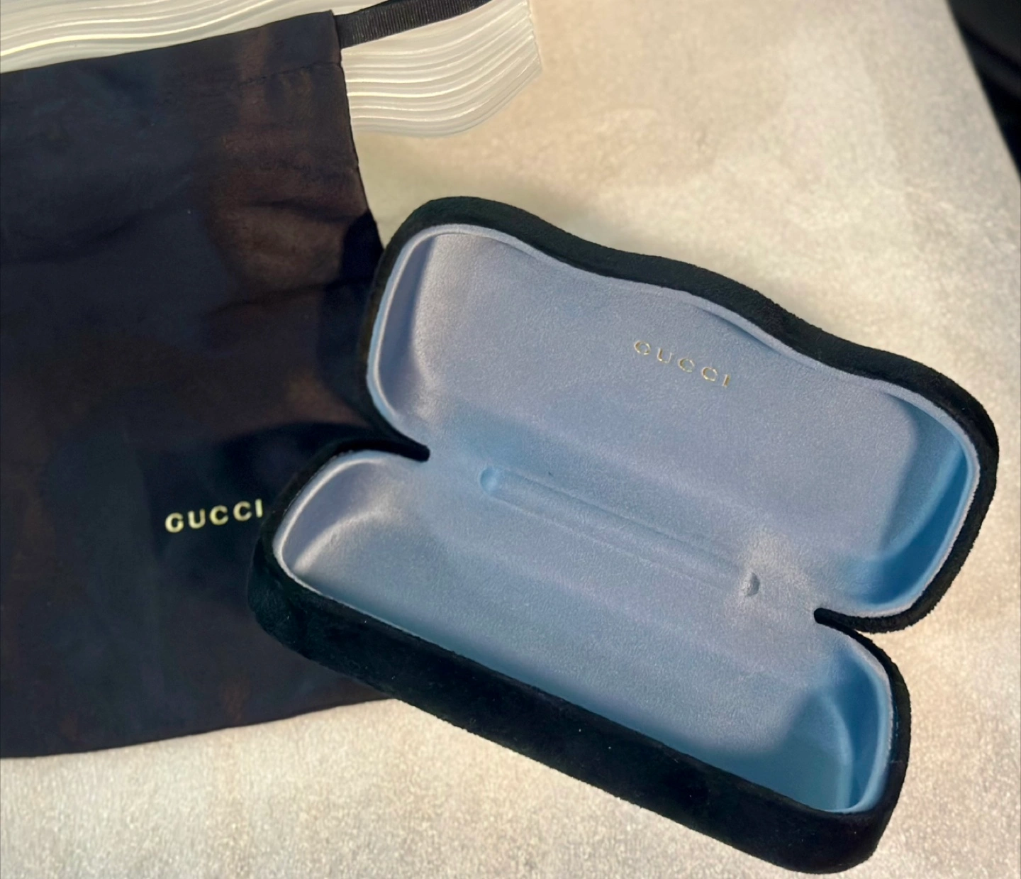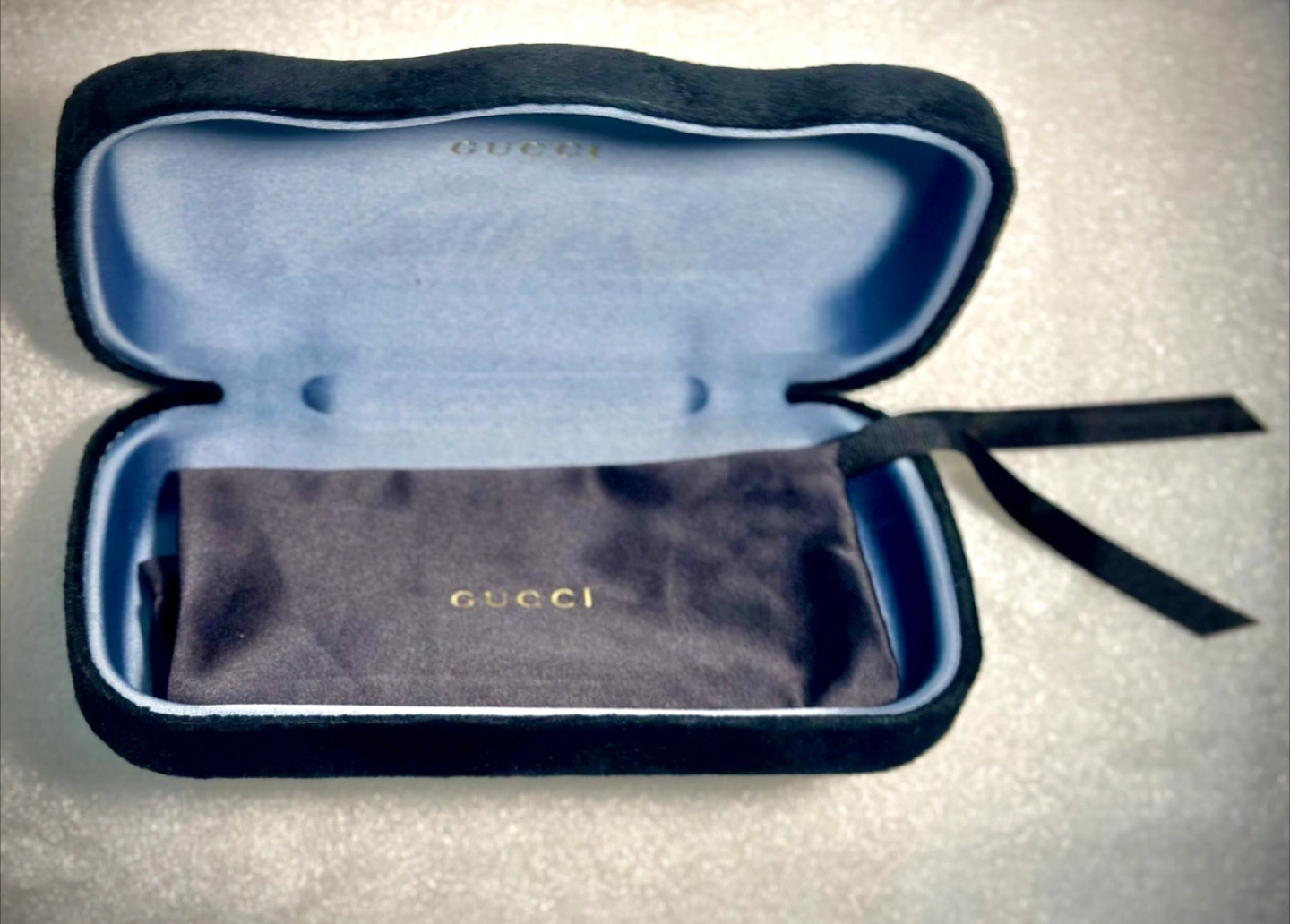166Black velvet Gucci eyewear case. Light blue interior. Includes a matching black velvet pouch. Gently used.