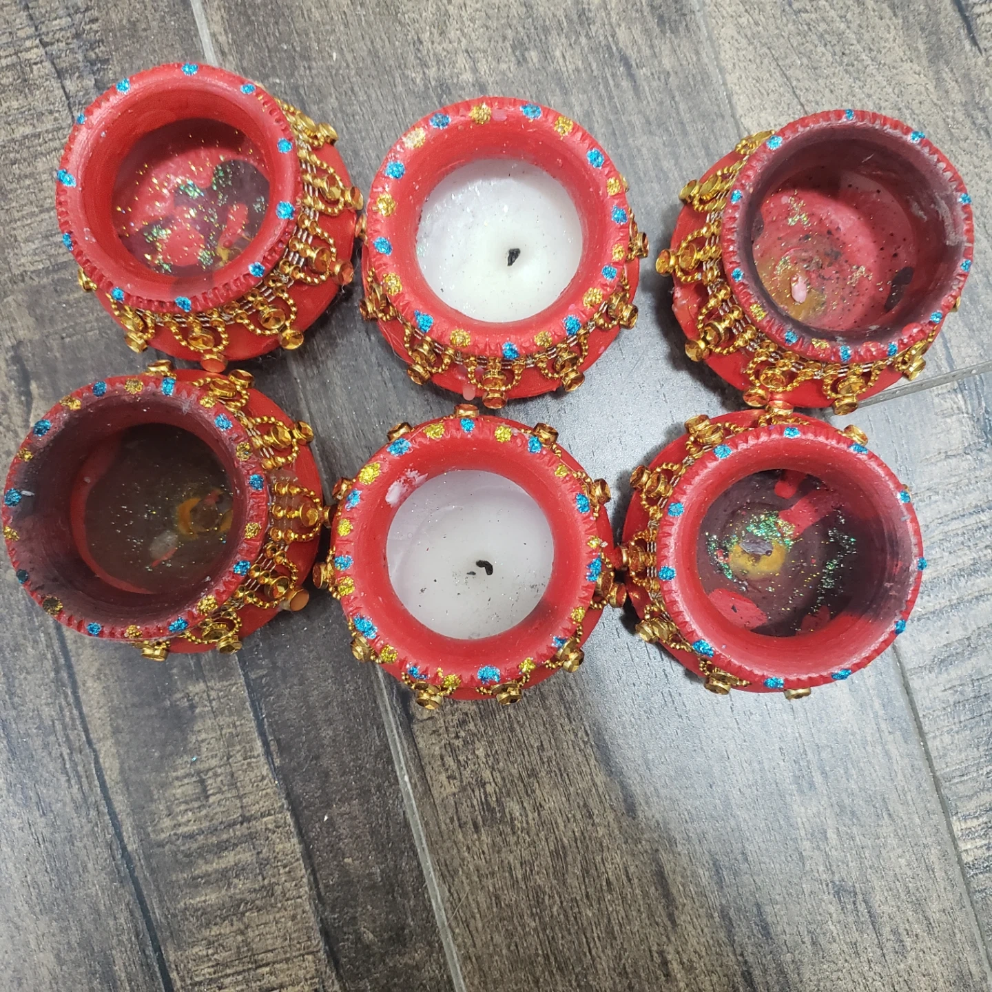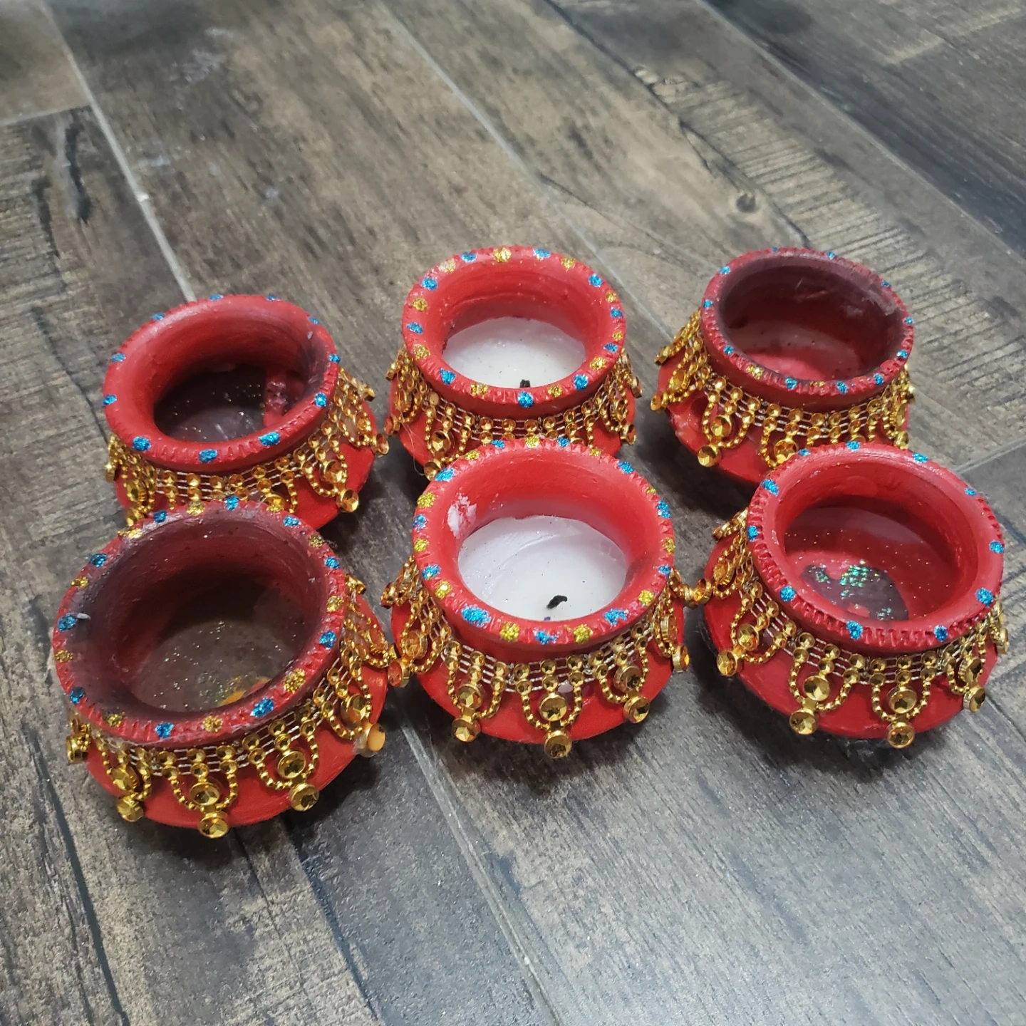 Six small red clay candle holders. Gold and blue embellishments. Perfect for Diwali or other celebrations. Used, but in good condition.