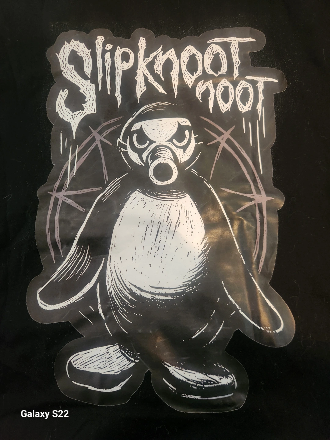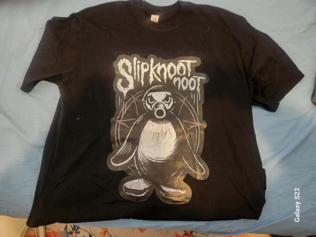 Black Slipknot band t-shirt. Features a unique penguin graphic wearing a gas mask. Large print on front. Short sleeves.100% cotton.