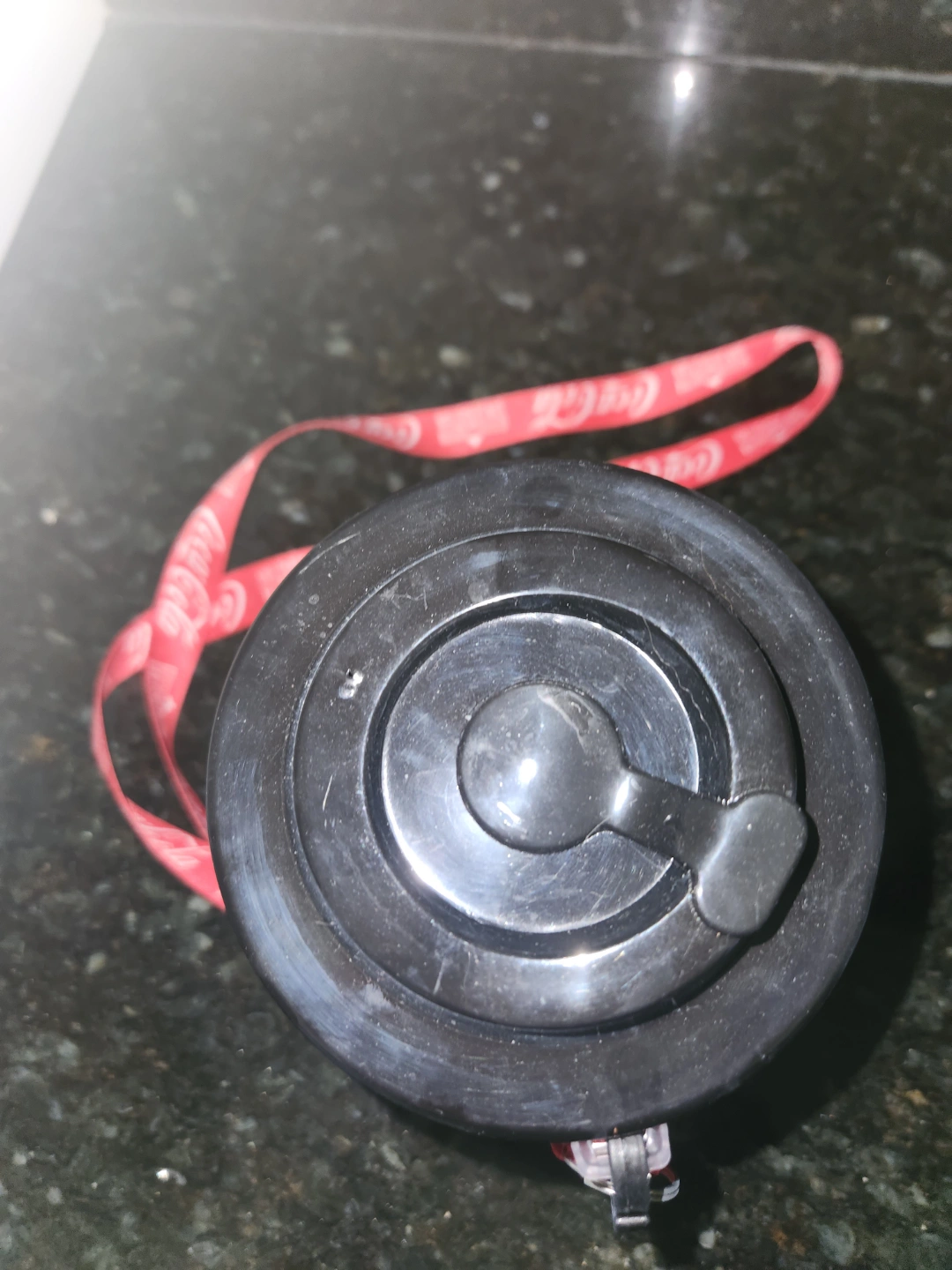 Red plastic cup with black lid and lanyard. Features Coca-Cola branding and San Sebastian festival design from Puerto Rico in January. Some minor damage visible.
