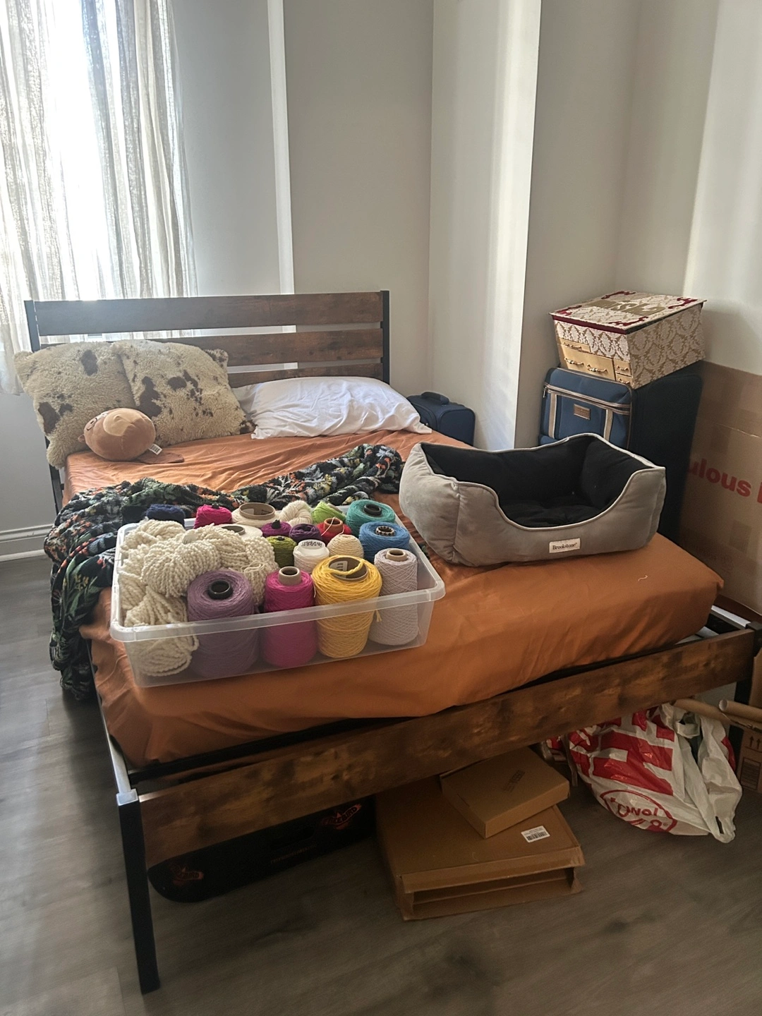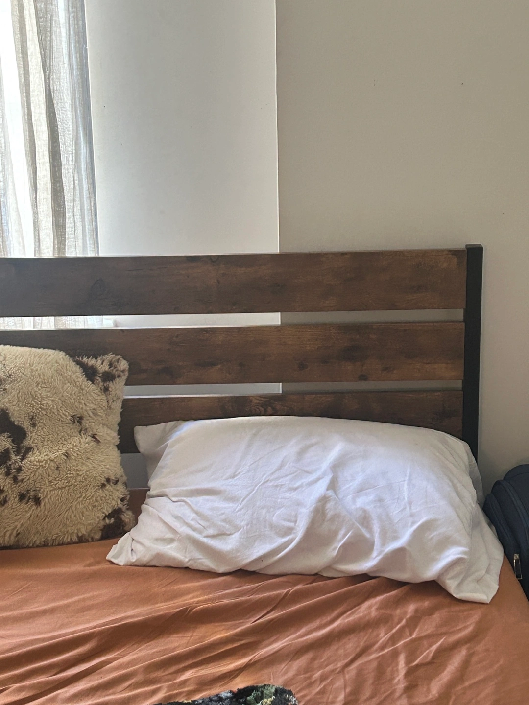 Full size bed frame. Dark brown wood and black metal. Minimal assembly required. Good condition. Includes headboard.
