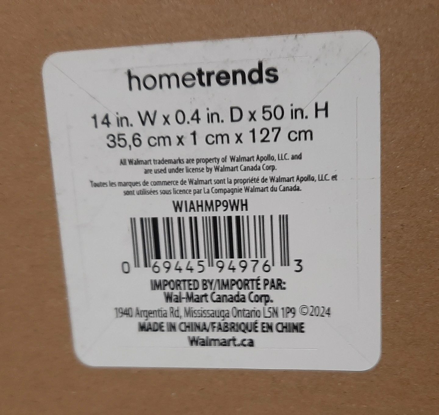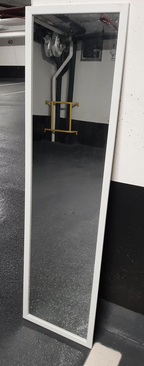 Full length mirror. White frame. Measures 14 inches wide by 50 inches high. Great for any room.