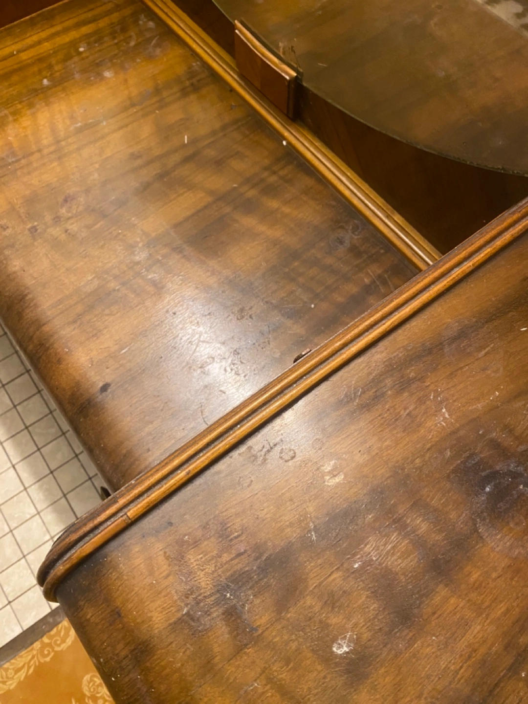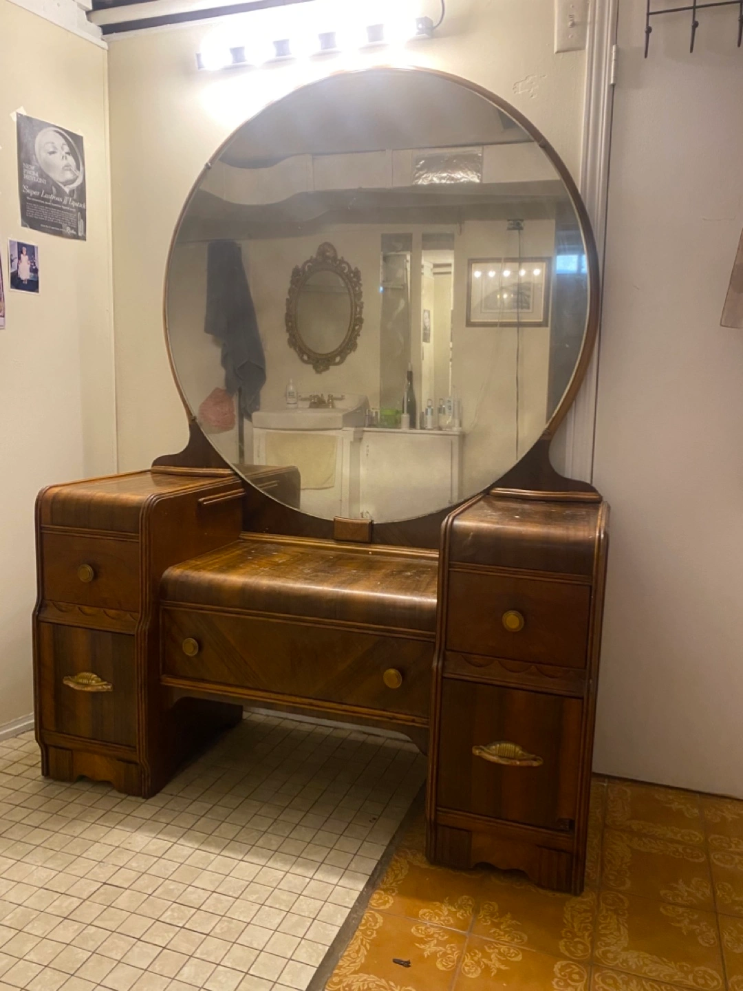 Wood vanity with large circular mirror and 5 drawers. Shows wear consistent with age & use (see image 3). All in all a very cool, retro piece.