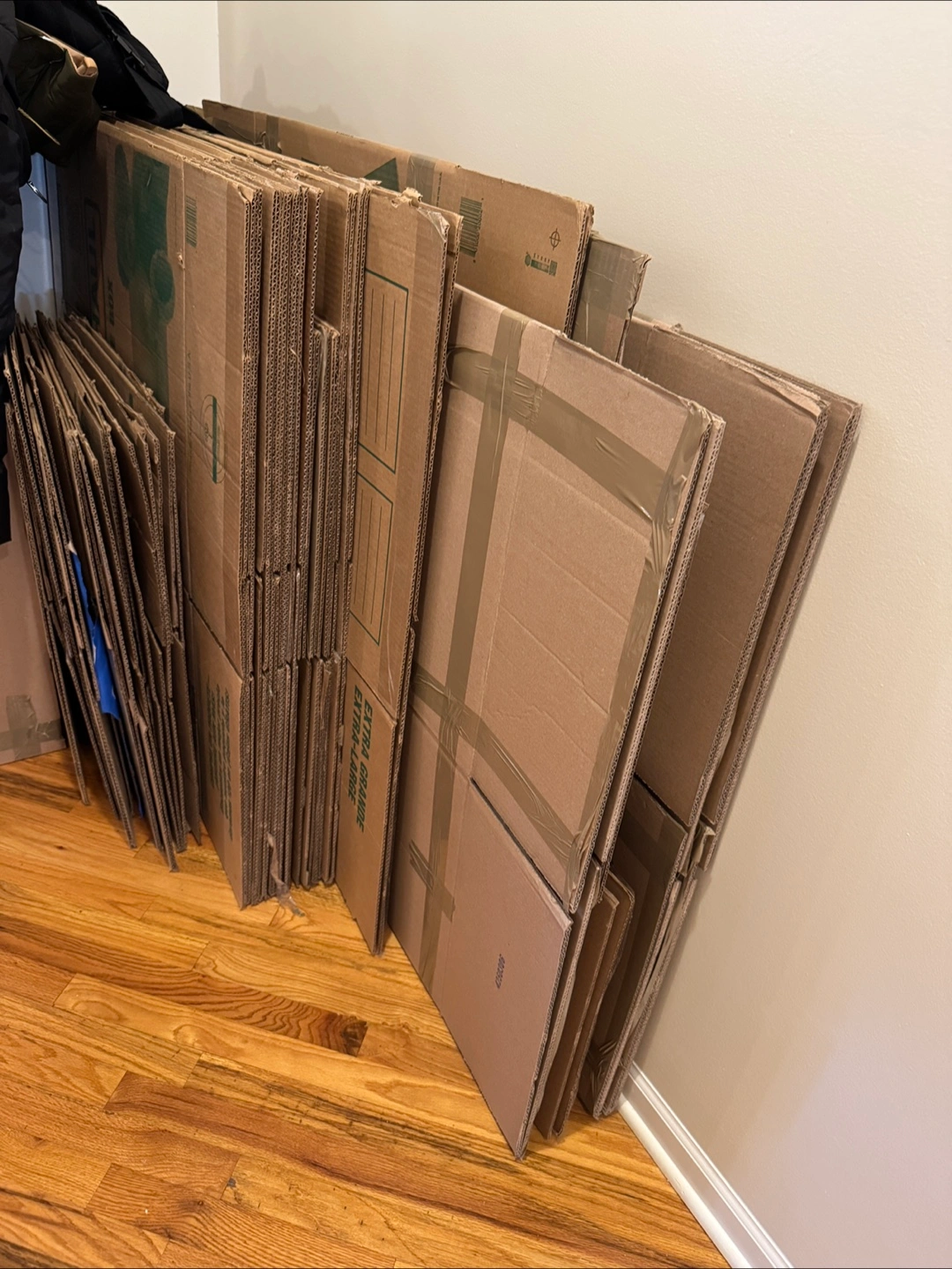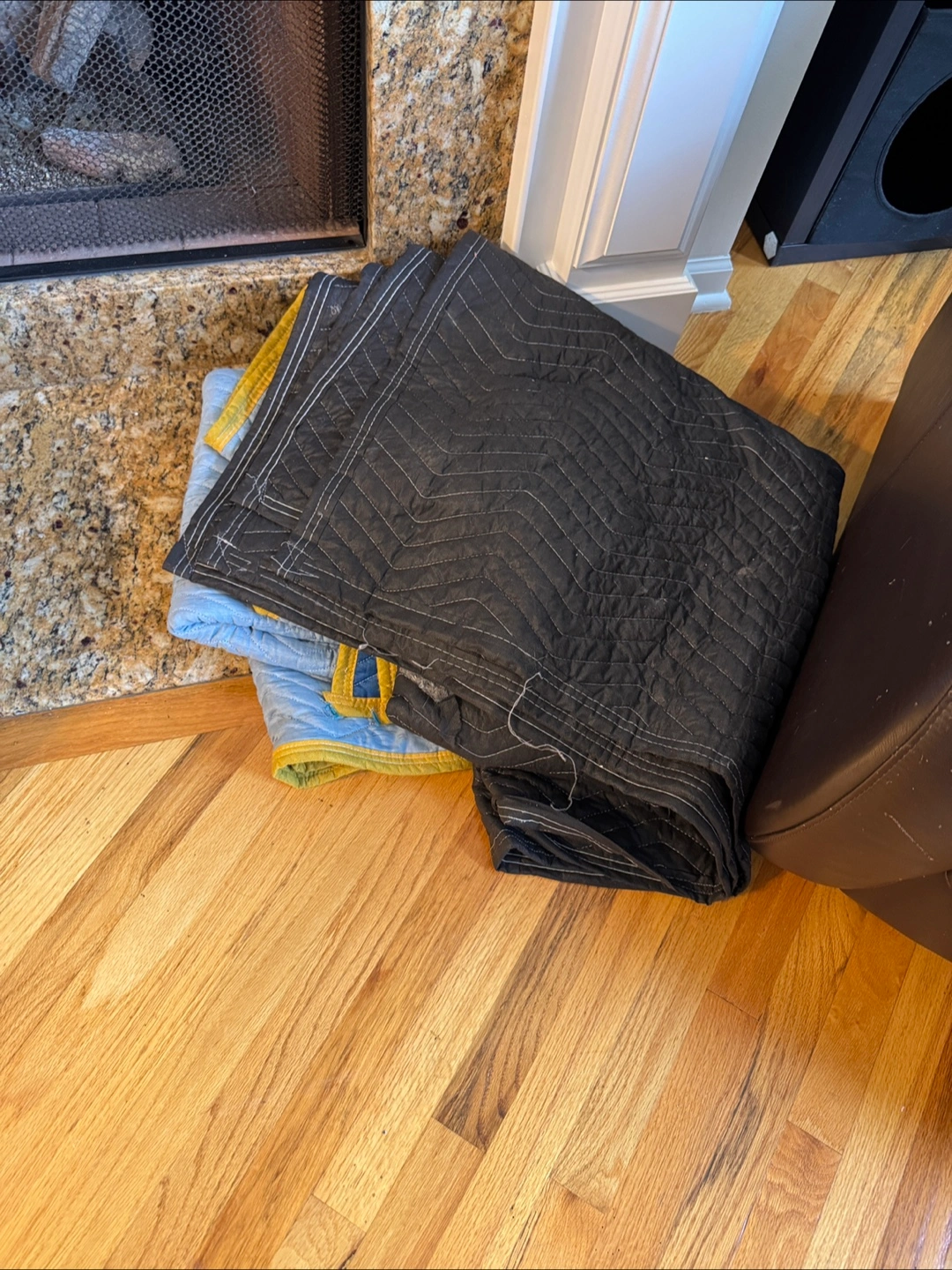 Once-used moving boxes in various sizes, including 1-2 wardrobes. 2 packing/storage blankets too.