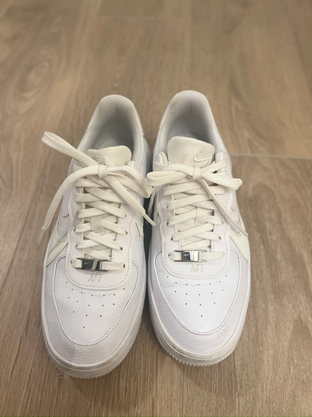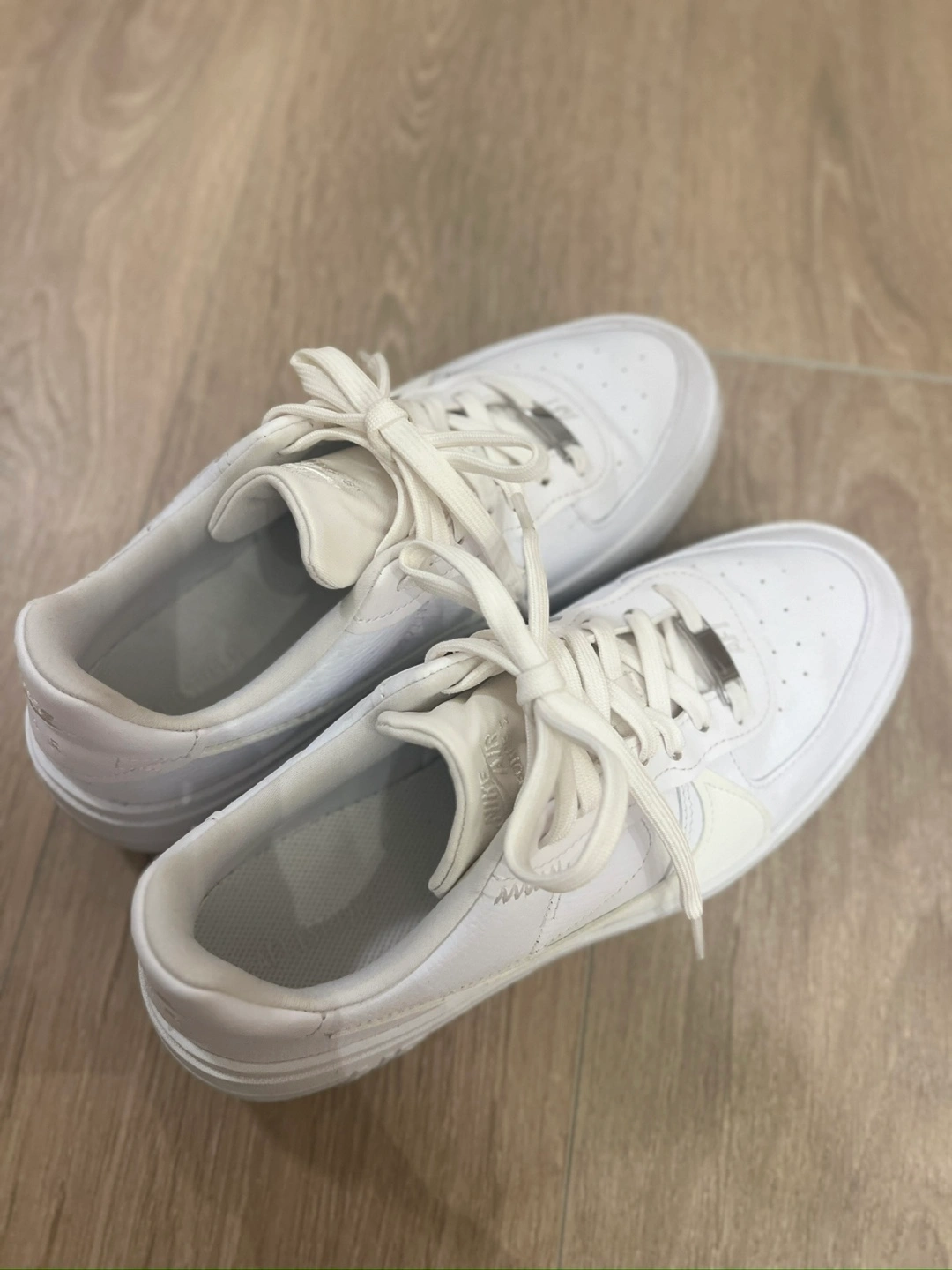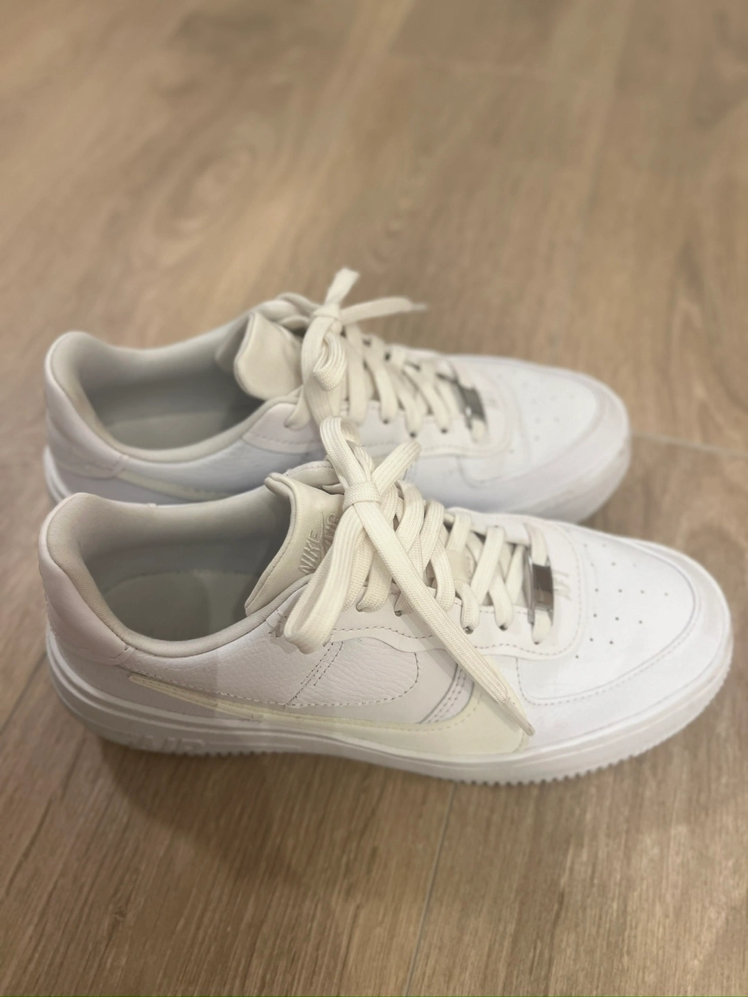 Women's Nike Air Force 1 Shadow sneakers. All white leather. Clean style. Casual wear.