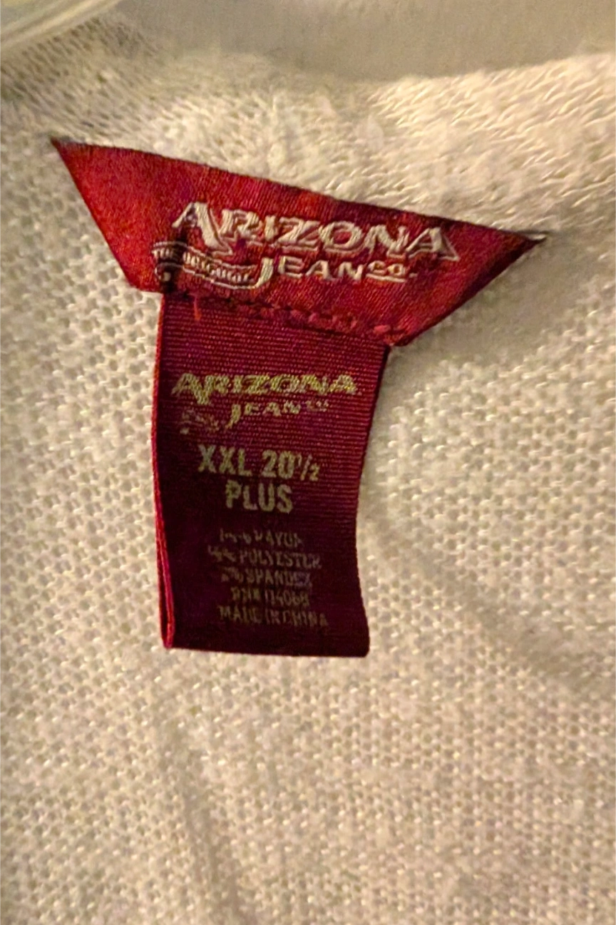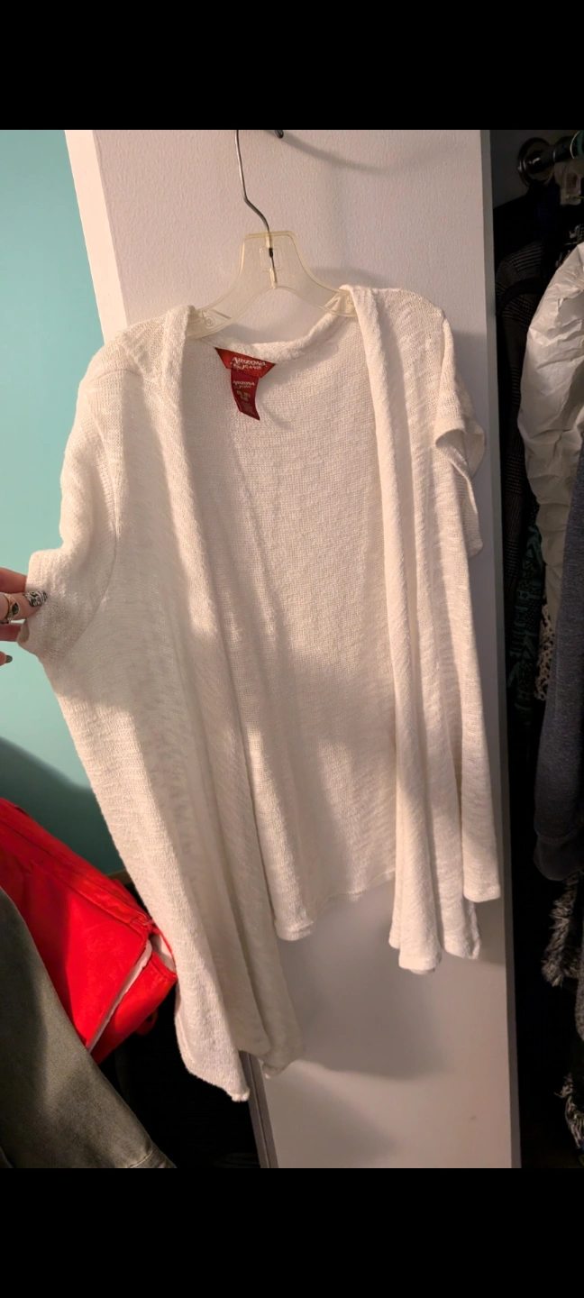 Off-white short sleeve cardigan. Open front. Labeled size XXL Plus but fits more like L. Soft material. From home with dogs. North Center (Chicago) near Damen & Montrose