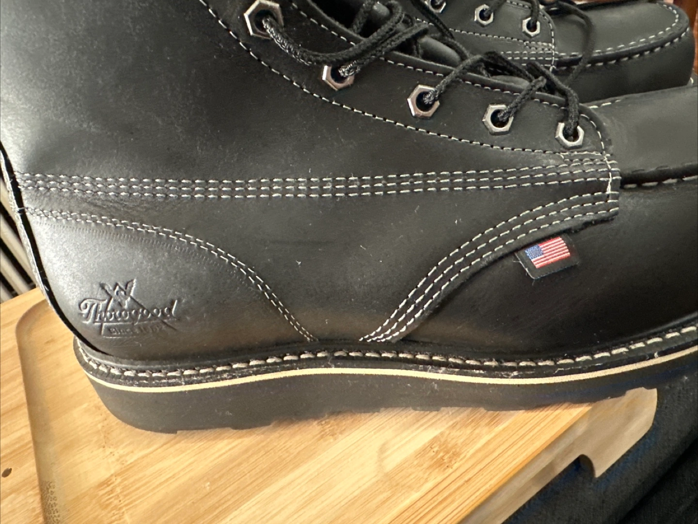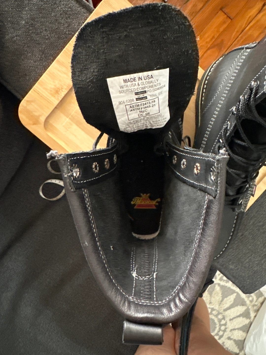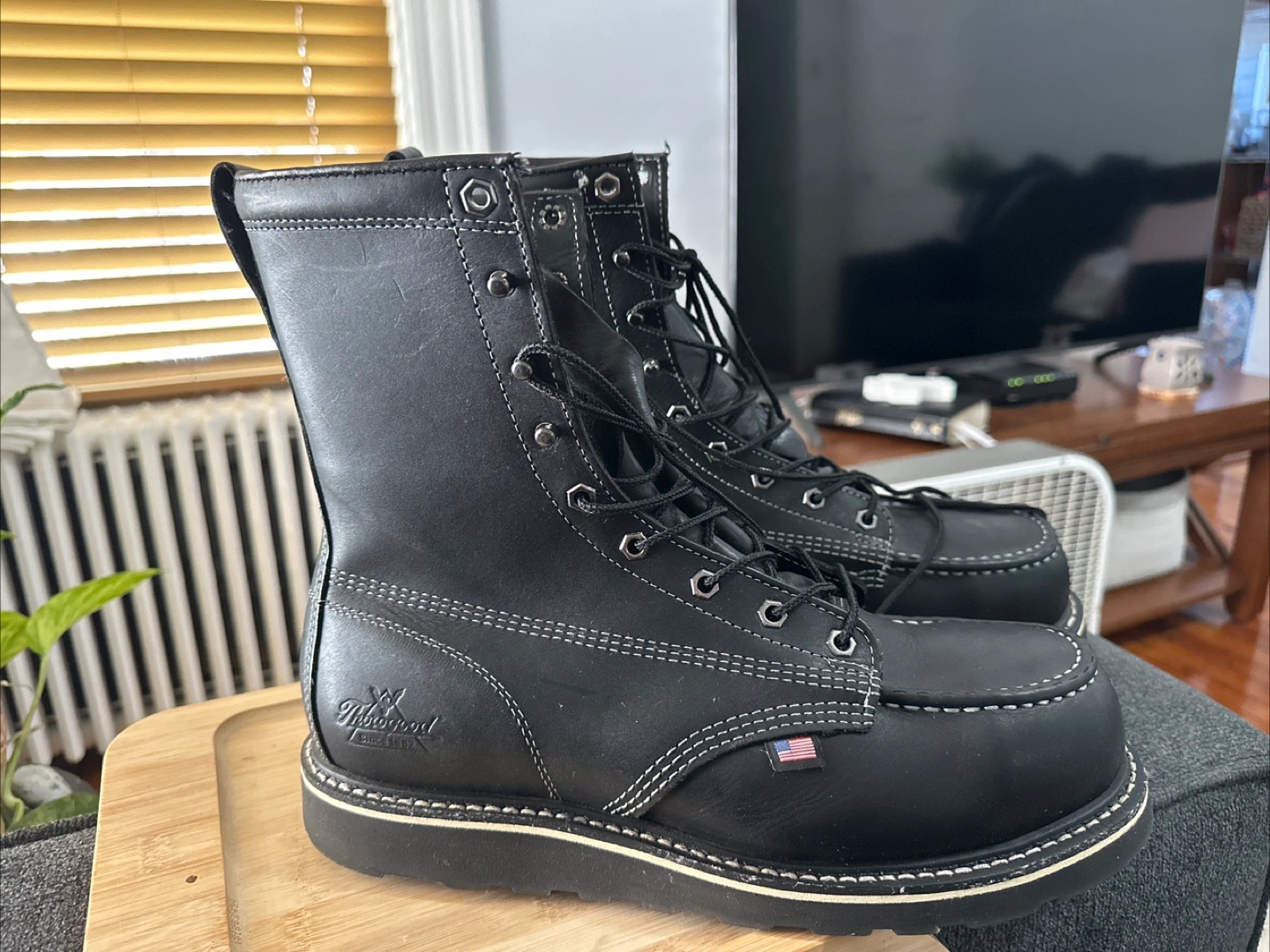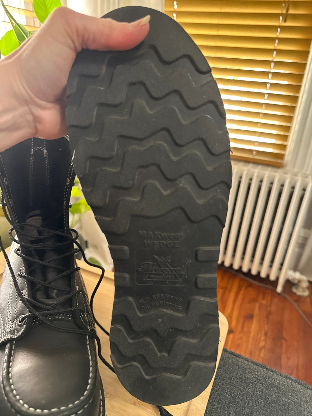 Pair of black leather work boots. Lace-up style. Oil-resisting soles. Made in the USA with globally sourced components. Good condition.