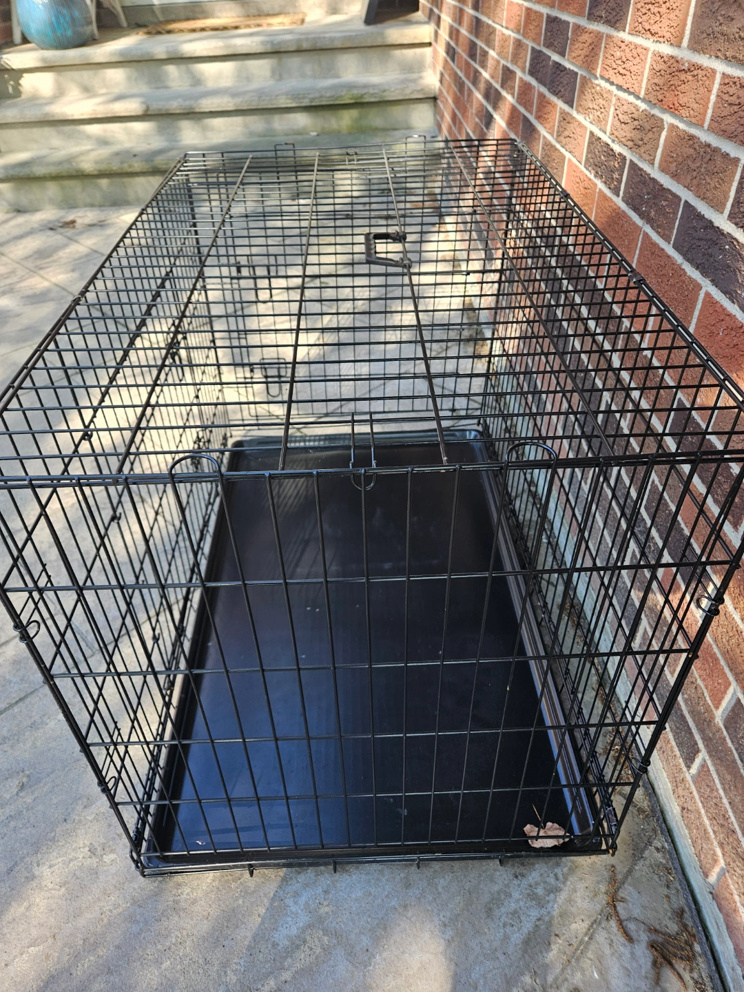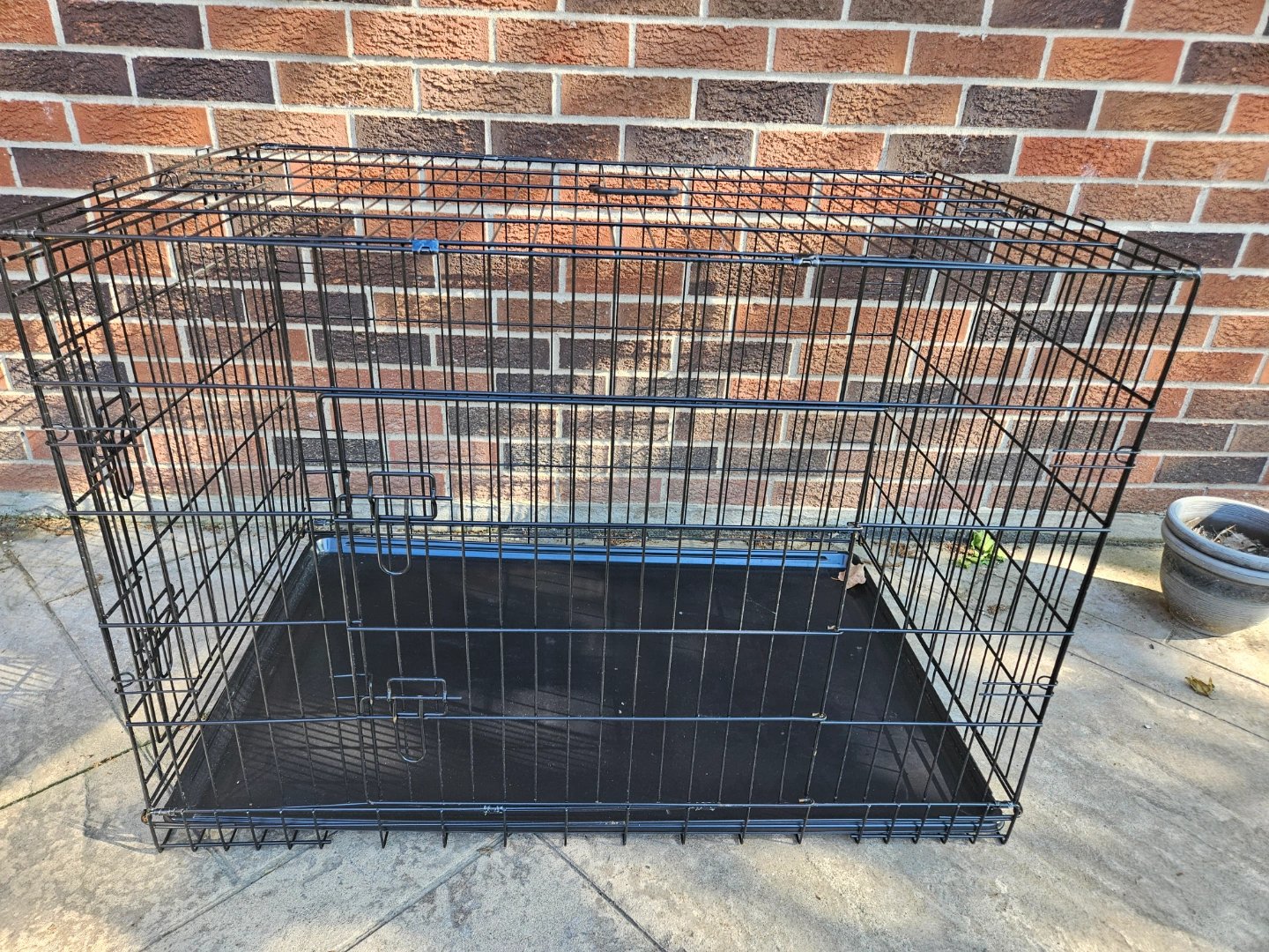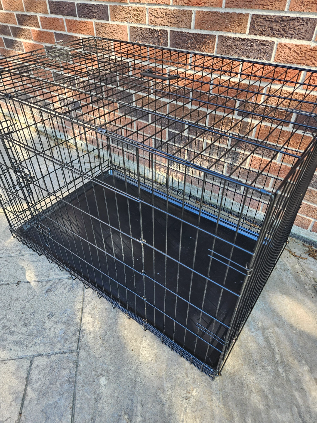 Large dog crate, black metal construction. Features a pull-out tray. Suitable for medium to large dogs. Used condition. 42"L, 26.5"D, 29"H comes with tray