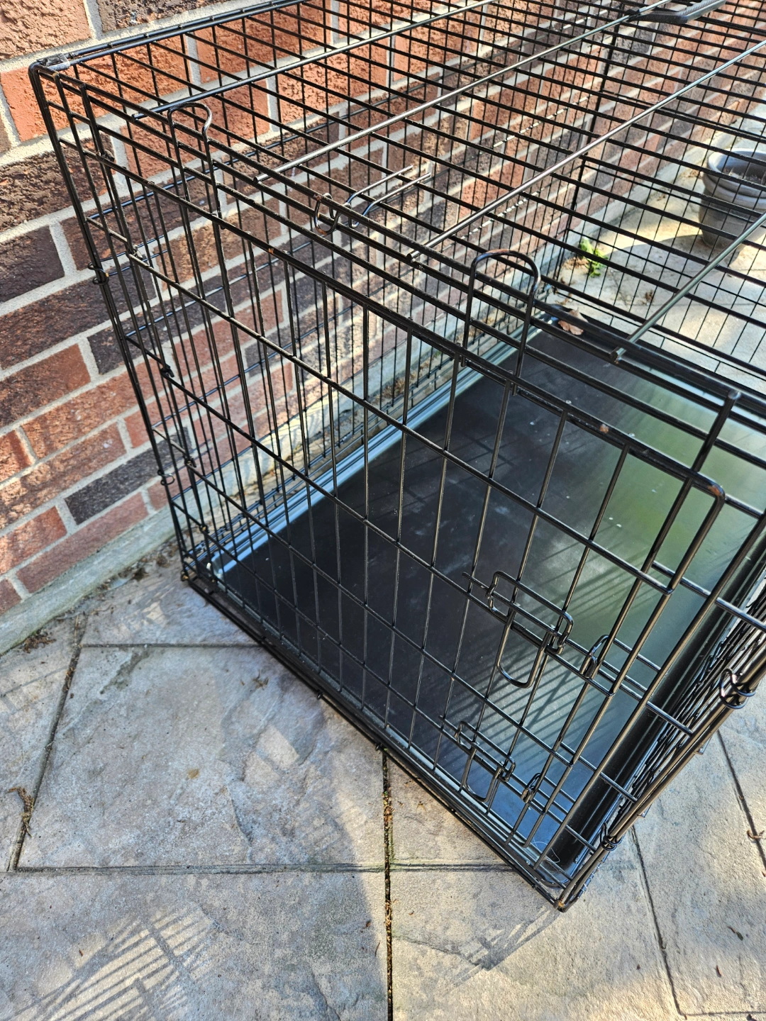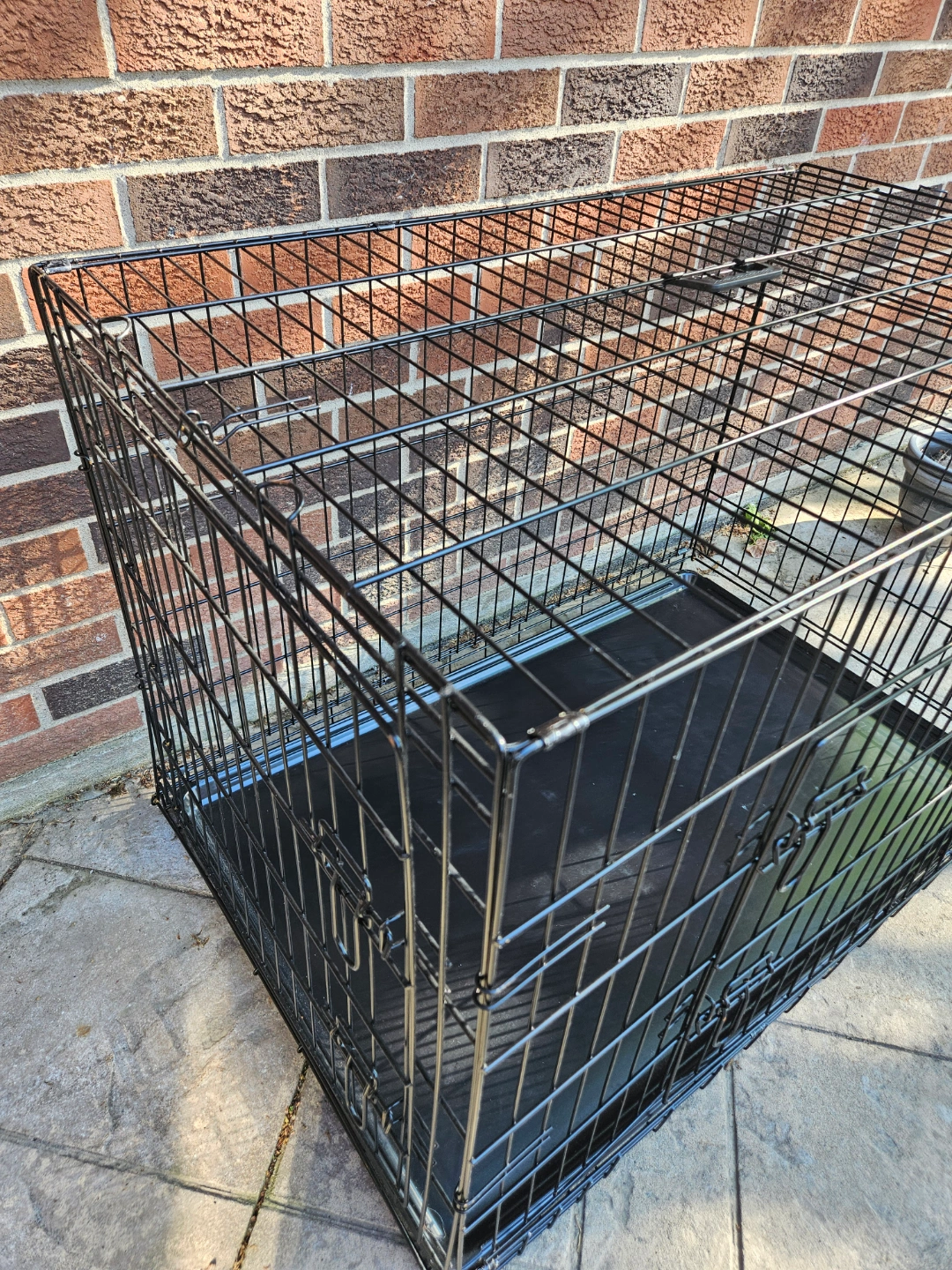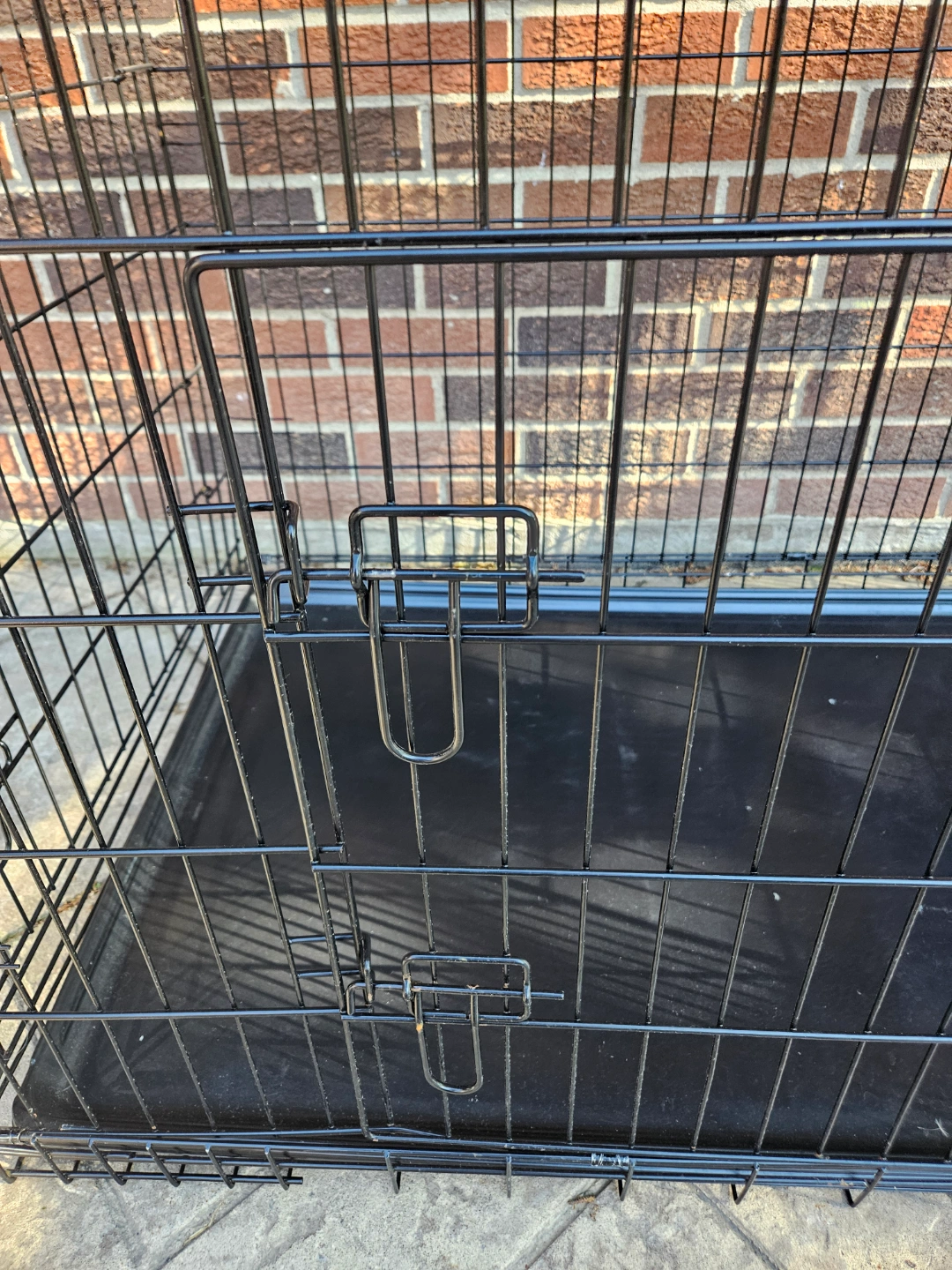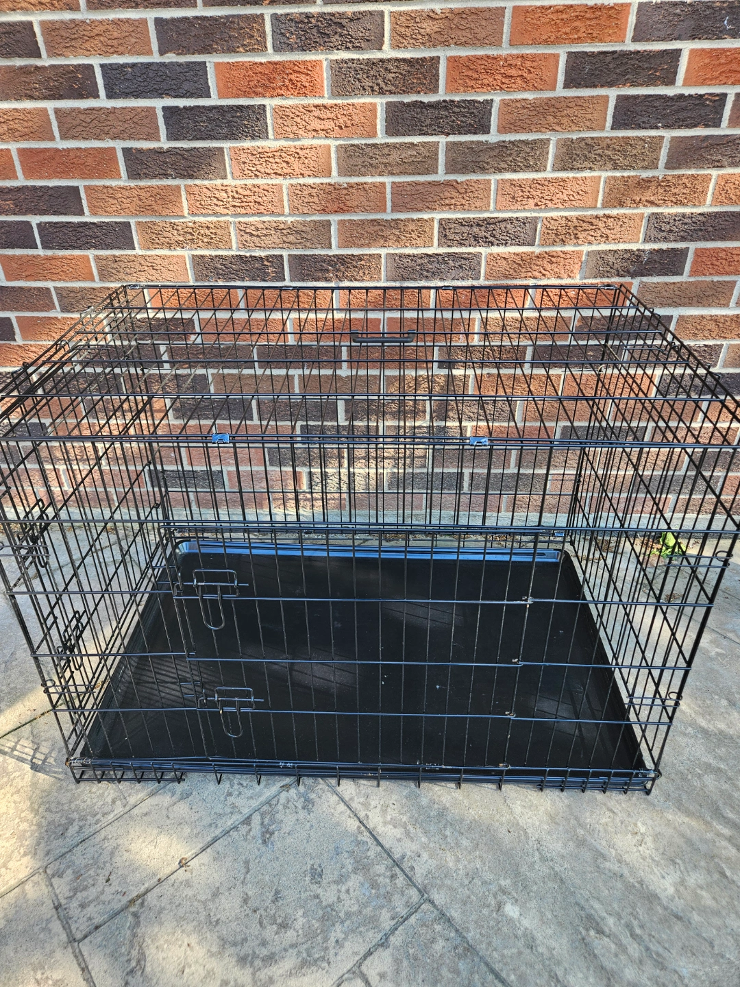 Large dog crate, black metal construction. Features a pull-out tray. Suitable for medium to large dogs. Used condition. 42"L, 26.5"D, 29"H comes with tray