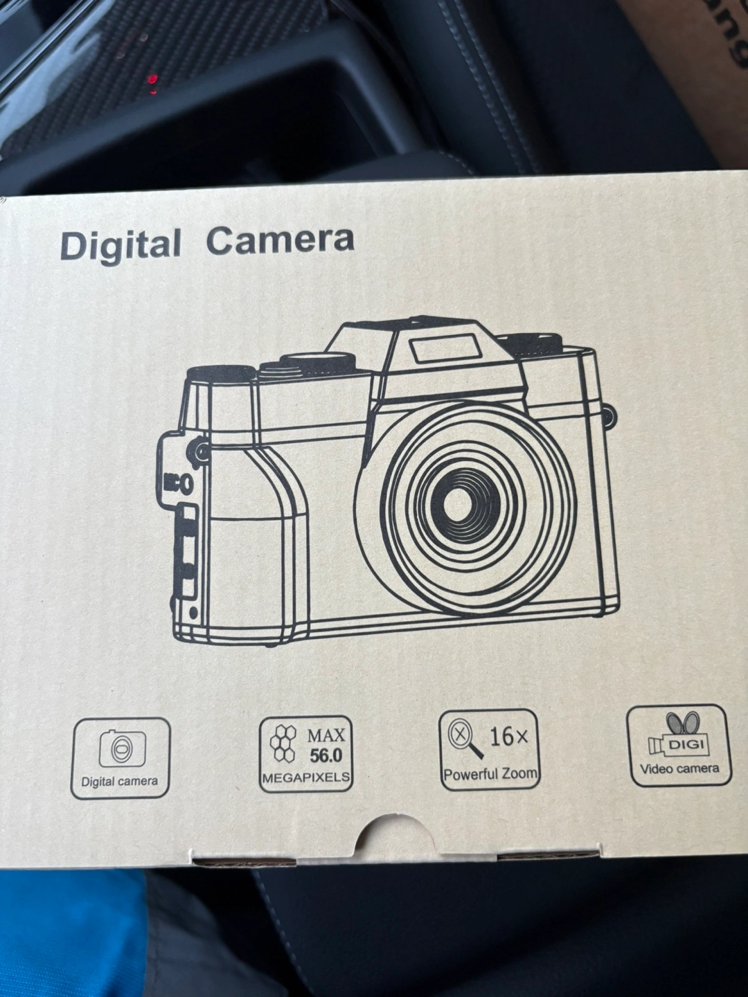 New digital camera. Features 16x powerful zoom and 56.0 megapixels. Includes 4GB Micro SD card. Made in China.