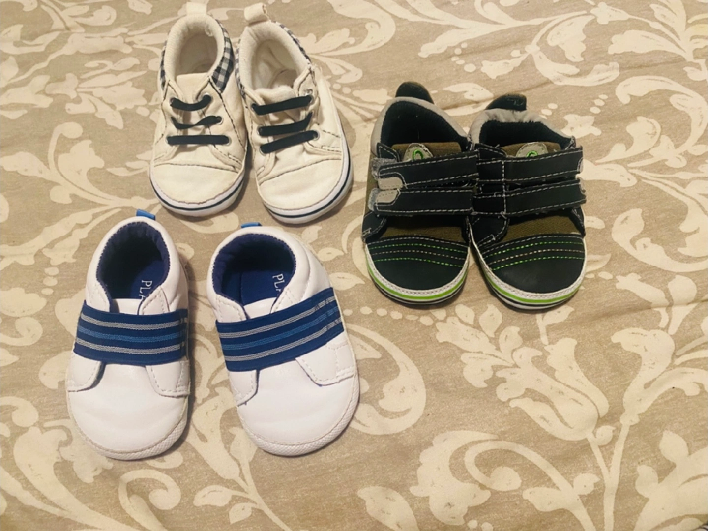 Bundle of six baby boy shoes. Variety of colours and styles. Sizes vary. Great for crawling and first steps.