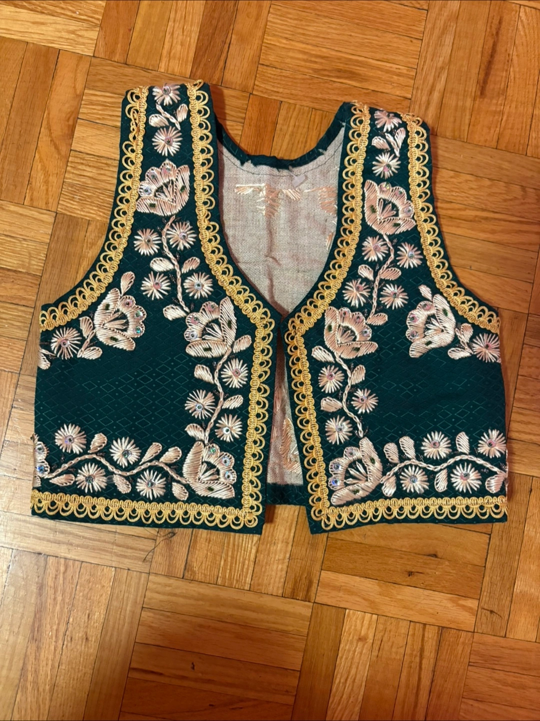 Dark green traditional vest. Features gold embroidery and embellishments. Sleeveless. Front closure.