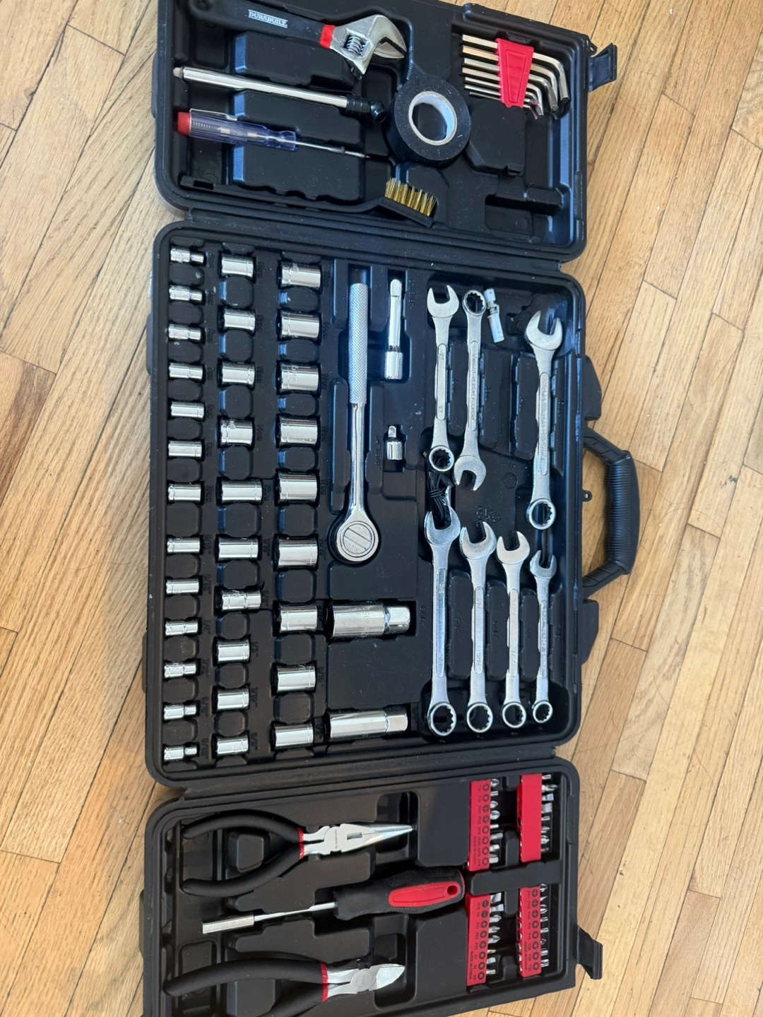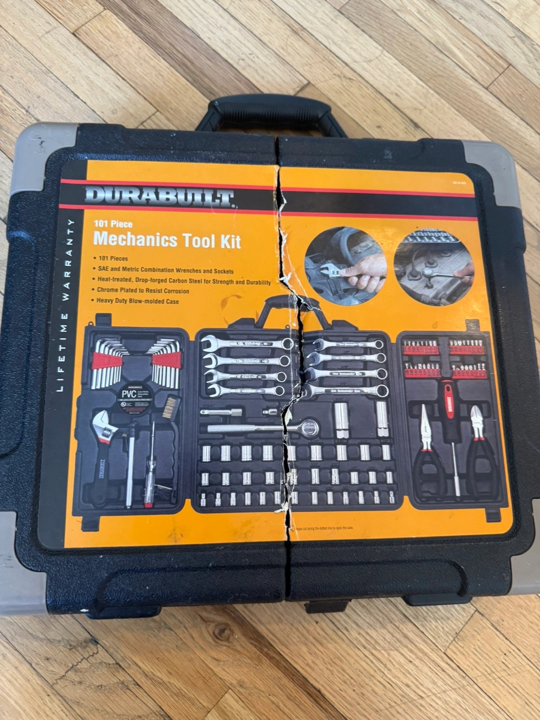 Complete mechanics tool set. 101 pieces. Includes sockets, wrenches, screwdrivers, pliers, and more. Heavy-duty blow-molded case. Lifetime warranty.