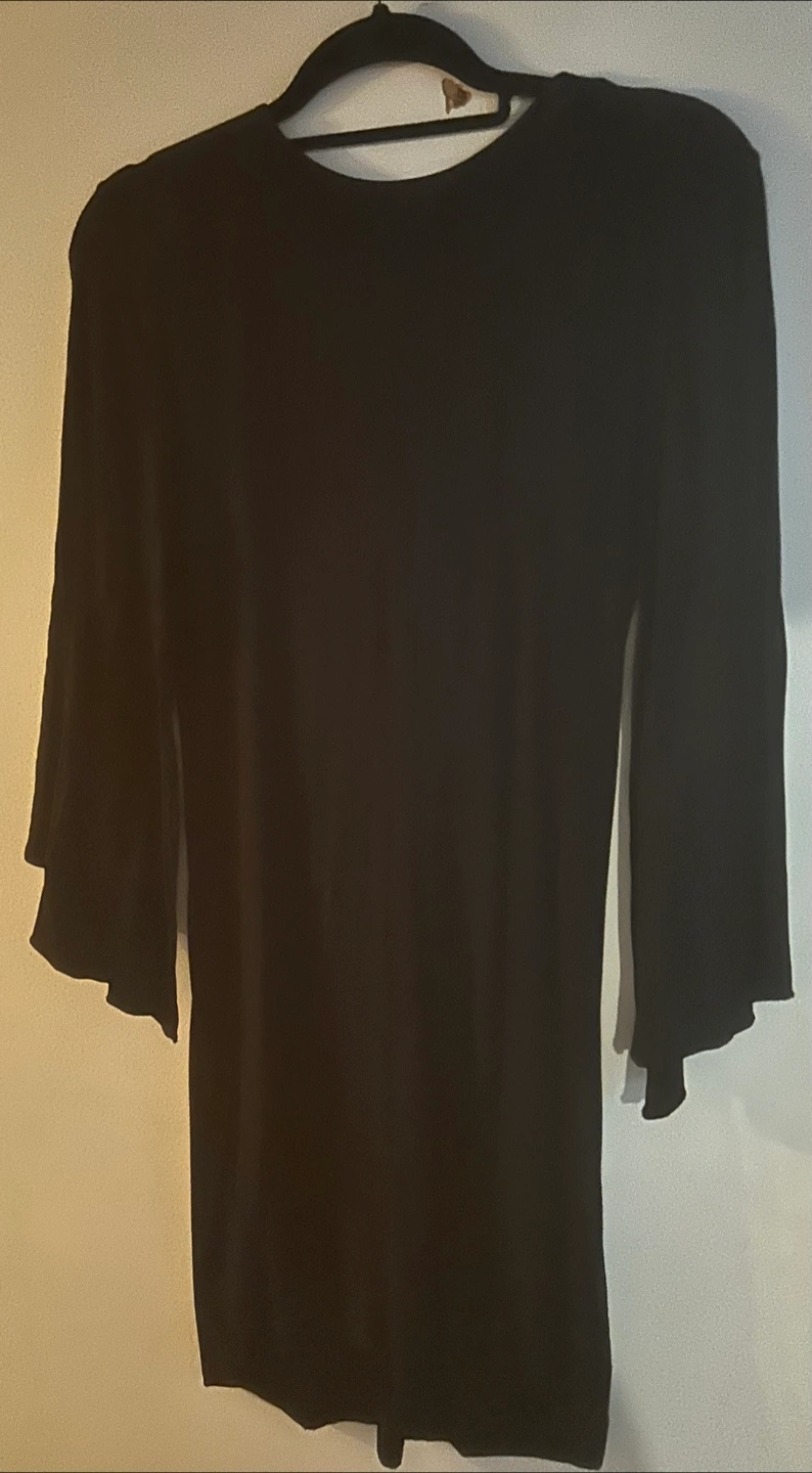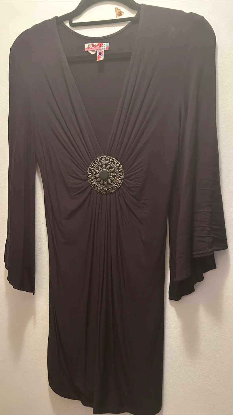 Stunning black Buffalo dress. Features a V-neckline, three-quarter bell sleeves, and an eye-catching ornate metallic embellishment at the centre. Soft, comfortable material. Perfect for a night out or a special occasion.