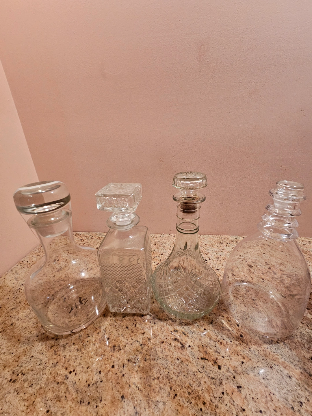 Four vintage glass decanters. Various shapes and sizes. Clear glass with etched designs. Perfect for barware or home decor.