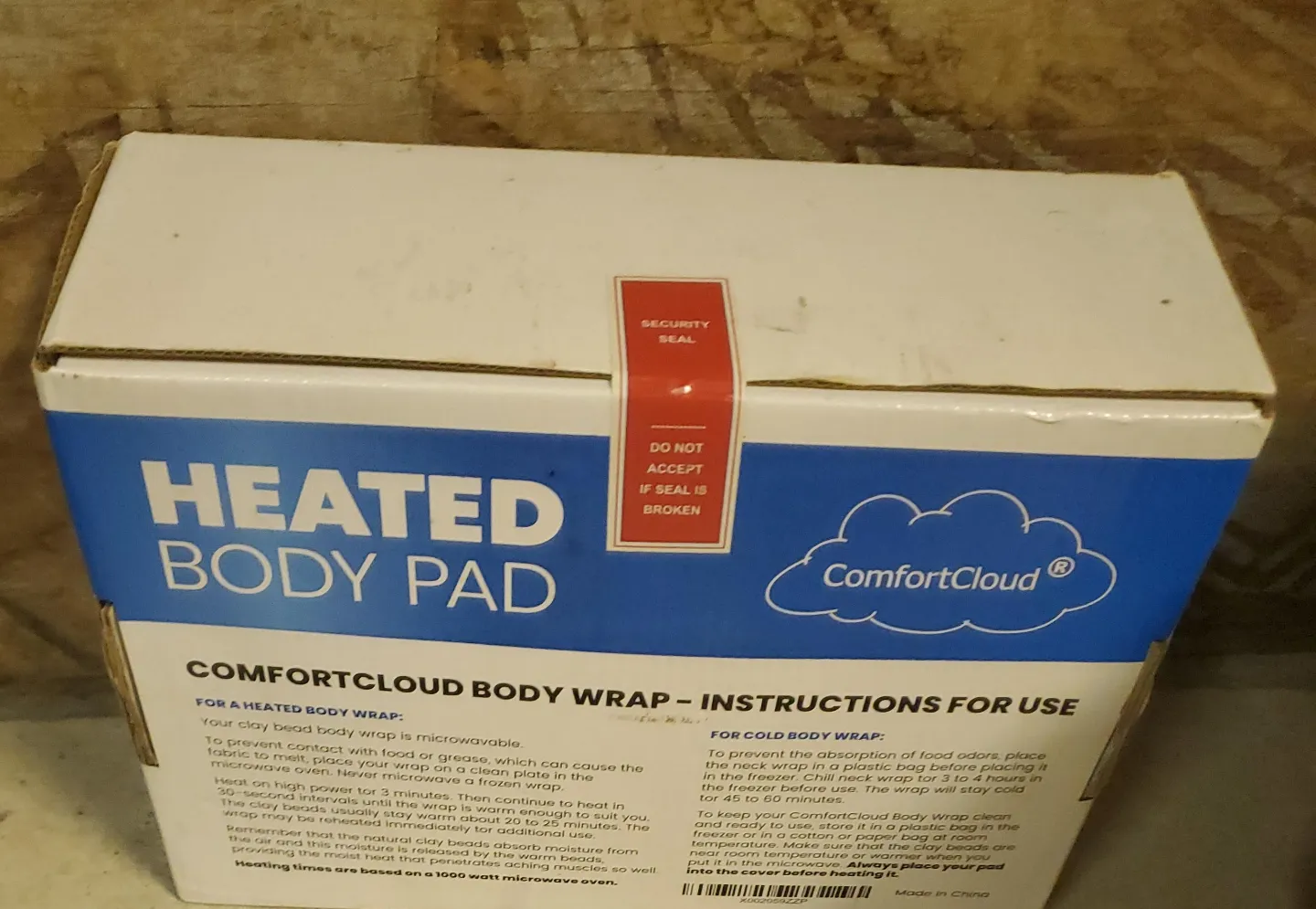 Microwavable clay bead body wrap. Heats in 30-second intervals. Reusable. Also usable as a cold compress. Instructions included.