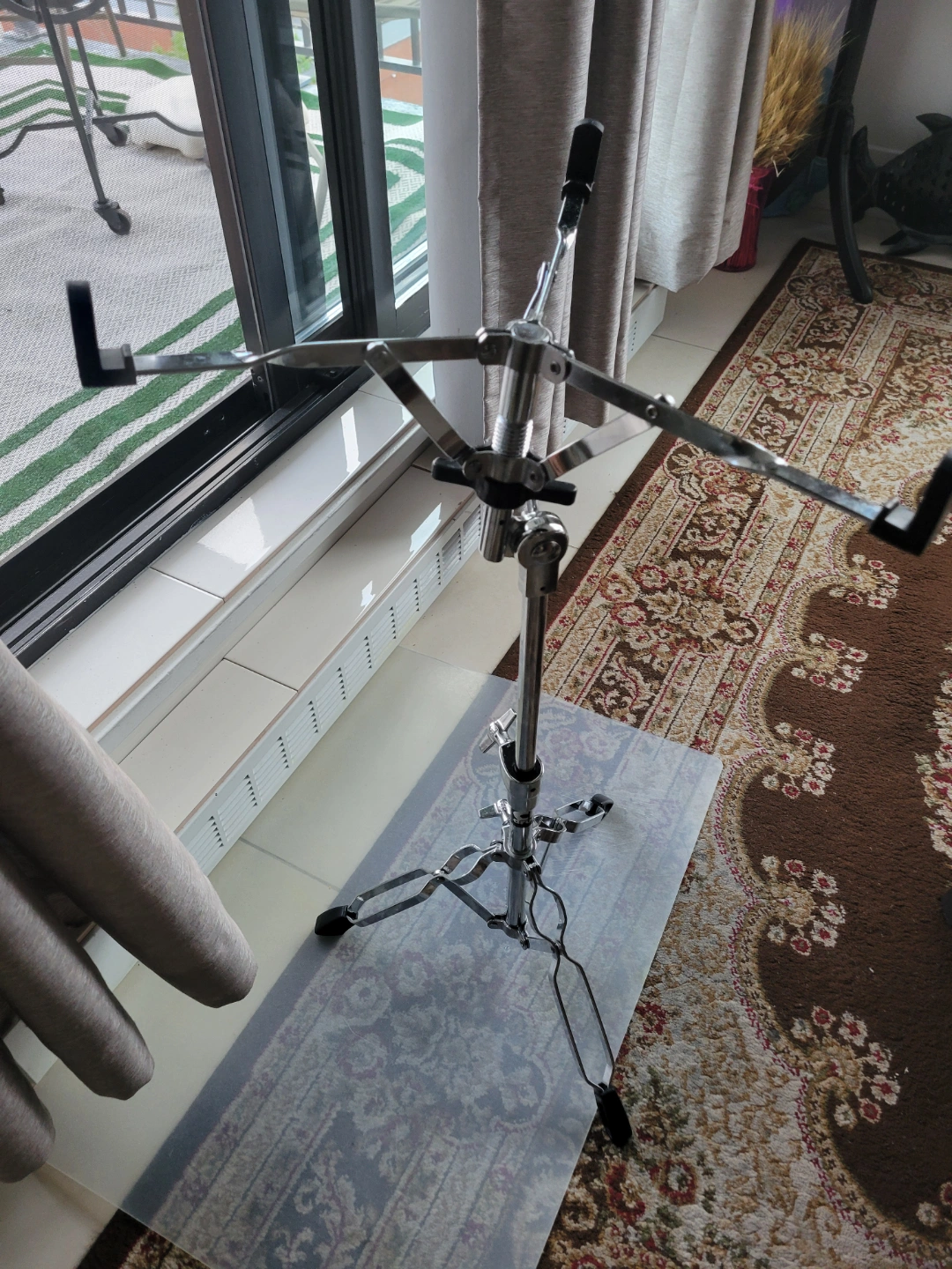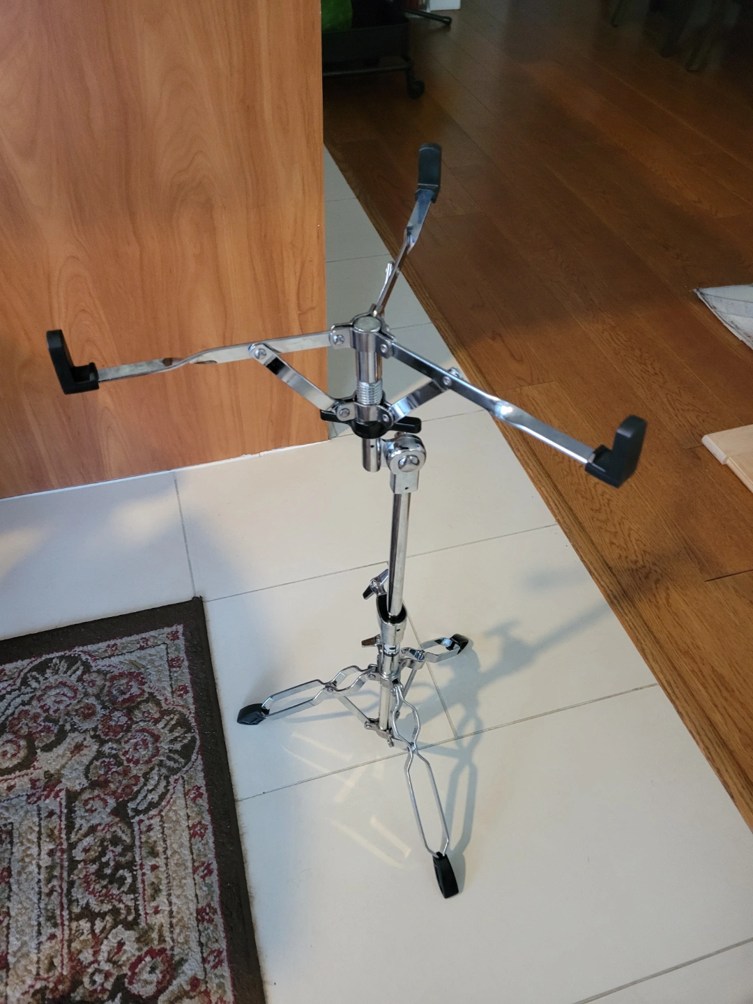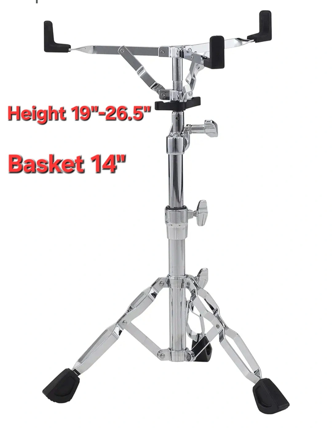 Chrome-plated metal stand. Height adjustable. Suitable for Drum and various percussion instruments. Features a four-arm basket.