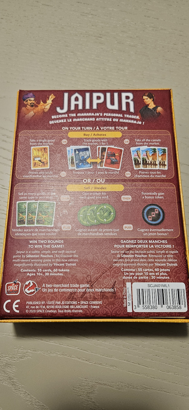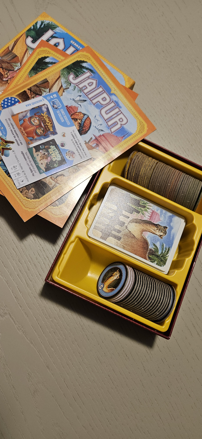 Jaipur board game. Complete with all components. Great condition. Suitable for ages 10+. 2 players. 30 minute playtime.