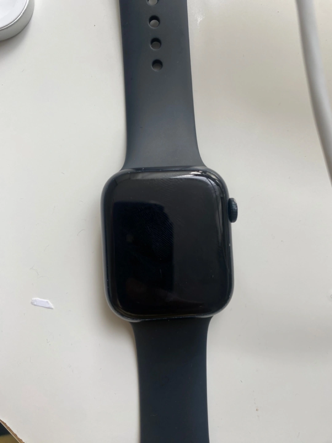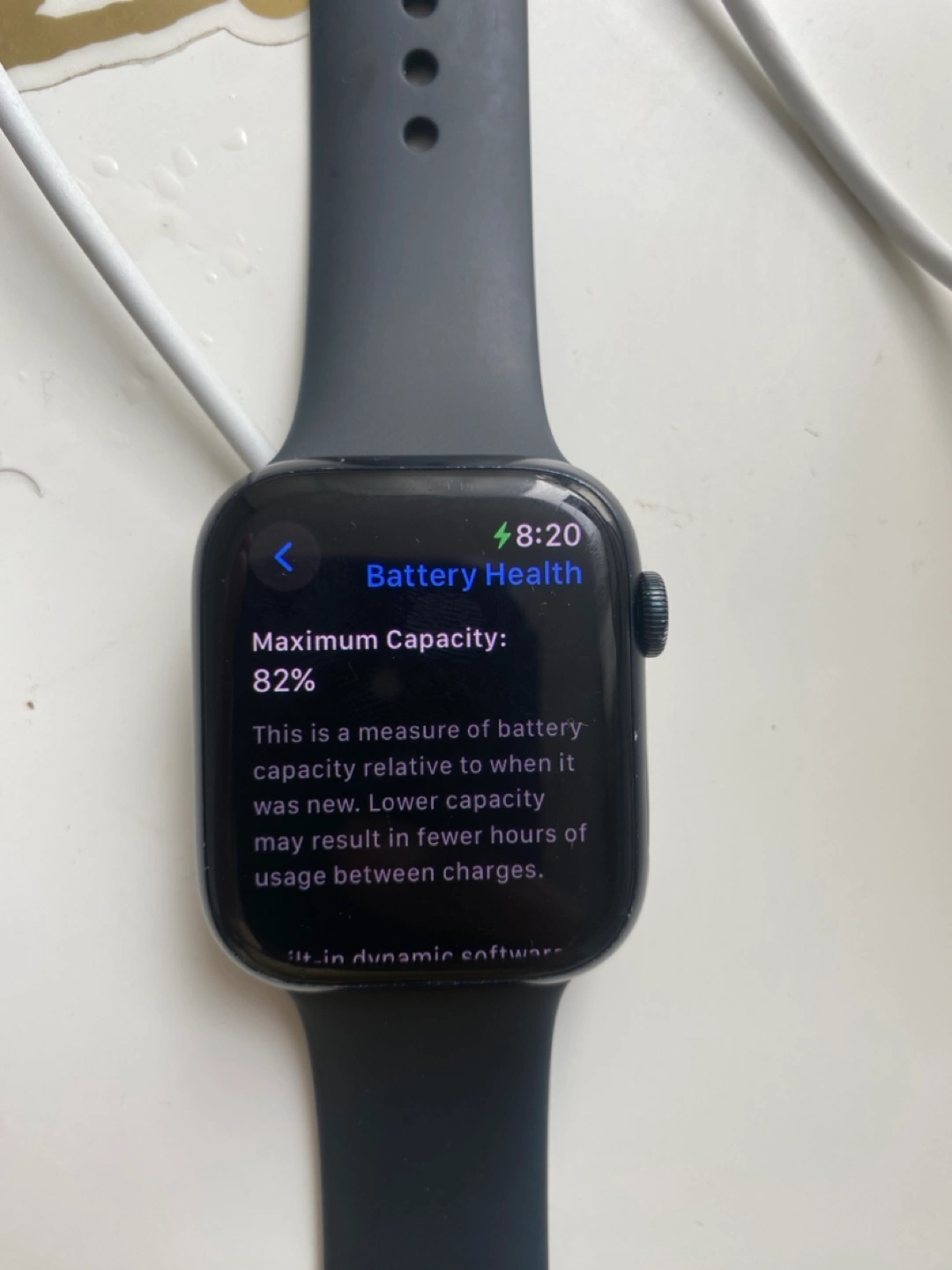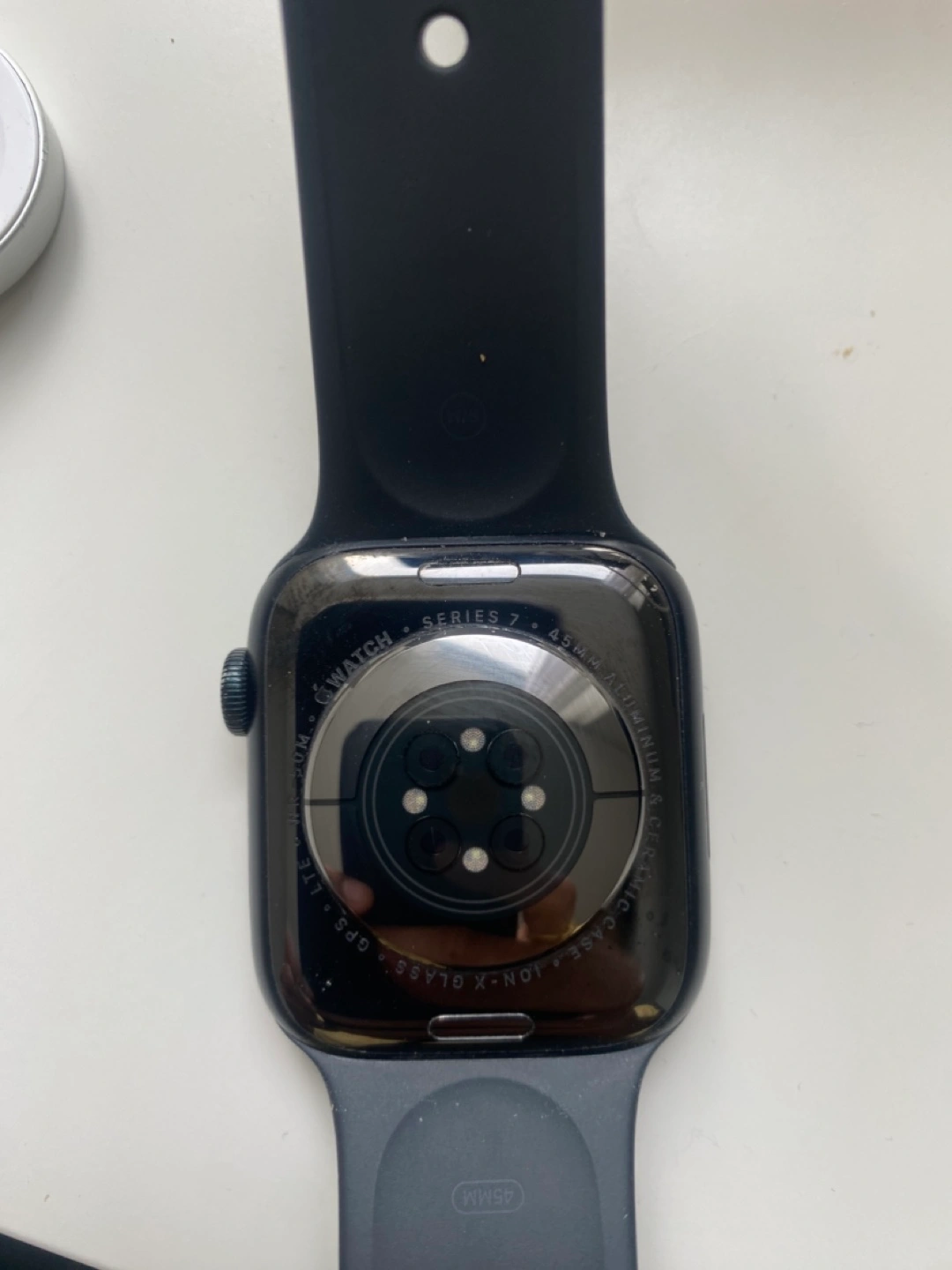 Apple Watch Series 7, 45mm. Black sport band. 82% battery health. Pre-owned. Good condition.