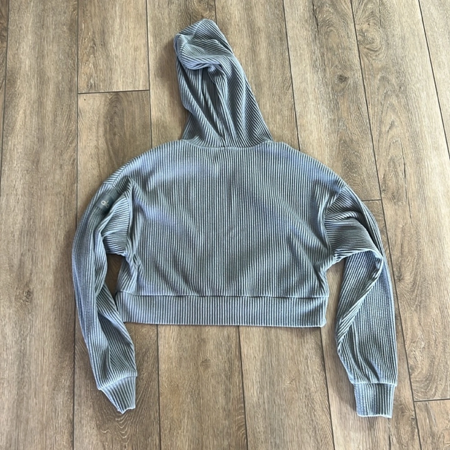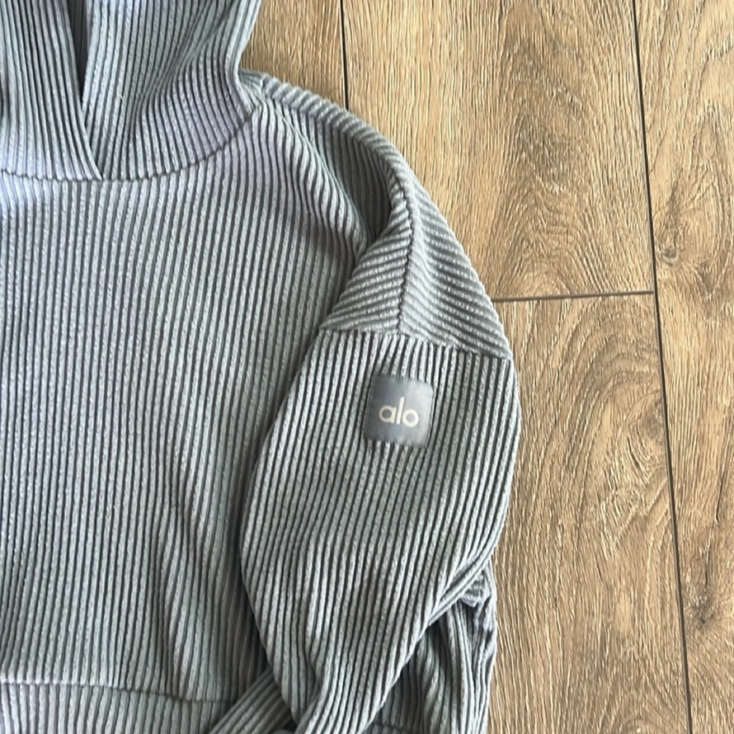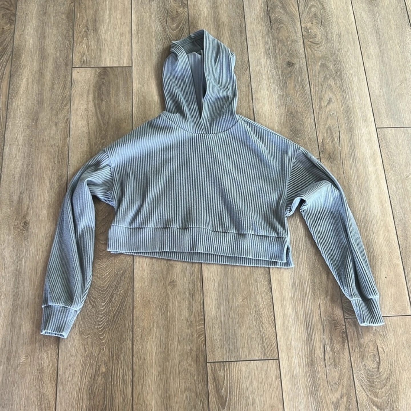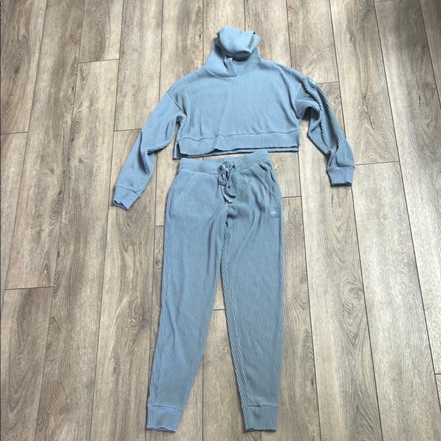 Unfortunately I can't remember the exact colour name. It's very similar to the current Steel Grey Heather but could also be Steel Blue. In some lighting it looks grey and in others it's blue, please refer to the pictures. Lightly worn, I have multiple colours and don’t really reach for this. Both pieces are size small and retail for $175 each plus tax ($395).